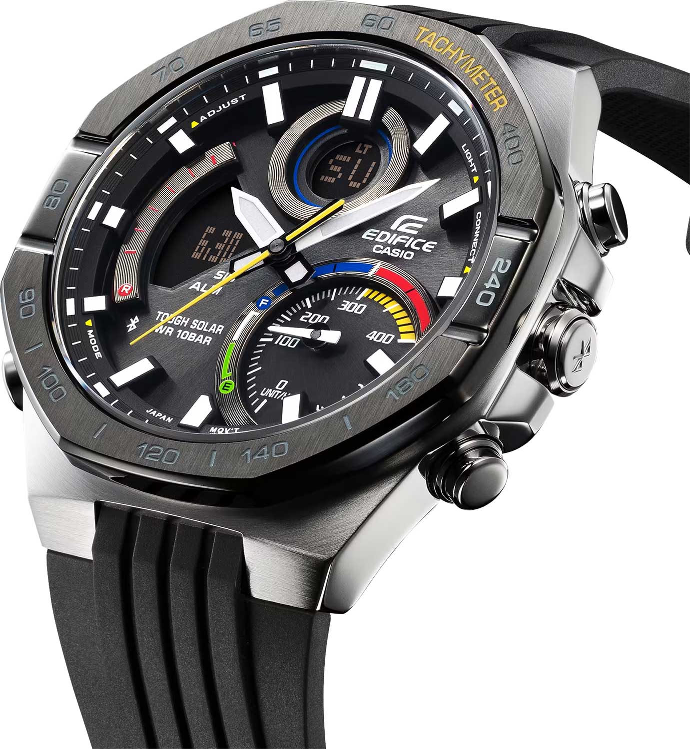 Японские мужские часы-хронографХронографФункция позволяет измерять отрезки времени с особой точностью: часы, минуты, секунды. Верным признаком хронографа является наличие на циферблате 3 дополнительных окошек-счётчиков. Casio Edifice ECB-950MP-1ADF. Tough SolarTough SolarТехнология основана на подзарядке аккумулятора от источника солнечного света, специальная панель улавливает солнечные лучи и преобразует их в энергию для работы часов. Достаточно пары минут нахождения на солнце для функционирования часов в течении суток., индикатор низкого заряда батареи. Функция автоматического сохранения энергии. Время работы аккумулятора без подзарядки приблизительно 6 месяцев, при включенной функции сохранения энергии приблизительно 19 месяцев. Двойная подсветка Super Illuminator с функцией Afterglow, одновременно подсвечивается аналоговый циферблат и цифровой дисплей. Люминесцентное покрытиеЛюминесцентное покрытиеПозволяет считывать показания времени в темноте. Производители наносят на стрелки, часовые индексы, безель или поверхность циферблата светонакопительный состав, дающий холодное свечение. Neobrite обеспечивает длительное послесвечение в темноте даже после кратковременного нахождения на свету. Таймер обратного отсчета от 1 сек до 24 ч. Мировое время – 39 городов (39 часовых поясов). Автоматический переход на зимнее и летнее время. Беспроводная технология BluetoothBluetoothСовременная технология, позволяющая синхронизировать часы с телефоном и переносить данные. Часы с Bluetooth расширяют возможности вашего смартфона и делают его использование ещё более удобным.. Приложение EDIFICE Connected позволяет вести журнал показаний секундомера и прохождения этапов, вычислять разность между заданным временем и временем этапа. Память на 200 этапов. Измерение скорости отображается на ретроградном циферблате в положении 4 часа. Функция перемещения стрелок для беспрепятственного просмотра информации на цифровых дисплеях, включения/отключения звука и поиска телефона. Заводная головка с защитой. Стальной корпус, защищенный минеральным стекломМинеральное стеклоМинеральное стекло представляет собой искусственно выращенный минерал кварца. Такое стекло отличается особой устойчивостью к повреждениям и царапинам. Уступает по некоторым качествам сапфировому стеклу.. Пластиковый браслет на стандартной застёжке. СекундомерСекундомерСекундоме́р — прибор, способный измерять интервалы времени с точностью до долей секунды.. Класс водозащиты: 100 метров, позволит плавать, нырять и заниматься другими водными видами спорта.