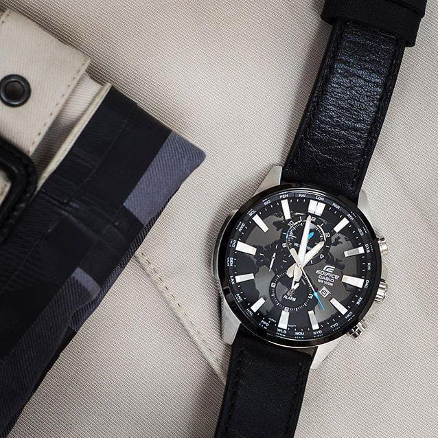 Часы CASIO EFR-303D-1A - мужские элегантные наручные часы из серии Casio Edifice. Круглый корпус, выполненный из стали, защищен минеральным стеклом, устойчивым к царапинам. Часы удерживаются на руке браслетом из высокопрочной стали с антикоррозийными свойствами. Многофункциональный кварцевый механизм, отображение второго часового пояса. Выступы на корпусе защищают переводную коронку. Люминисцентная подсветка стрелок и часовых меток.