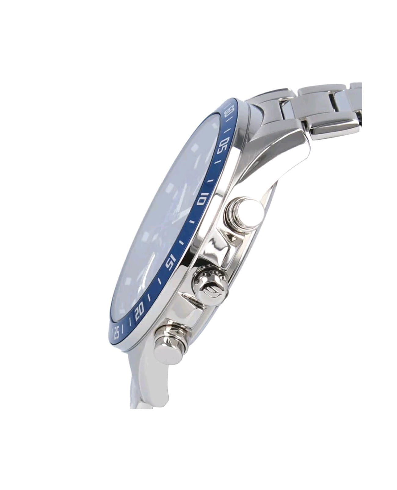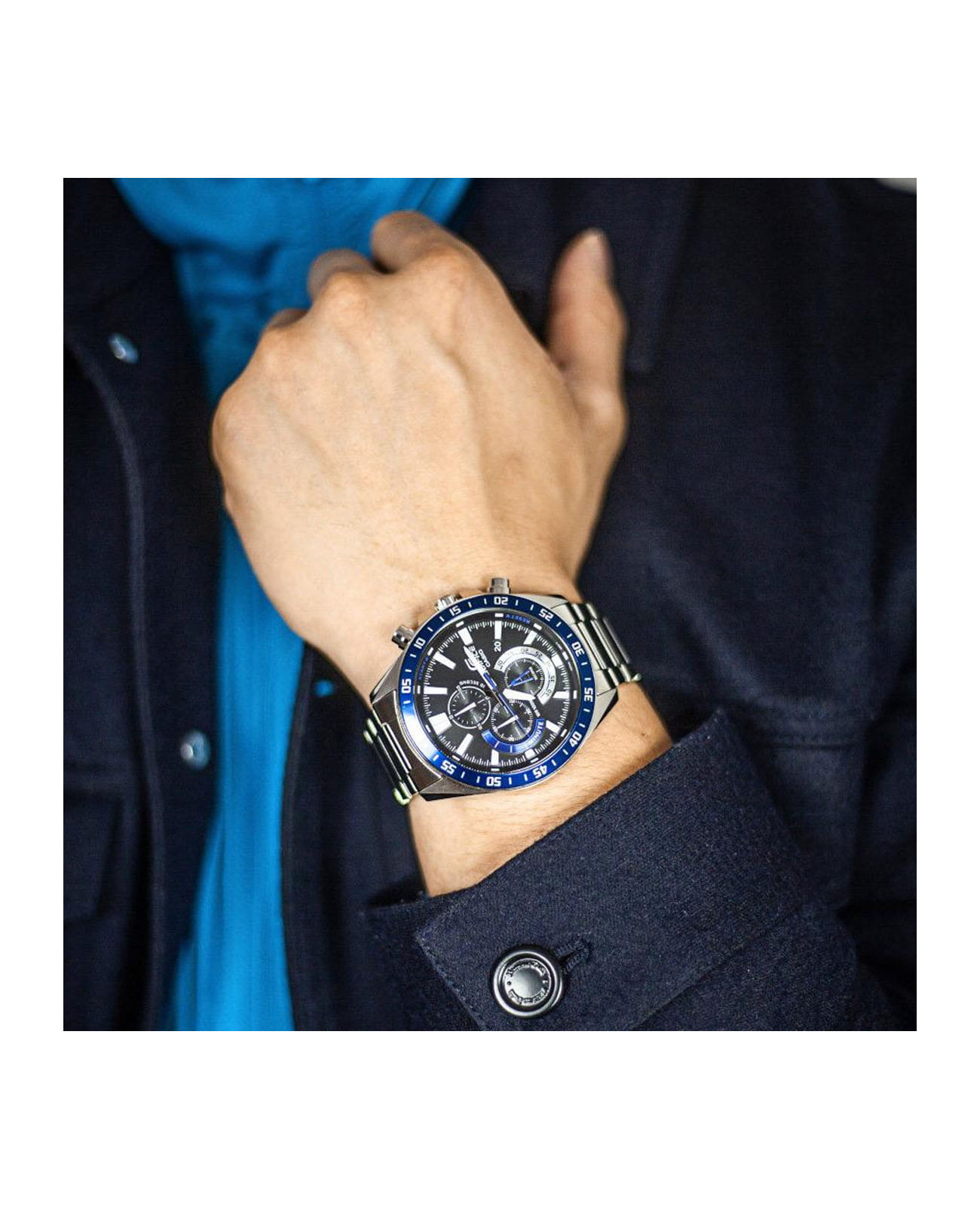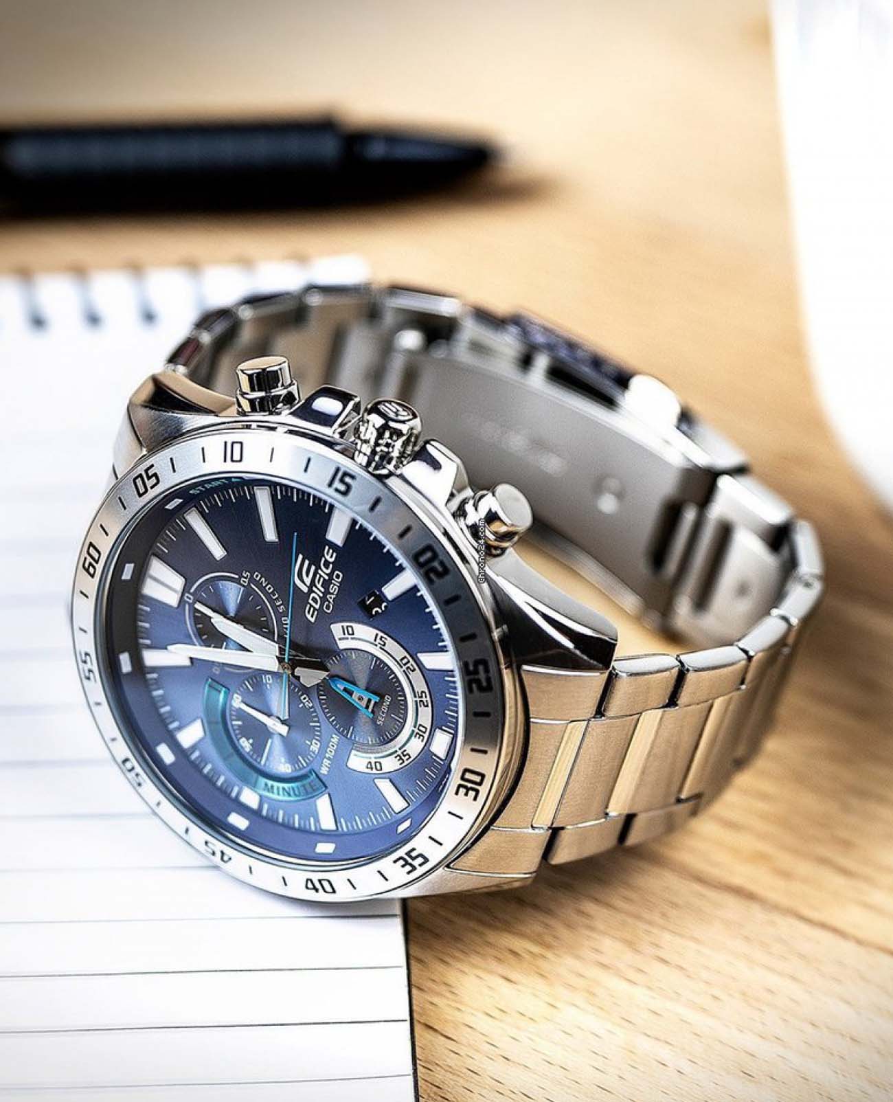 Японские мужские часы-хронографХронографФункция позволяет измерять отрезки времени с особой точностью: часы, минуты, секунды. Верным признаком хронографа является наличие на циферблате 3 дополнительных окошек-счётчиков. Casio Edifice EFV-620D-1A2V. Минеральное стеклоМинеральное стеклоМинеральное стекло представляет собой искусственно выращенный минерал кварца. Такое стекло отличается особой устойчивостью к повреждениям и царапинам. Уступает по некоторым качествам сапфировому стеклу. устойчивое к появлению царапин, обладающее высокой прозрачностью. Копрус часов изготовлен из нержавеющей стали. БезельБезельВнешний ободок, закрепляющий стекло. В спортивных часах так называется поворотное кольцо с делениями на циферблате, выполняет роль таймера – замеряет отрезки времени на шкале. Неподвижный безель – элемент декора. Однонаправленно вращающийся безель на дайверских часах позволяет фиксировать моменты погружения и выныривания на поверхность. из стали с IP-покрытиемIP-покрытиеМетод ионного напыления. Демонстрирует повышенную устойчивость к истиранию, окислению и химическим веществам. Под воздействием высокого давления и температуры около 1500°C молекулы металла надёжно соединяются с частицами корпуса часов.. Светодиодная автоподсветка NeobriteПодсветка NeobriteИспользование светонакопительных составов на основе сульфида цинка или алюмината стронция, яркий свет можно наблюдать на протяжении 6-10 часов после «зарядки» часов около источника света. - при повороте часов в сторону лица подсветка дисплея осуществляется автоматически. Настраиваемое послесвечение 1,5 или 3сек. Записная книжка на 30 ячеек памяти для записи имен и телефонных номеров, каждая запись может включать в себя текст из 8 букв и 16 цифр. СекундомерСекундомерСекундоме́р — прибор, способный измерять интервалы времени с точностью до долей секунды. с точностью измерения 1/100 секунды и измерением до 23 часов 59 минут 59,99 cек. ТаймерТаймерОтсчитывает секунды в обратном направлении в заданном интервале времени. обратного отсчета (диапазон времени 24 часа), автоматический календарь, 12/24 отображение времени. Мировое времяМировое время Полезное часовое усложнение, отображающее время в основных городах и известных областях по всему миру, оно связано с часовыми поясами, удобно для путешественников и бизнесменов. – 30 городов (29 часовых поясов). 5 будильниковБудильникБуди́льник — часы, в заданный момент времени подающие звуковой, световой и/или в редких случаях другой сигнал., один с функцией Snooze, ежечасный сигнал. Класс водозащиты: 100 метров, позволит плавать, нырять и заниматься другими водными видами спорта. Стальной браслет на раскладной застёжкеРаскладная застёжкаТакой тип застёжки используется только на браслетах из металла. Она никогда не раскрывается полностью, происходит разделение на 2 и более частей. Раскладывающая застёжка снизит вероятность потери часов к минимуму..
