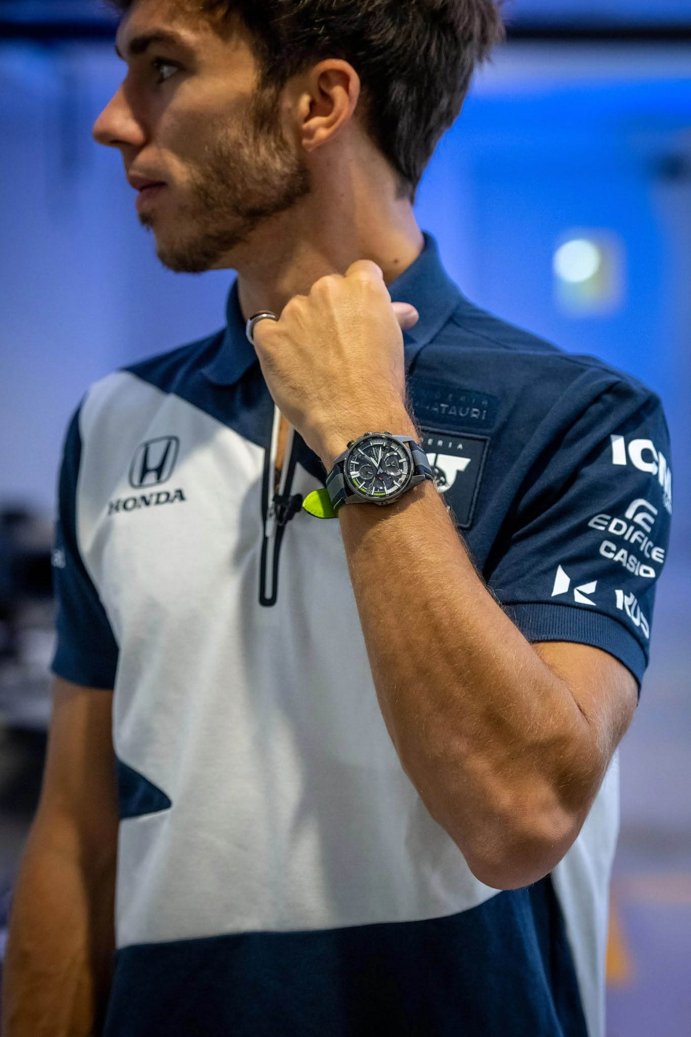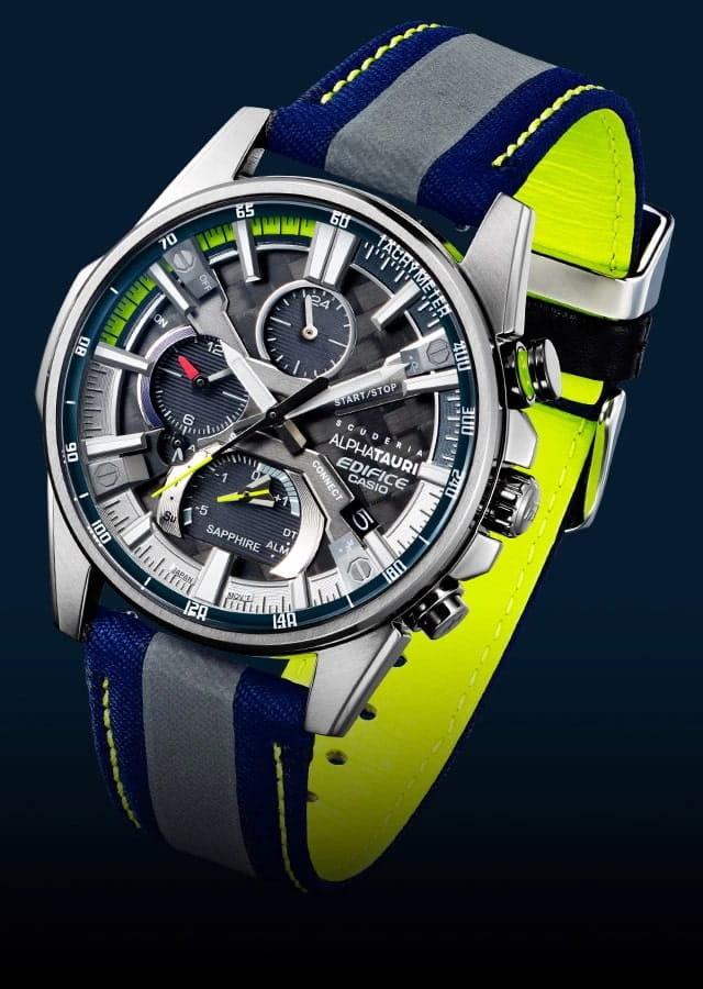 Флагманская модель в коллекции Edifice несомненно идеально будет смотреться на сильном мужском запястье. Часы Casio Edifice Scuderia Alpha Tauri EFS-S580AT-1AER из лимитированной серии, созданной в коллаборации с итальянской гоночной командой Формулы-1 Scuderia AlphaTauri. Внутренний корпус часов изготовлен из того же углеродного волокна 6K, что используется в аэродинамических крыльях гоночной машины Scuderia AlphaTauri. Элементы циферблата и секундная стрелка окрашены в флуоресцентный желтый цвет, который используется на трассах Формулы-1 для безопасности. Тканевый ремешок со светоотражающей полоской и классической застежкой. В комплекте сменный кожаный ремешок. Лимитированная серия. Часы созданы при сотрудничестве с гоночной командой Scuderia AlphaTauri Formula 1, которую поддерживает EDIFICE. Циферблат и застежка украшены логотипом команды. Карбон 6K используемый для изготовления циферблата точно такой же, который используется при создании болида команды Scuderia AlphaTauri. Флуоресцентный желтый цвет - цвет, который используется на гоночной трассе для безопасности, а последние 15 секунд подсвечиваются в соответствии с правилом F1, согласно которому члены экипажа должны покинуть сетку за 15 секунд до начала гонки. Питание от солнечной энергии Tough SolarTough SolarТехнология основана на подзарядке аккумулятора от источника солнечного света, специальная панель улавливает солнечные лучи и преобразует их в энергию для работы часов. Достаточно пары минут нахождения на солнце для функционирования часов в течении суток. - солнечные батарейки большой мощности, индикатор низкого заряда батареи. Время работы аккумулятора без подзарядки до 5 месяцев, при включенной функции сохранения энергии до 19 месяцев. Подсветка NeobriteПодсветка NeobriteИспользование светонакопительных составов на основе сульфида цинка или алюмината стронция, яркий свет можно наблюдать на протяжении 6-10 часов после «зарядки» часов около источника света. обеспечивает длительное послесвечение в темноте даже после кратковременного нахождения на свету. Часы-хронографХронографФункция позволяет измерять отрезки времени с особой точностью: часы, минуты, секунды. Верным признаком хронографа является наличие на циферблате 3 дополнительных окошек-счётчиков. с секундомеромСекундомерСекундоме́р — прибор, способный измерять интервалы времени с точностью до долей секунды. и тахиметромТахиметрРазмеченная шкала, располагается на ободке или безеле часов. Тахиметр позволяет рассчитать скорость на определённом участке пути, расстояние измеряется в километрах или милях.. СекундомерСекундомерСекундоме́р — прибор, способный измерять интервалы времени с точностью до долей секунды. с точностью показаний 1/1000с и временем измерения 24ч. Память на 200 кругов. 12-ти и 24-х часовой формат времени. Второй часовой поясВторой часовой поясФункция, позволяющая отображать время двух часовых поясов одновременно. и мировое времяМировое время Полезное часовое усложнение, отображающее время в основных городах и известных областях по всему миру, оно связано с часовыми поясами, удобно для путешественников и бизнесменов. , одновременное отображение текущего времени и времени в другом часовом поясе. Беспроводная технология BluetoothBluetoothСовременная технология, позволяющая синхронизировать часы с телефоном и переносить данные. Часы с Bluetooth расширяют возможности 