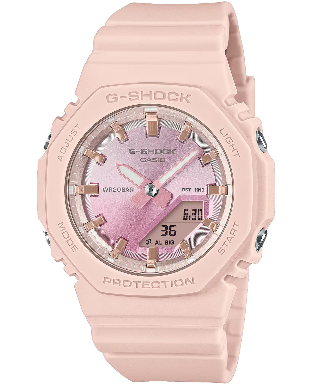 Женские кварцевые часы Casio G-Shock GMA-P2100SG-4A. Корпус часов изготовлен из пластика. Стрелки с люминесцентным покрытиемЛюминесцентное покрытиеПозволяет считывать показания времени в темноте. Производители наносят на стрелки, часовые индексы, безель или поверхность циферблата светонакопительный состав, дающий холодное свечение.. Водозащита: 200 метров, позволит плавать, нырять и заниматься другими водными видами спорта. Минеральное стеклоМинеральное стеклоМинеральное стекло представляет собой искусственно выращенный минерал кварца. Такое стекло отличается особой устойчивостью к повреждениям и царапинам. Уступает по некоторым качествам сапфировому стеклу. устойчивое к появлению царапин, обладающее высокой прозрачностью.