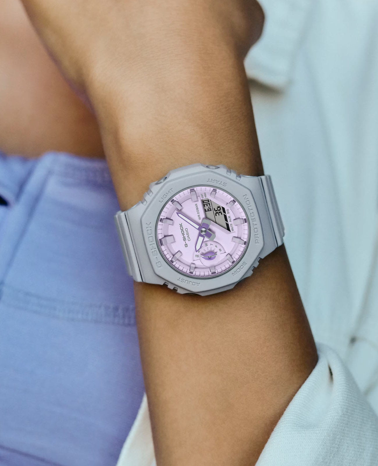 Японские женские часы Casio G-Shock GMA-S2100NC-8AER из коллекции G-Shock. Окунитесь в целебный комфорт природы с настоящим G-SHOCK в цветах, вдохновленных флорой, и с ботаническим дизайном. Основные компоненты изготовлены из биопластика, полученных из возобновляемых органических ресурсов. Ожидается, что этот материал поможет снизить выбросы CO2 и иным образом снизить воздействие на окружающую среду. Минеральное стеклоМинеральное стеклоМинеральное стекло представляет собой искусственно выращенный минерал кварца. Такое стекло отличается особой устойчивостью к повреждениям и царапинам. Уступает по некоторым качествам сапфировому стеклу. устойчивое к появлению царапин, обладающее высокой прозрачностью. Ударопрочный корпусУдаропрочный корпусМеханизм заключён в корпус, выполненный из современных материалов, устойчивых к ударам, механическим повреждениям и падению с высоты: инновационный пластик, карбон, нержавеющая сталь, титан. защищает механизм от ударов и вибрации. Светодиодная подсветкаСветодиодная подсветкаСветодиодная или LED-подсветка обеспечивает появление яркого холодного свечения за счёт LED-элементов - маленьких лампочек. Они потребляют минимальное количество энергии, чаще всего можно встретить 1 светодиод, в нижней части циферблата., настраиваемое послесвечение 1,5 или 3сек. Мировое время Мировое время Полезное часовое усложнение, отображающее время в основных городах и известных областях по всему миру, оно связано с часовыми поясами, удобно для путешественников и бизнесменов. 31 часовой пояс (48 городов + всемирное координированное время UTCUTCВсемирное кординационное время, не имеющее привязки к географическому положению Гринвича, основывается на атомном отсчёте времени. Регулировка времени осуществляется более точно, чем устаревшее GMT.