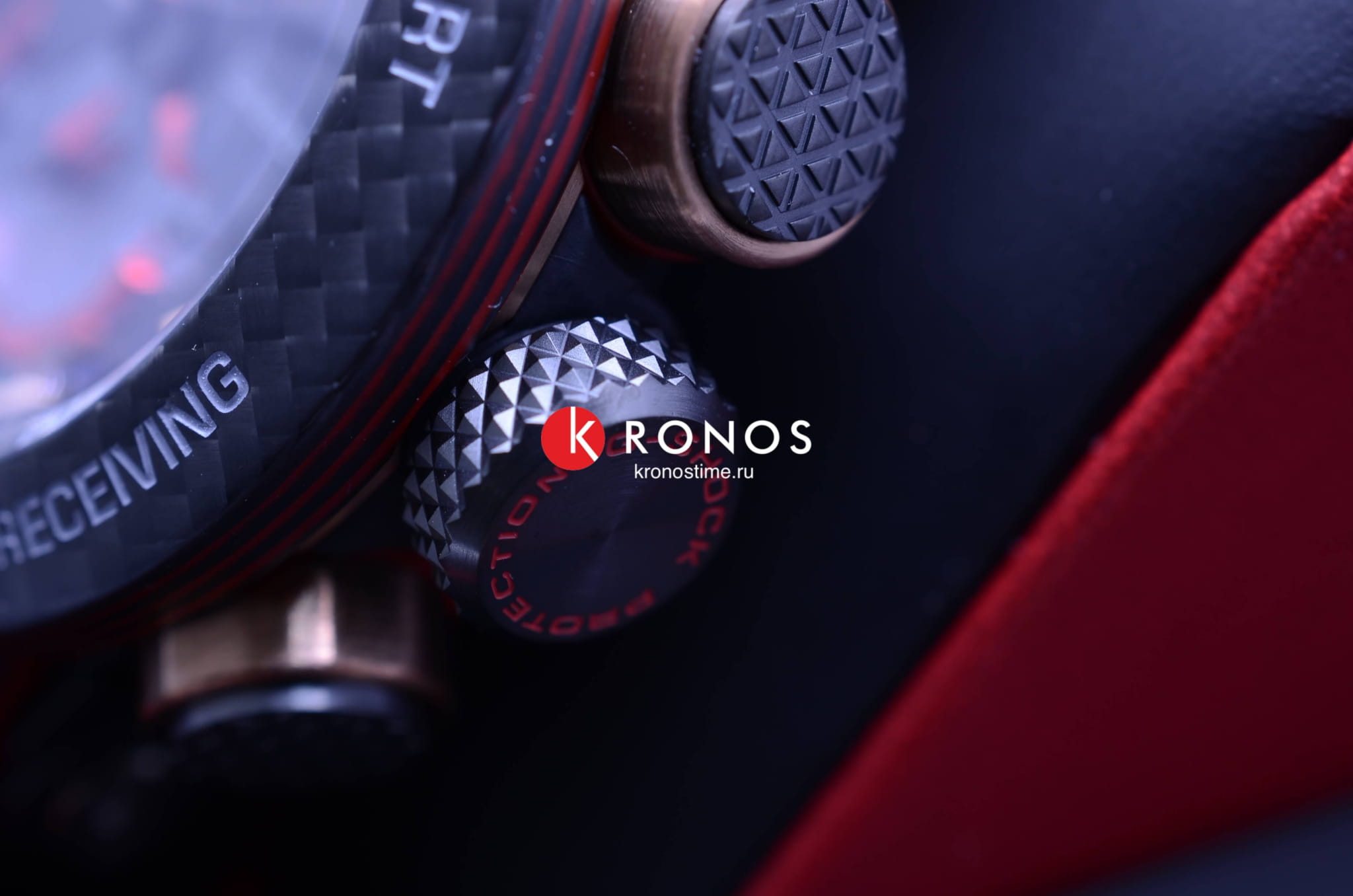 Внушительный аксессуар стильно смотрится на широком запястье, гармонично смотрятся крупные детали в красном и бронзовом цвете. Задняя крышка здесь отсутствует, ударопрочный корпусУдаропрочный корпусМеханизм заключён в корпус, выполненный из современных материалов, устойчивых к ударам, механическим повреждениям и падению с высоты: инновационный пластик, карбон, нержавеющая сталь, титан. сделан из монолитного углеродного монокока, вдохновлённого конструкцией ранних самолётов. Он состоит из 52 карбоновых слоёв, уникальная текстура просматривается на боковых частях безеляБезельВнешний ободок, закрепляющий стекло. В спортивных часах так называется поворотное кольцо с делениями на циферблате, выполняет роль таймера – замеряет отрезки времени на шкале. Неподвижный безель – элемент декора. Однонаправленно вращающийся безель на дайверских часах позволяет фиксировать моменты погружения и выныривания на поверхность. – с успехом реализована технология Carbon Core GuardCarbon Core Guard Новейшая структура корпуса, разработанная Casio. Полиуретановая пластина дополнительно усилена карбоновыми вставками, что придаёт специальную защиту от механических повреждений. Карбон отличается лёгкостью и прочностью.. Полимерный ремешок тоже имеет усиление карбоновыми волокнами. Наручные часы обладают полезным функционалом: BluetoothBluetoothСовременная технология, позволяющая синхронизировать часы с телефоном и переносить данные. Часы с Bluetooth расширяют возможности вашего смартфона и делают его использование ещё более удобным., будильник, мировое времяМировое время Полезное часовое усложнение, отображающее время в основных городах и известных областях по всему миру, оно связано с часовыми поясами, удобно для путешественников и бизнесменов. , таймер, приём радиосигнала, питание от солнечной батареи . Сапфировое стекло с антибликовой обработкой. Яркая люминесцентная подсветкаЛюминесцентное покрытиеПозволяет считывать показания времени в темноте. Производители наносят на стрелки, часовые индексы, безель или поверхность циферблата светонакопительный состав, дающий холодное свечение.. Габариты: 50,1 x 46,4 x 16,9 мм.