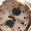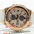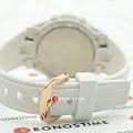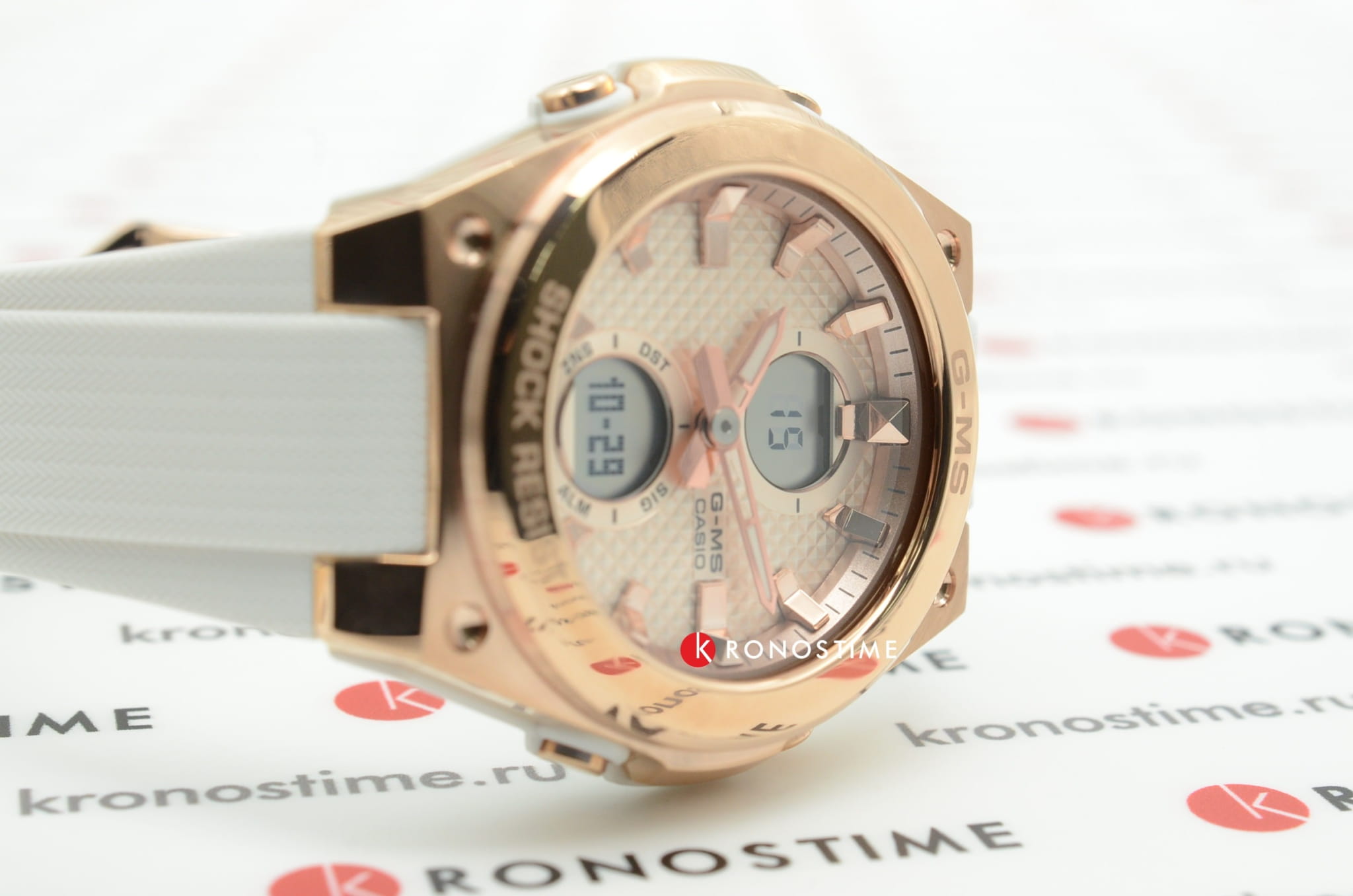Аксессуар с белым фактурным циферблатом наделён противоударным корпусомУдаропрочный корпусМеханизм заключён в корпус, выполненный из современных материалов, устойчивых к ударам, механическим повреждениям и падению с высоты: инновационный пластик, карбон, нержавеющая сталь, титан. из полимерного пластика. Для усиления устойчивости к ударам безельБезельВнешний ободок, закрепляющий стекло. В спортивных часах так называется поворотное кольцо с делениями на циферблате, выполняет роль таймера – замеряет отрезки времени на шкале. Неподвижный безель – элемент декора. Однонаправленно вращающийся безель на дайверских часах позволяет фиксировать моменты погружения и выныривания на поверхность. сделан из хирургической стали 316L. IP-покрытиеIP-покрытиеМетод ионного напыления. Демонстрирует повышенную устойчивость к истиранию, окислению и химическим веществам. Под воздействием высокого давления и температуры около 1500°C молекулы металла надёжно соединяются с частицами корпуса часов. цвета розового золота защищает от царапин. Японский кварцевый механизм. Полимерный ремешок с узорчатой поверхностью. Минеральное стекло с закалкой. Водозащита до 10 бар. ЛюминесцентнаяЛюминесцентное покрытиеПозволяет считывать показания времени в темноте. Производители наносят на стрелки, часовые индексы, безель или поверхность циферблата светонакопительный состав, дающий холодное свечение. и светодиодная подсветкаСветодиодная подсветкаСветодиодная или LED-подсветка обеспечивает появление яркого холодного свечения за счёт LED-элементов - маленьких лампочек. Они потребляют минимальное количество энергии, чаще всего можно встретить 1 светодиод, в нижней части циферблата.. Будильник, таймер, секундомер с точностью в 1/100 секунды, хронографХронографФункция позволяет измерять отрезки времени с особой точностью: часы, минуты, секунды. Верным признаком хронографа является наличие на циферблате 3 дополнительных окошек-счётчиков., ежечасный сигнал, мировое времяМировое время Полезное часовое усложнение, отображающее время в основных городах и известных областях по всему миру, оно связано с часовыми поясами, удобно для путешественников и бизнесменов. . Габариты: 45,1 x 40,3 x 12,4 мм.