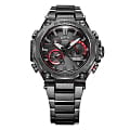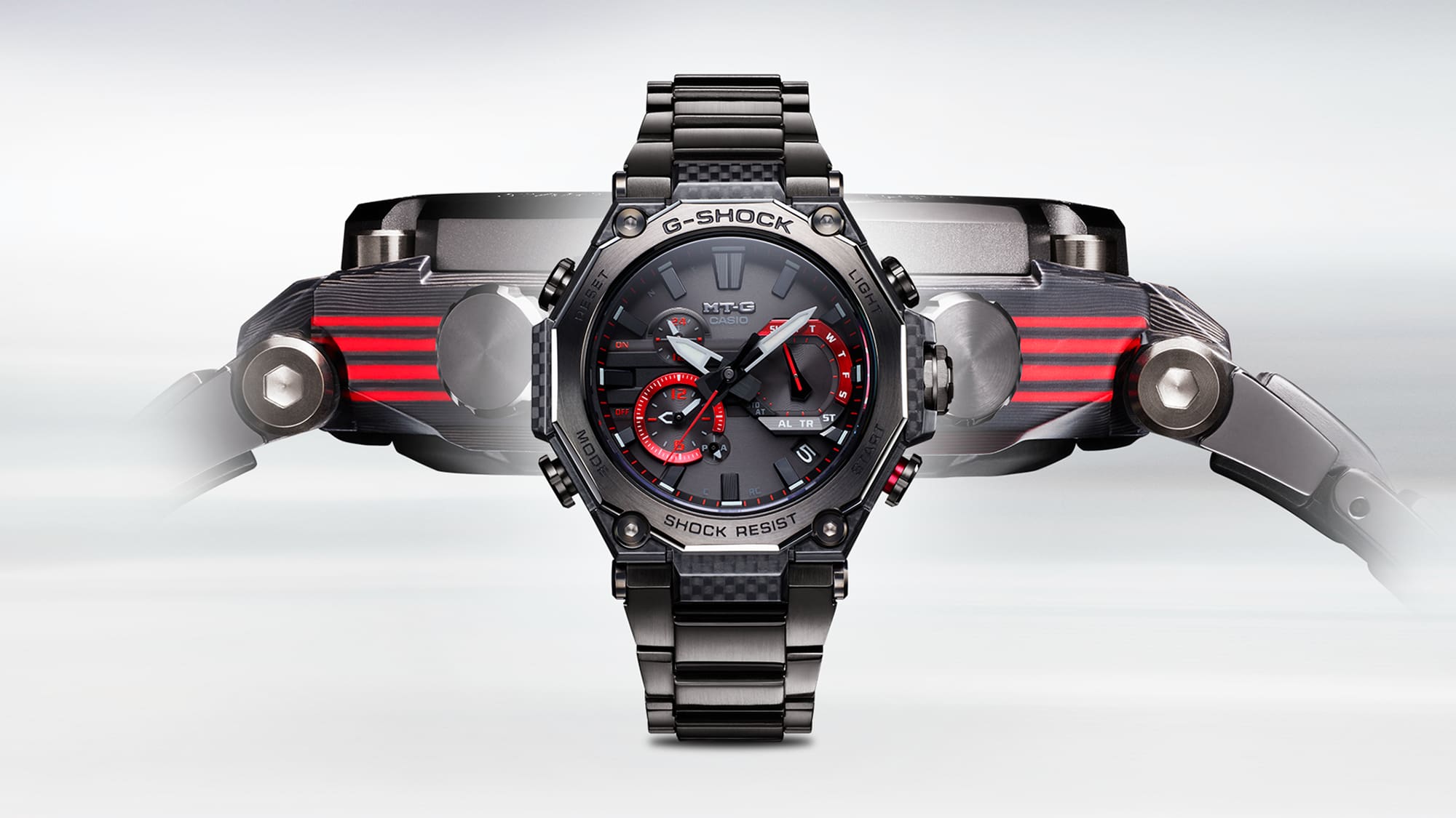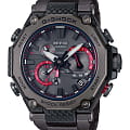 Новое поколение премиальной стальной серии G-Shock MTG в черном карбоново-стальном корпусе с красными деталями циферблата.