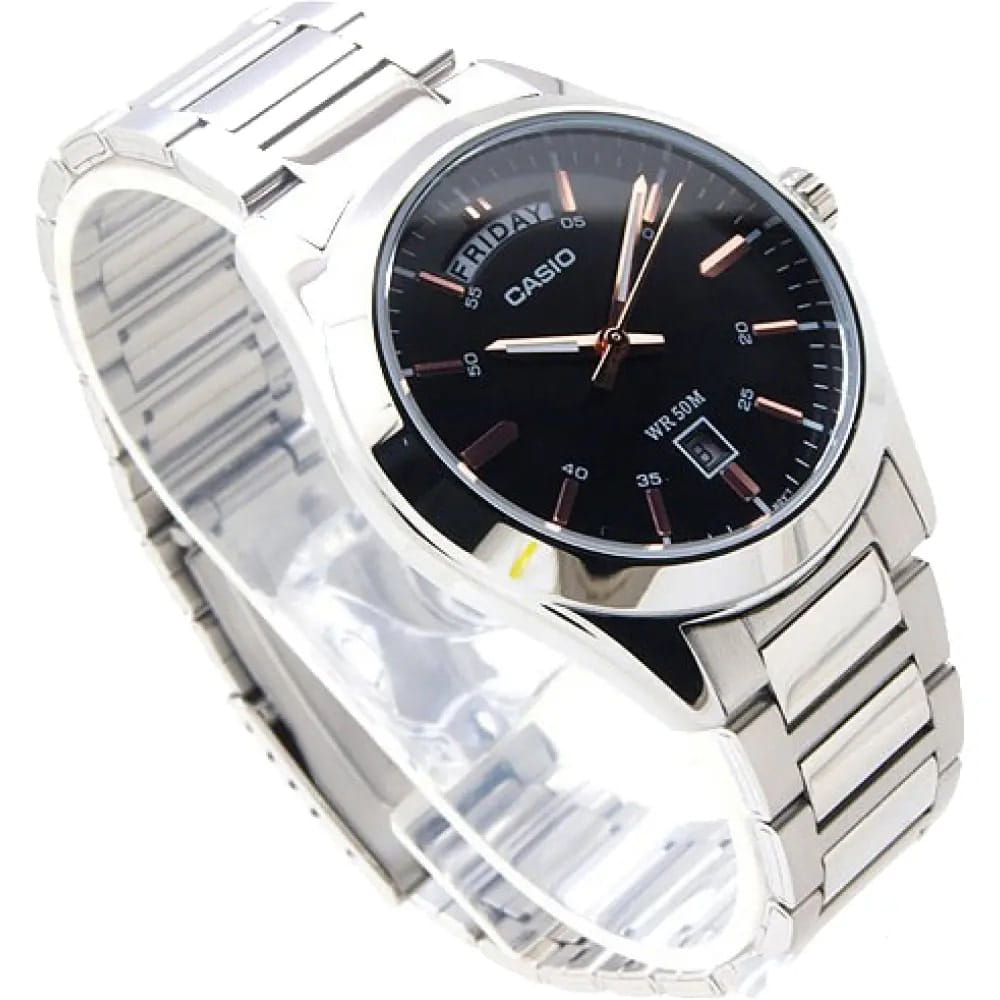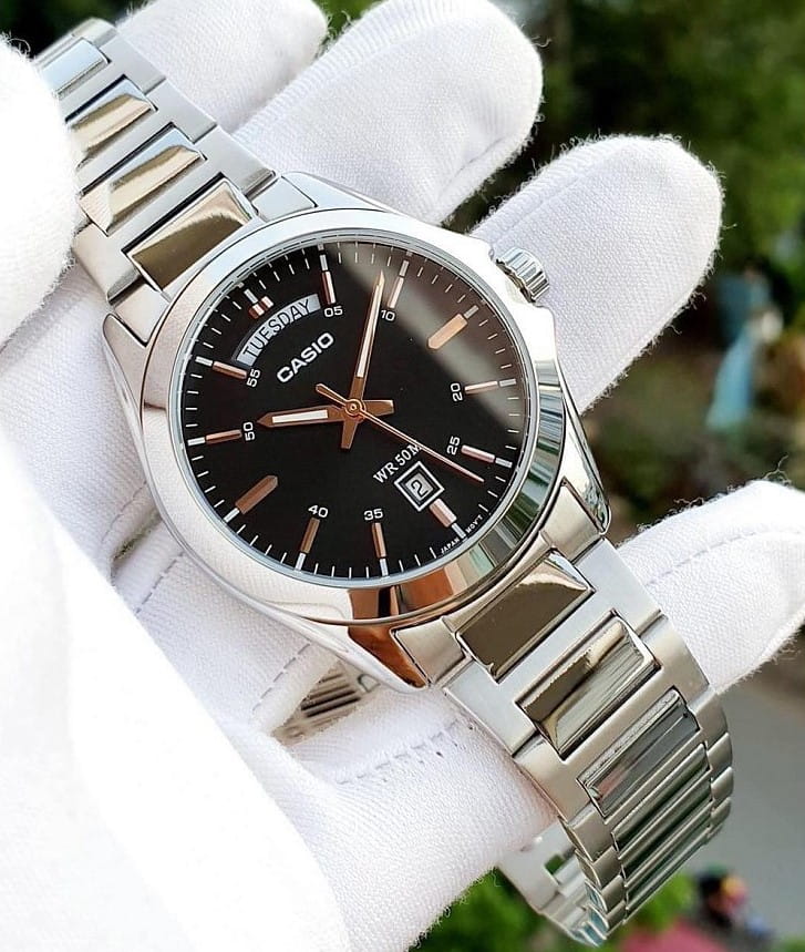 Японские мужские наручные часы с минеральным стекломМинеральное стеклоМинеральное стекло представляет собой искусственно выращенный минерал кварца. Такое стекло отличается особой устойчивостью к повреждениям и царапинам. Уступает по некоторым качествам сапфировому стеклу. Casio MTP-1370D-1A2, кварцевый механизм с высокой точностью. Класс водозащиты: 50 метров, позволит защитить корпус от случайных брызг или капель дождя. Корпус часов изготовлен из латуни. Стальной браслет на раскладной застёжке. Окошко даты находится в положении 6 часов. Заводная головка с защитой. Стрелки с люминесцентным покрытиемЛюминесцентное покрытиеПозволяет считывать показания времени в темноте. Производители наносят на стрелки, часовые индексы, безель или поверхность циферблата светонакопительный состав, дающий холодное свечение..