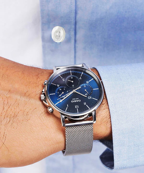 Японские мужские часы с минеральным стекломМинеральное стеклоМинеральное стекло представляет собой искусственно выращенный минерал кварца. Такое стекло отличается особой устойчивостью к повреждениям и царапинам. Уступает по некоторым качествам сапфировому стеклу. Casio Collection MTP-E321M-2A с элегантным дизайном будут прекрасно смотреться на запястье стильного мужчины. 12-ти и 24-х часовой формат времени, число и день недели вынесены на отдельные циферблаты. Метки в виде штрихов и арабских цифр. Заводная головка с защитой. Браслет с раскладной застёжкойРаскладная застёжкаТакой тип застёжки используется только на браслетах из металла. Она никогда не раскрывается полностью, происходит разделение на 2 и более частей. Раскладывающая застёжка снизит вероятность потери часов к минимуму.. Батарея рассчитана на 3 года. Ремешок с классической застежкой.