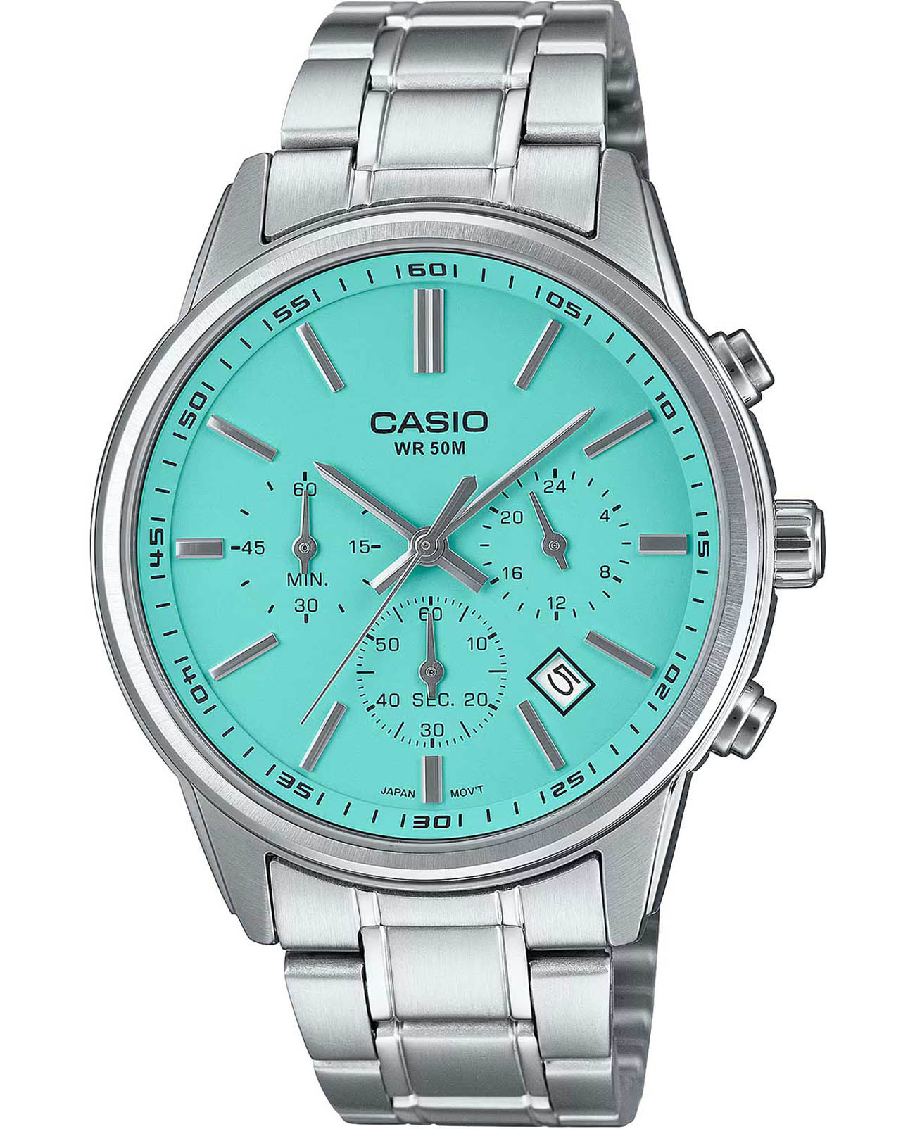 Японские мужские наручные часы с минеральным стекломМинеральное стеклоМинеральное стекло представляет собой искусственно выращенный минерал кварца. Такое стекло отличается особой устойчивостью к повреждениям и царапинам. Уступает по некоторым качествам сапфировому стеклу. Casio Collection MTP-E515D-2A2, кварцевый механизм с высокой точностью. Класс водозащиты: 50 метров, позволит защитить корпус от случайных брызг или капель дождя. Корпус часов изготовлен из стали. Часы-хронографХронографФункция позволяет измерять отрезки времени с особой точностью: часы, минуты, секунды. Верным признаком хронографа является наличие на циферблате 3 дополнительных окошек-счётчиков. с секундомеромСекундомерСекундоме́р — прибор, способный измерять интервалы времени с точностью до долей секунды. точностью 1сек и временем измерения 30мин. 12-ти и 24-х часовой формат времени. Метки в виде штрихов. Стальной браслет на раскладной застёжкеРаскладная застёжкаТакой тип застёжки используется только на браслетах из металла. Она никогда не раскрывается полностью, происходит разделение на 2 и более частей. Раскладывающая застёжка снизит вероятность потери часов к минимуму..