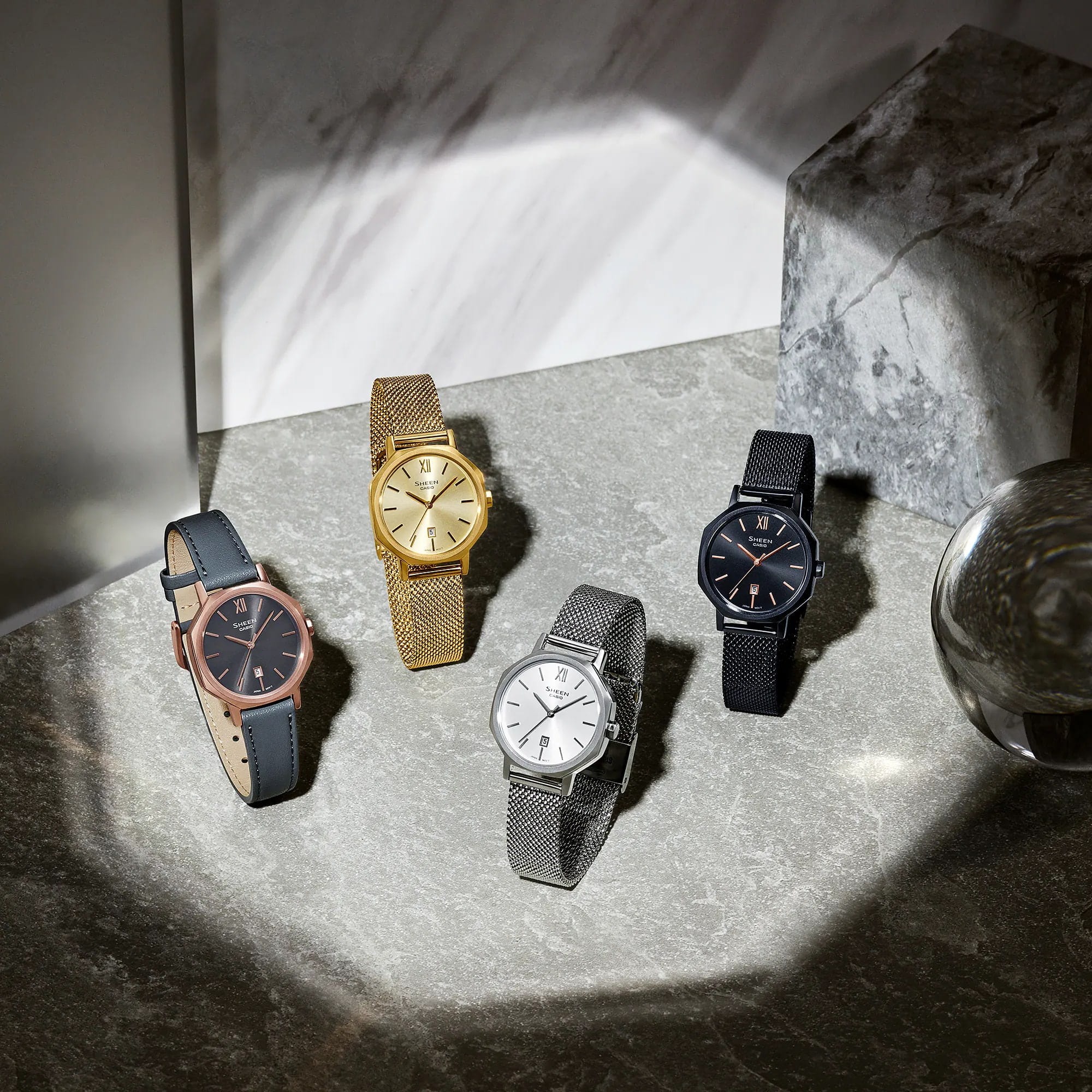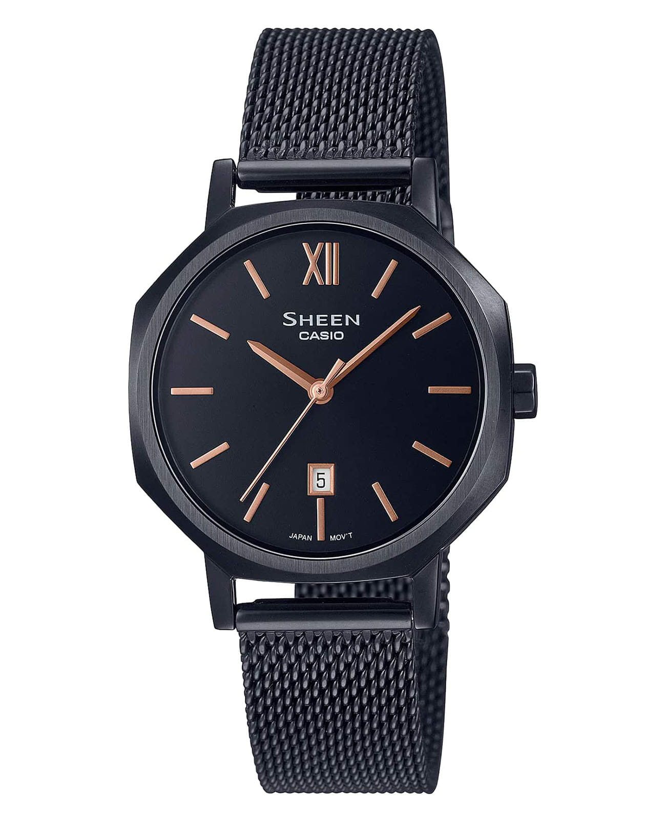 Женские японские часы Casio Sheen SHE-4554BM-1A, кварцевый механизм с высокой точностью. Класс водозащиты: 50 метров, позволит защитить корпус от случайных брызг или капель дождя. Сапфировое стеклоСапфировое стеклоПрочный и надёжный материал из кристалла сапфира синтетического происхождения, характеризующийся особой твёрдостью и устойчивостью к царапинам и повреждениям., защищающее от царапин. Круглый стальной корпус изготовлен из нержавеющей стали c IP покрытиемIP-покрытиеМетод ионного напыления. Демонстрирует повышенную устойчивость к истиранию, окислению и химическим веществам. Под воздействием высокого давления и температуры около 1500°C молекулы металла надёжно соединяются с частицами корпуса часов.. Апертура даты расположена на отметке 6 часов. Стальной миланский браслет c IP покрытиемIP-покрытиеМетод ионного напыления. Демонстрирует повышенную устойчивость к истиранию, окислению и химическим веществам. Под воздействием высокого давления и температуры около 1500°C молекулы металла надёжно соединяются с частицами корпуса часов. имеет раскладную застежкуРаскладная застёжкаТакой тип застёжки используется только на браслетах из металла. Она никогда не раскрывается полностью, происходит разделение на 2 и более частей. Раскладывающая застёжка снизит вероятность потери часов к минимуму.