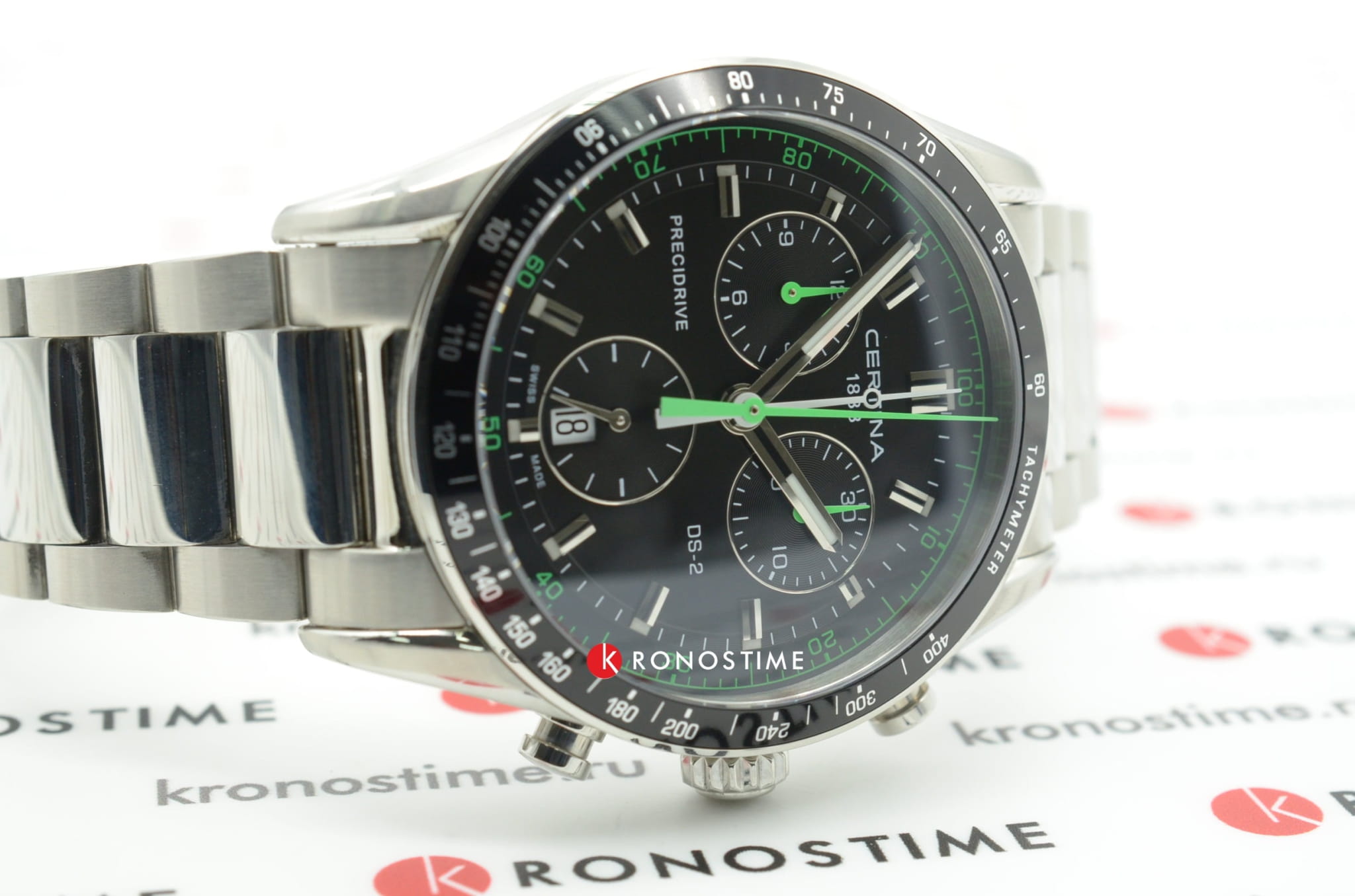 Брендовый аксессуар сразу притягивает внимание. Чёрный циферблат, дополненный зелёными элементами и функциональными окошками, отражает спортивную динамичность. Алюминиевый безельБезельВнешний ободок, закрепляющий стекло. В спортивных часах так называется поворотное кольцо с делениями на циферблате, выполняет роль таймера – замеряет отрезки времени на шкале. Неподвижный безель – элемент декора. Однонаправленно вращающийся безель на дайверских часах позволяет фиксировать моменты погружения и выныривания на поверхность. размечен шкалой тахиметраТахиметрРазмеченная шкала, располагается на ободке или безеле часов. Тахиметр позволяет рассчитать скорость на определённом участке пути, расстояние измеряется в километрах или милях.. Часы основаны на концепции Double SecurityDS ConceptDouble Security Concept, обозначает двойную надёжность и безупречную точность часов Certina. Двойная система защиты подразумевает обеспечение максимальной устойчивости к ударам и высоких показателей водонепроницаемости., что свидетельствует о высокой устойчивости к ударам и водонепроницаемости (до 10 бар) модели. Швейцарский кварцевый калибр ETA 251.264 Precidrive™Precidrive™Инновационный кварцевый механизм Certina. Часы, оснащённые этим швейцарским калибром, приравниваются к точности к сертифицированным хронометрам, точность хода составляет +/-10 секунд в год., измеряющий время с точностьюдо одной сотой секунды. Двухстороннее антибликовое покрытие для стекла из сапфира. Корпус и браслет из стали 316L с антикоррозионными свойствами. Задняя крышка с фирменной гравировкой. ХронографХронографФункция позволяет измерять отрезки времени с особой точностью: часы, минуты, секунды. Верным признаком хронографа является наличие на циферблате 3 дополнительных окошек-счётчиков., календарь, индикатор EOLEOLПредставляет собой систему, уведомляющую владельца часов о необходимости замены элемента питания. За 2 недели до полного разряда батарейки секундная стрелка перестаёт ходить чётко и начинает перепрыгивать на 3-4 деления., секундомер. Диаметр корпуса: 41 мм.
