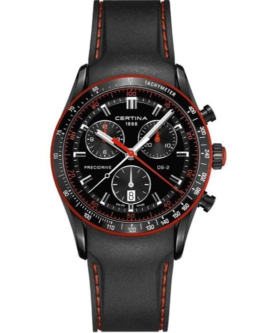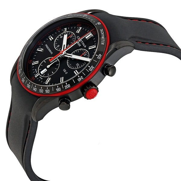 Аксессуар с красными деталями оснащён усложнениями: тахиметрТахиметрРазмеченная шкала, располагается на ободке или безеле часов. Тахиметр позволяет рассчитать скорость на определённом участке пути, расстояние измеряется в километрах или милях., секундомер, календарь, хронографХронографФункция позволяет измерять отрезки времени с особой точностью: часы, минуты, секунды. Верным признаком хронографа является наличие на циферблате 3 дополнительных окошек-счётчиков.. За высокую точность хода отвечает швейцарский кварцевый калибр ETA 251.264 Precidrive™Precidrive™Инновационный кварцевый механизм Certina. Часы, оснащённые этим швейцарским калибром, приравниваются к точности к сертифицированным хронометрам, точность хода составляет +/-10 секунд в год.. Часы основаны на концепции Двойной Надёжности DS ConceptDS ConceptDouble Security Concept, обозначает двойную надёжность и безупречную точность часов Certina. Двойная система защиты подразумевает обеспечение максимальной устойчивости к ударам и высоких показателей водонепроницаемости..