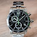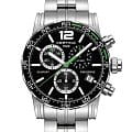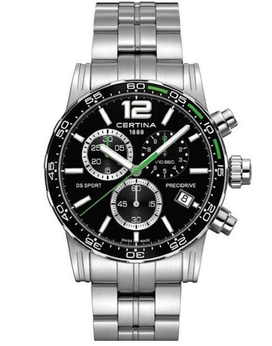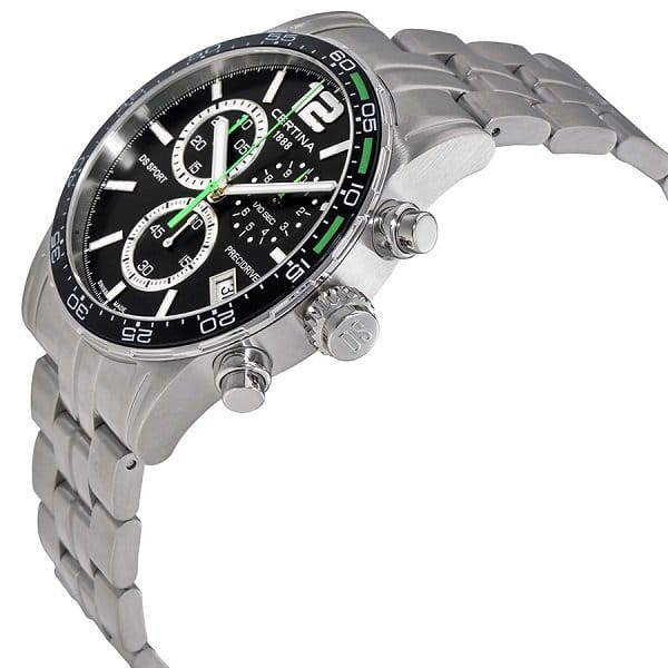 Модель гармонично соединяет в себе лаконичную элегантность и спортивную составляющую. Чёрный циферблат с зелёными акцентами имеет крупные элементы, обеспечивающими оптимальную читаемость показаний времени. Часы устойчивы к высоким нагрузкам благодаря концепции DS ConceptDS ConceptDouble Security Concept, обозначает двойную надёжность и безупречную точность часов Certina. Двойная система защиты подразумевает обеспечение максимальной устойчивости к ударам и высоких показателей водонепроницаемости., дополнительной неуязвимости способствуют сапфировое стекло, заводная головка с защитным уплотнением и нержавеющая сталь в качестве основного материала. Швейцарский кварцевый механизм ETA G10.212 AA Precidrive™Precidrive™Инновационный кварцевый механизм Certina. Часы, оснащённые этим швейцарским калибром, приравниваются к точности к сертифицированным хронометрам, точность хода составляет +/-10 секунд в год.. Водостойкость 100 метров. Задняя крышка с гравировкой. Алюминиевый безельБезельВнешний ободок, закрепляющий стекло. В спортивных часах так называется поворотное кольцо с делениями на циферблате, выполняет роль таймера – замеряет отрезки времени на шкале. Неподвижный безель – элемент декора. Однонаправленно вращающийся безель на дайверских часах позволяет фиксировать моменты погружения и выныривания на поверхность.. Люминесцентная подсветкаЛюминесцентное покрытиеПозволяет считывать показания времени в темноте. Производители наносят на стрелки, часовые индексы, безель или поверхность циферблата светонакопительный состав, дающий холодное свечение. стрелок. . Измерение десятых долей секунд в режиме реального времени, хронографХронографФункция позволяет измерять отрезки времени с особой точностью: часы, минуты, секунды. Верным признаком хронографа является наличие на циферблате 3 дополнительных окошек-счётчиков., отображение числа, индикатор , EOLEOLПредставляет собой систему, уведомляющую владельца часов о необходимости замены элемента питания. За 2 недели до полного разряда батарейки секундная стрелка перестаёт ходить чётко и начинает перепрыгивать на 3-4 деления.. Диаметр корпуса: 42 мм.