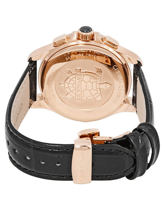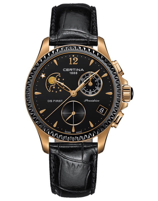 Женские швейцарские часы Certina DS First Lady Chronograph Moon Phase C030.250.36.056.00 из коллекции DS First привлекают эксклюзивным дизайном. Окошко в положении 10 часов отображает лунные фазы, стильно смотрится бриллиантовая звезда. Кварцевый швейцарский механизм G10.962 Precidrive™. Керамический безель с гранёным краем. Чёрный кожаный ремешок. EOL, календарь, хронограф. Производство и сборка: Швейцария.