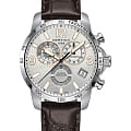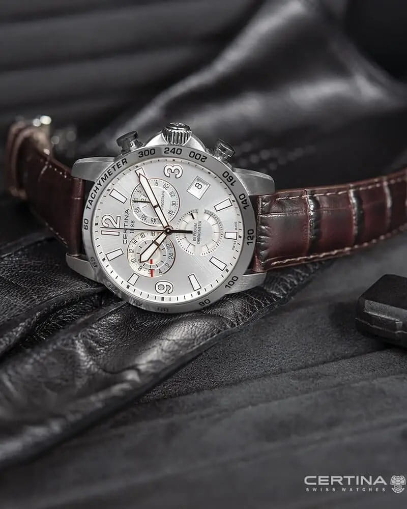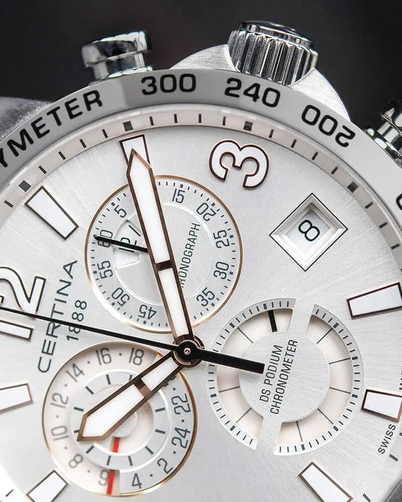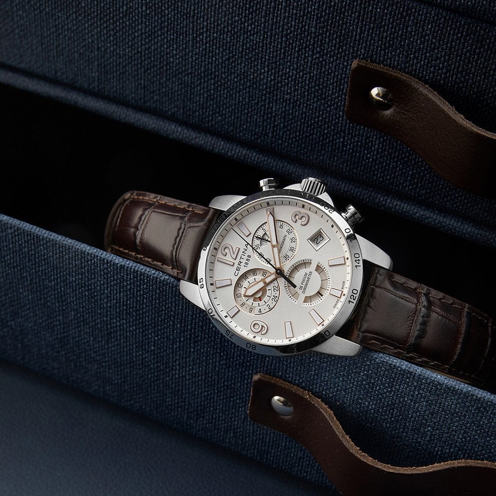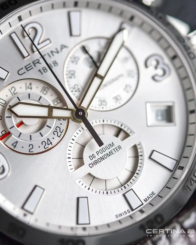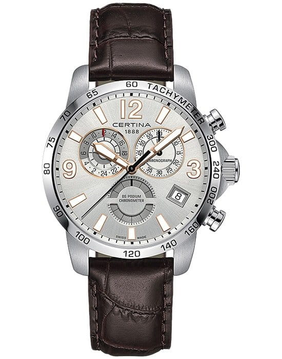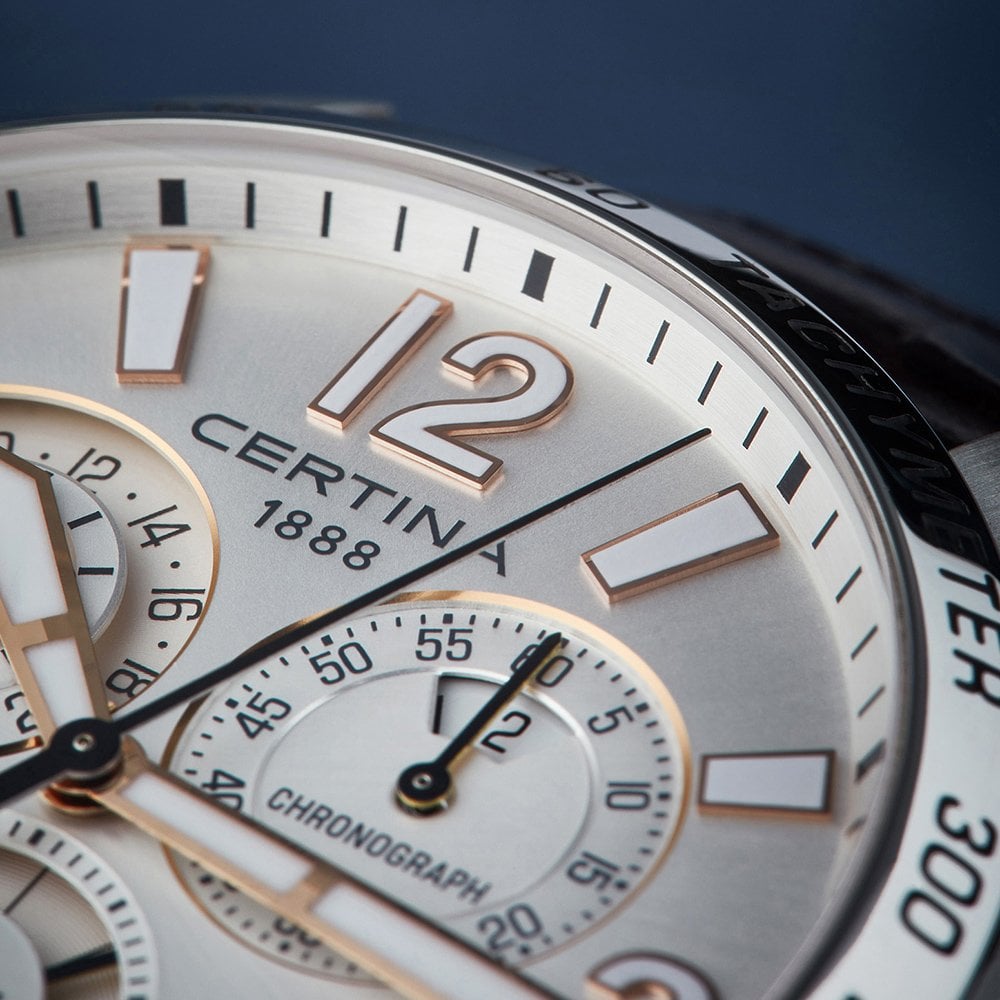Аксессуар с серебристым циферблатом станет универсальным вариантом для делового или повседневного образа. Стильный хронографХронографФункция позволяет измерять отрезки времени с особой точностью: часы, минуты, секунды. Верным признаком хронографа является наличие на циферблате 3 дополнительных окошек-счётчиков. функционирует благодаря швейцарскому кварцевому механизму ETA G10.962 Precidrive™Precidrive™Инновационный кварцевый механизм Certina. Часы, оснащённые этим швейцарским калибром, приравниваются к точности к сертифицированным хронометрам, точность хода составляет +/-10 секунд в год.. Его абсолютная точность хода отмечена официальным сертификатом хронометра COSCСертификат COSCОфициальный сертификат, подтверждающий то, что часы ходят с особо высокой точностью. Для получения документа часы подвергаются тестовым испытаниям, разработанным швейцарским институтом тестирования хронометров COSC. Допустимая норма для механических часов -4/+6 секунд в день, для кварцевых моделей +/- 0,07 секунд в день.. Классический ремешок из натуральной кожи имеет поверхность с тиснением под кожу крокодила. Соблюдение DS ConceptDS ConceptDouble Security Concept, обозначает двойную надёжность и безупречную точность часов Certina. Двойная система защиты подразумевает обеспечение максимальной устойчивости к ударам и высоких показателей водонепроницаемости.. Сапфировое стекло с односторонним антибликовым покрытием. БезельБезельВнешний ободок, закрепляющий стекло. В спортивных часах так называется поворотное кольцо с делениями на циферблате, выполняет роль таймера – замеряет отрезки времени на шкале. Неподвижный безель – элемент декора. Однонаправленно вращающийся безель на дайверских часах позволяет фиксировать моменты погружения и выныривания на поверхность. со шкалой тахиметраТахиметрРазмеченная шкала, располагается на ободке или безеле часов. Тахиметр позволяет рассчитать скорость на определённом участке пути, расстояние измеряется в километрах или милях.. Водостойкость 100 метров. Люминесцентная подсветкаЛюминесцентное покрытиеПозволяет считывать показания времени в темноте. Производители наносят на стрелки, часовые индексы, безель или поверхность циферблата светонакопительный состав, дающий холодное свечение.. Защищённая заводная головка. Секундомер, GMTGMTОтображение времени второго часового пояса.Такая функция особенно актуальна для путешественников и бизнесменов,которые общаются с людьми из разных стран,теперь вы всегда будете знать,какой час у вашего партнёра или близкого человека., отображение числа, индикатор EOLEOLПредставляет собой систему, уведомляющую владельца часов о необходимости замены элемента питания. За 2 недели до полного разряда батарейки секундная стрелка перестаёт ходить чётко и начинает перепрыгивать на 3-4 деления.. Диаметр корпуса: 42 мм.