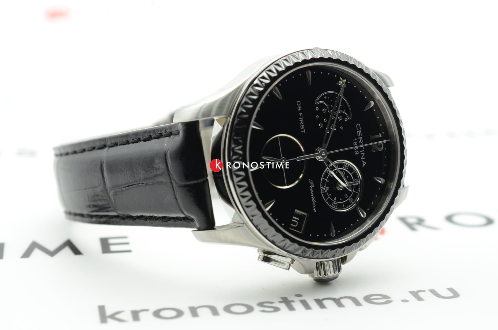 Окошко в положении 10 часов отображает лунные фазы, стильно смотрится бриллиантовая звезда. Кварцевый швейцарский механизм G10.962 Precidrive™Precidrive™Инновационный кварцевый механизм Certina. Часы, оснащённые этим швейцарским калибром, приравниваются к точности к сертифицированным хронометрам, точность хода составляет +/-10 секунд в год.. Керамический безельБезельВнешний ободок, закрепляющий стекло. В спортивных часах так называется поворотное кольцо с делениями на циферблате, выполняет роль таймера – замеряет отрезки времени на шкале. Неподвижный безель – элемент декора. Однонаправленно вращающийся безель на дайверских часах позволяет фиксировать моменты погружения и выныривания на поверхность. с гранёным краем. Чёрный кожаный ремешок. EOLEOLПредставляет собой систему, уведомляющую владельца часов о необходимости замены элемента питания. За 2 недели до полного разряда батарейки секундная стрелка перестаёт ходить чётко и начинает перепрыгивать на 3-4 деления., календарь, хронографХронографФункция позволяет измерять отрезки времени с особой точностью: часы, минуты, секунды. Верным признаком хронографа является наличие на циферблате 3 дополнительных окошек-счётчиков..
