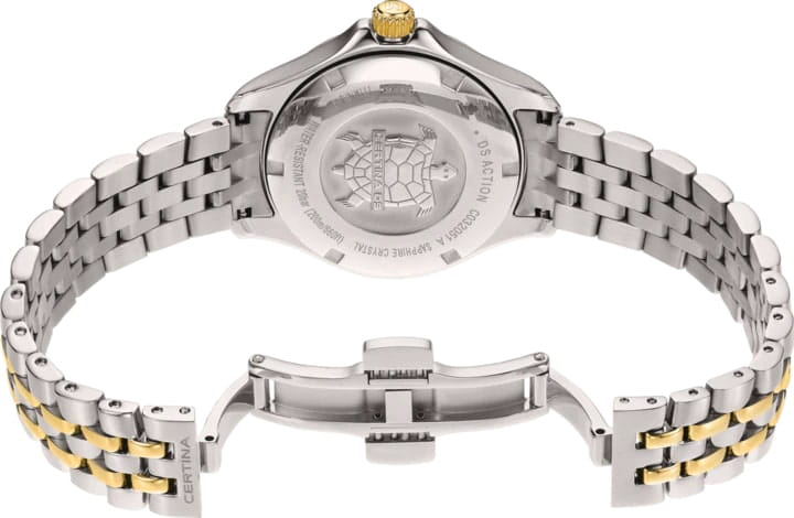 Аксессуар обладает изящным силуэтом, отражающим классический стиль и элегантность. Циферблат украшен 3 роскошными бриллиантами оттенка Top Wesselton. Часы комплектуются высокоточным кварцевым калибром F06.412 от швейцарской компании ETA, высокая точность механизма подтверждается сертификатом хронометра COSCСертификат COSCОфициальный сертификат, подтверждающий то, что часы ходят с особо высокой точностью. Для получения документа часы подвергаются тестовым испытаниям, разработанным швейцарским институтом тестирования хронометров COSC. Допустимая норма для механических часов -4/+6 секунд в день, для кварцевых моделей +/- 0,07 секунд в день.. Концепция DS ConceptDS ConceptDouble Security Concept, обозначает двойную надёжность и безупречную точность часов Certina. Двойная система защиты подразумевает обеспечение максимальной устойчивости к ударам и высоких показателей водонепроницаемости. гарантирует повышенную ударопрочность часов и сохранение водонепроницаемости до 20 бар. Одностороннее антибликовое покрытие сапфирового стекла. Корпус часов изготовлен из титана. Титановый браслет с PVD-покрытиемPVDУльтратонкое покрытие наносится в технике вакуумного напыления, сочетает в себе нитрид титана особой прочности со слоем золота или оксида хрома. Несёт в себе декоративную или защитную функцию. на застёжке-бабочке с кнопкамиЗастёжка "бабочка"Такой вид застёжки дополняется предохранителями, помогающими избежать случайного раскрытия браслета. Обладают изящным исполнением. . Окошко даты, функция EOLEOLПредставляет собой систему, уведомляющую владельца часов о необходимости замены элемента питания. За 2 недели до полного разряда батарейки секундная стрелка перестаёт ходить чётко и начинает перепрыгивать на 3-4 деления.. Диаметр корпуса: 33,8 мм.