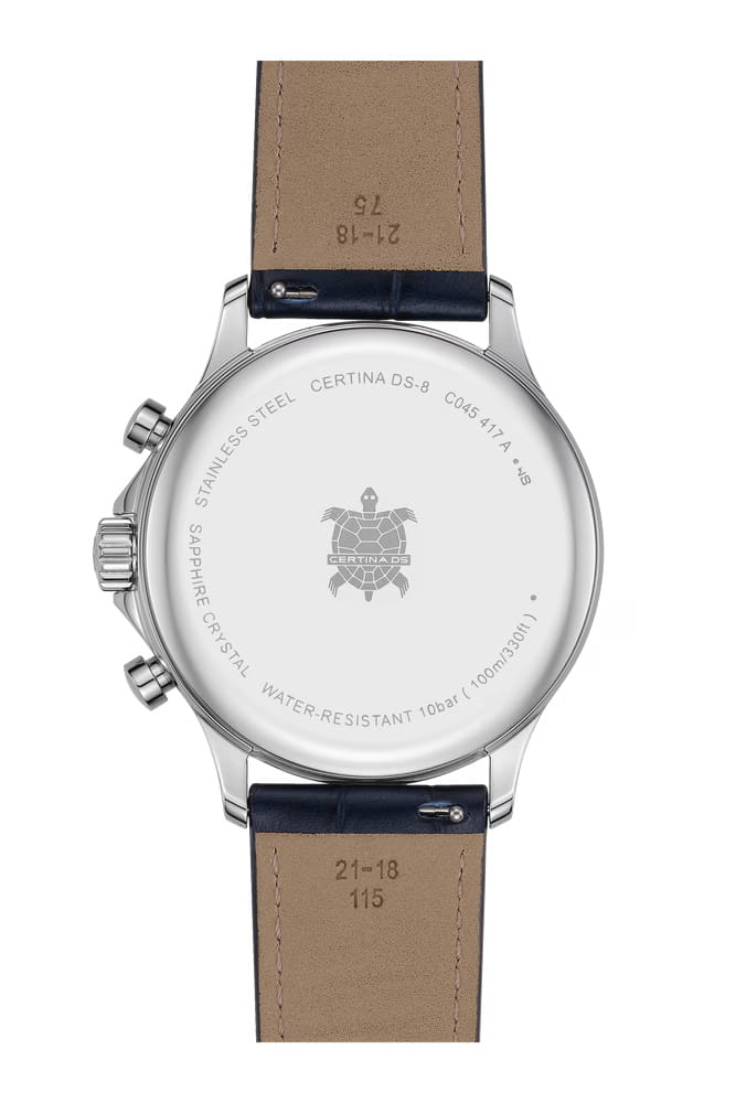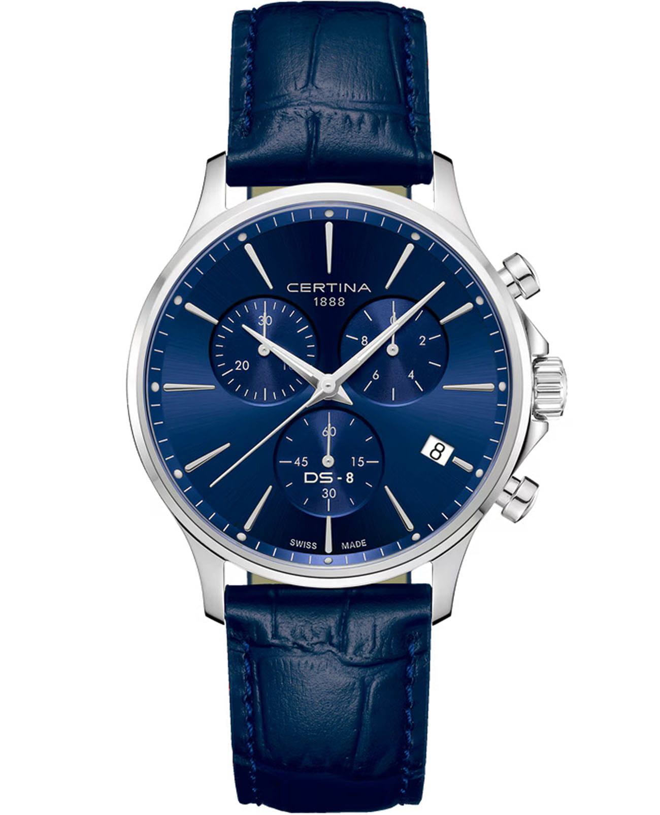 Швейцарские мужские часы Certina DS-8 Chrono C045.417.16.041.00 выглядят стильно и гламурно, модель добавит изящества в повседневный образ. Кварцевый механизм с высокой точностью. Сапфировое стеклоСапфировое стеклоПрочный и надёжный материал из кристалла сапфира синтетического происхождения, характеризующийся особой твёрдостью и устойчивостью к царапинам и повреждениям. устойчивое к появлению царапин, обладающее высокой прозрачностью. Изысканный корпус часов диаметром 41 мм изготовлен из нержавеющей стали 316L. Синий циферблат с изысканными лаконичными стрелками и метками, а также с индикаторами хронографаХронографФункция позволяет измерять отрезки времени с особой точностью: часы, минуты, секунды. Верным признаком хронографа является наличие на циферблате 3 дополнительных окошек-счётчиков.. Стрелки с люминесцентным покрытиемЛюминесцентное покрытиеПозволяет считывать показания времени в темноте. Производители наносят на стрелки, часовые индексы, безель или поверхность циферблата светонакопительный состав, дающий холодное свечение. SuperLumiNova® обеспечивают превосходную читаемость даже в условиях низкой освещённости. Окошко даты находится в положении 4 часов. Класс водозащиты: 100 метров, позволит плавать, нырять и заниматься другими водными видами спорта. Изящный кожаный ремень со стандартной застежкой обеспечивает комфортную посадку на запястье. Коллекция DS-8 объединяет техническое совершенство с безупречно стильным исполнением.