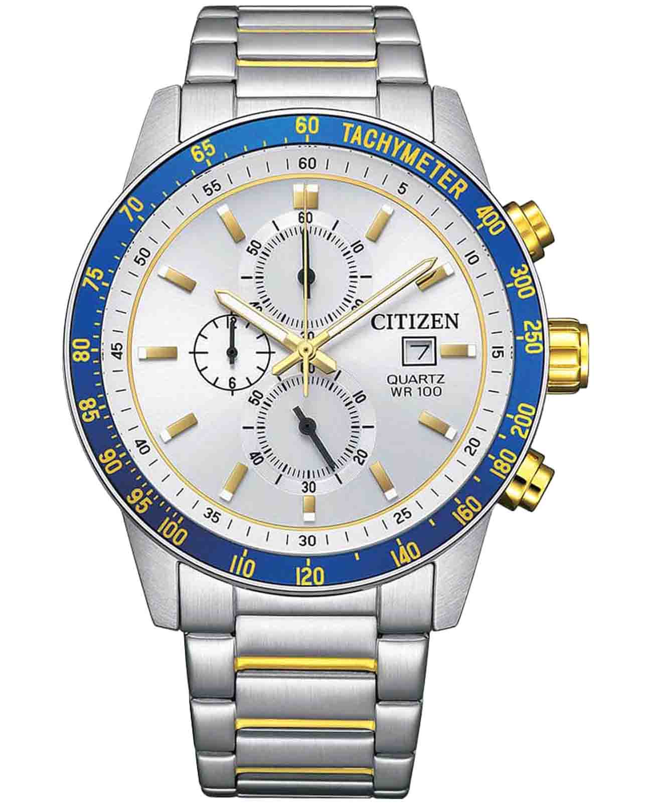 Citizen Chronograph AN3686-53A часы-хронографХронографФункция позволяет измерять отрезки времени с особой точностью: часы, минуты, секунды. Верным признаком хронографа является наличие на циферблате 3 дополнительных окошек-счётчиков. с секундомеромСекундомерСекундоме́р — прибор, способный измерять интервалы времени с точностью до долей секунды. спортивного дизайна с высоким уровнем водозащиты. Корпус из нержавеющей стали диаметром 44 мм идеально сбалансирован. Минеральное стеклоМинеральное стеклоМинеральное стекло представляет собой искусственно выращенный минерал кварца. Такое стекло отличается особой устойчивостью к повреждениям и царапинам. Уступает по некоторым качествам сапфировому стеклу. обеспечивает отличную защиту циферблата от царапин. Часы работают на основе кварцевого механизма. Стальной браслет на раскладной застёжкеРаскладная застёжкаТакой тип застёжки используется только на браслетах из металла. Она никогда не раскрывается полностью, происходит разделение на 2 и более частей. Раскладывающая застёжка снизит вероятность потери часов к минимуму. с частичным IP-покрытиемIP-покрытиеМетод ионного напыления. Демонстрирует повышенную устойчивость к истиранию, окислению и химическим веществам. Под воздействием высокого давления и температуры около 1500°C молекулы металла надёжно соединяются с частицами корпуса часов. идеально дополняют дизайн часов, обеспечивая комфортное ношение. Стрелки и метки на циферблате имеют люминесцентное покрытиеЛюминесцентное покрытиеПозволяет считывать показания времени в темноте. Производители наносят на стрелки, часовые индексы, безель или поверхность циферблата светонакопительный состав, дающий холодное свечение. позволяющее легко определять время даже в темноте. БезельБезельВнешний ободок, закрепляющий стекло. В спортивных часах так называется поворотное кольцо с делениями на циферблате, выполняет роль таймера – замеряет отрезки времени на шкале. Неподвижный безель – элемент декора. Однонаправленно вращающийся безель на дайверских часах позволяет фиксировать моменты погружения и выныривания на поверхность. с IP-покрытиемIP-покрытиеМетод ионного напыления. Демонстрирует повышенную устойчивость к истиранию, окислению и химическим веществам. Под воздействием высокого давления и температуры около 1500°C молекулы металла надёжно соединяются с частицами корпуса часов. и шкалой тахиметраТахиметрРазмеченная шкала, располагается на ободке или безеле часов. Тахиметр позволяет рассчитать скорость на определённом участке пути, расстояние измеряется в километрах или милях.. Секундомер с точностью 1с и временем измерения 12ч отображается центральной стрелкой. Окошко даты находится в положении 3 часа. Циферблат с метками в виде штрихов выполнен по технологии Sunray (солнечные лучи). Часы обладают впечатляющей водонепроницаемостью до 100WR, что делает их идеальными для повседневной носки.