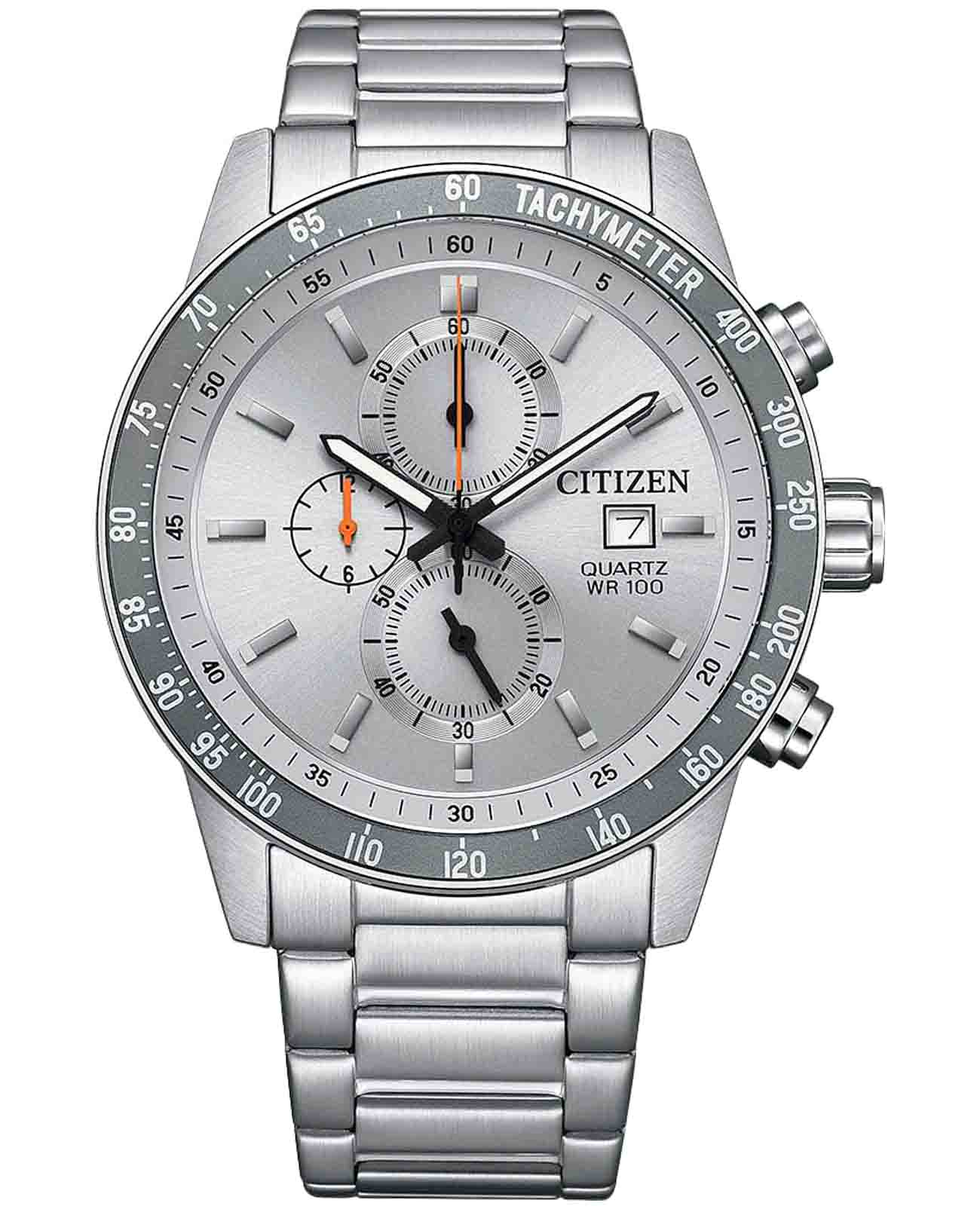 Citizen Chronograph AN3688-58H часы-хронографХронографФункция позволяет измерять отрезки времени с особой точностью: часы, минуты, секунды. Верным признаком хронографа является наличие на циферблате 3 дополнительных окошек-счётчиков. с секундомеромСекундомерСекундоме́р — прибор, способный измерять интервалы времени с точностью до долей секунды. спортивного дизайна с высоким уровнем водозащиты. Корпус из нержавеющей стали диаметром 44 мм идеально сбалансирован. Минеральное стеклоМинеральное стеклоМинеральное стекло представляет собой искусственно выращенный минерал кварца. Такое стекло отличается особой устойчивостью к повреждениям и царапинам. Уступает по некоторым качествам сапфировому стеклу. обеспечивает отличную защиту циферблата от царапин. Часы работают на основе кварцевого механизма. Стальной браслет на раскладной застёжкеРаскладная застёжкаТакой тип застёжки используется только на браслетах из металла. Она никогда не раскрывается полностью, происходит разделение на 2 и более частей. Раскладывающая застёжка снизит вероятность потери часов к минимуму. идеально дополняют дизайн часов, обеспечивая комфортное ношение. Стрелки на циферблате имеют люминесцентное покрытиеЛюминесцентное покрытиеПозволяет считывать показания времени в темноте. Производители наносят на стрелки, часовые индексы, безель или поверхность циферблата светонакопительный состав, дающий холодное свечение. позволяющее легко определять время даже в темноте. БезельБезельВнешний ободок, закрепляющий стекло. В спортивных часах так называется поворотное кольцо с делениями на циферблате, выполняет роль таймера – замеряет отрезки времени на шкале. Неподвижный безель – элемент декора. Однонаправленно вращающийся безель на дайверских часах позволяет фиксировать моменты погружения и выныривания на поверхность. с IP-покрытиемIP-покрытиеМетод ионного напыления. Демонстрирует повышенную устойчивость к истиранию, окислению и химическим веществам. Под воздействием высокого давления и температуры около 1500°C молекулы металла надёжно соединяются с частицами корпуса часов. и шкалой тахиметраТахиметрРазмеченная шкала, располагается на ободке или безеле часов. Тахиметр позволяет рассчитать скорость на определённом участке пути, расстояние измеряется в километрах или милях.. Секундомер с точностью 1с и временем измерения 12ч отображается центральной стрелкой. Циферблат с метками в виде штрихов выполнен по технологии Sunray (солнечные лучи). Окошко даты находится в положении 3 часа. Часы обладают впечатляющей водонепроницаемостью до 100WR, что делает их идеальными для повседневной носки.
