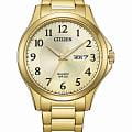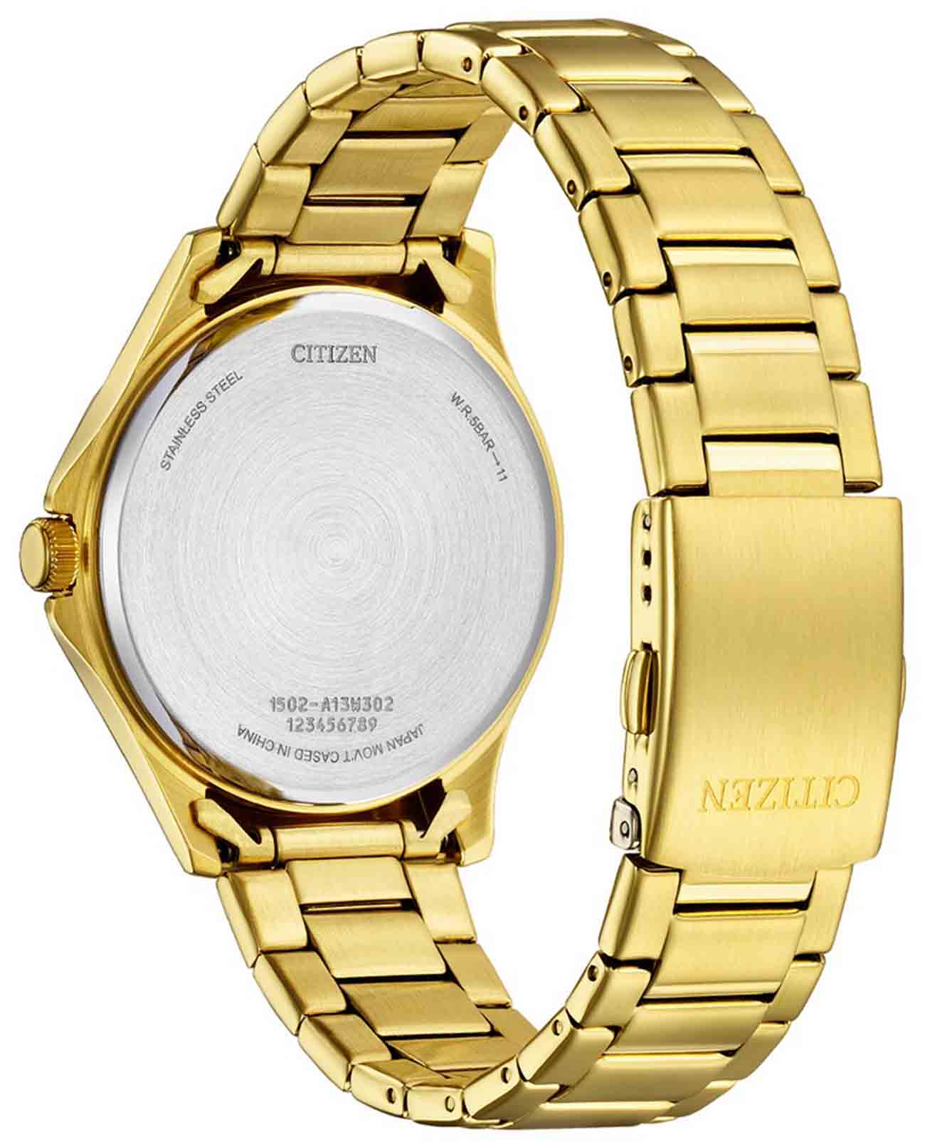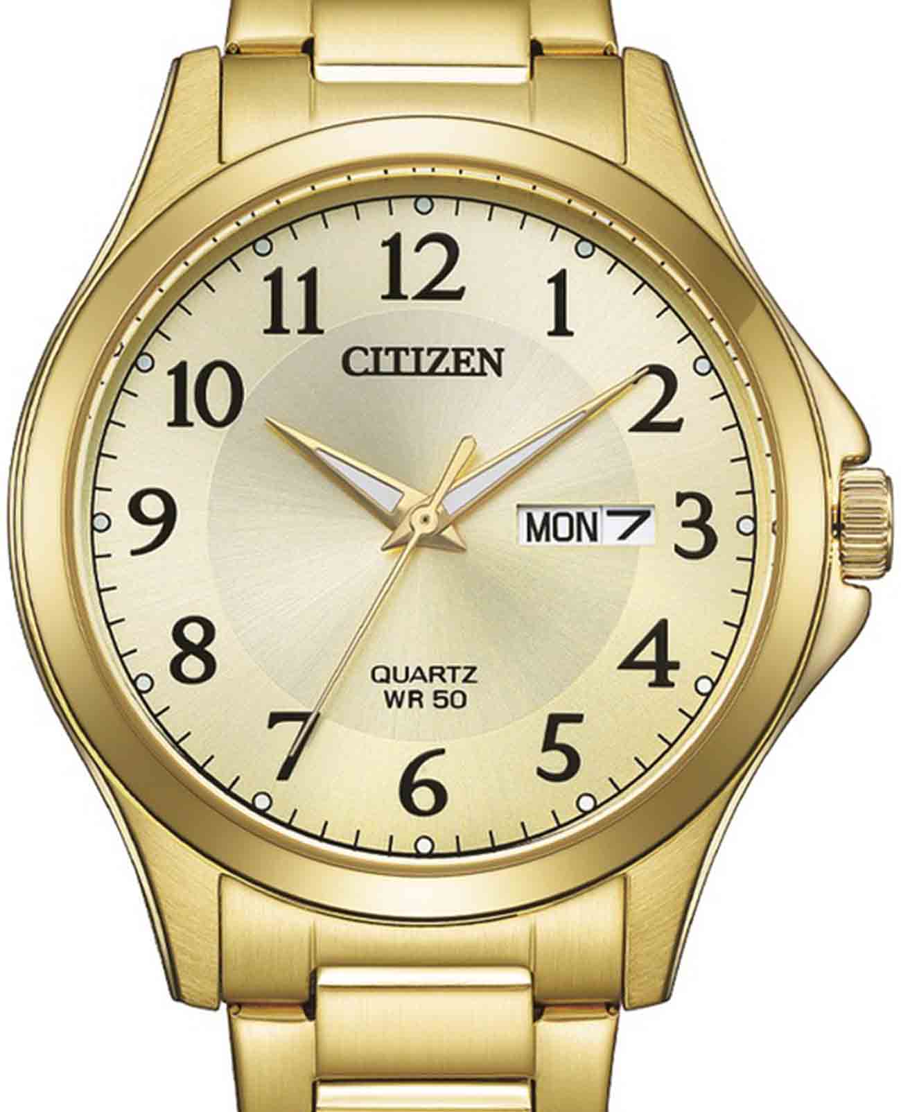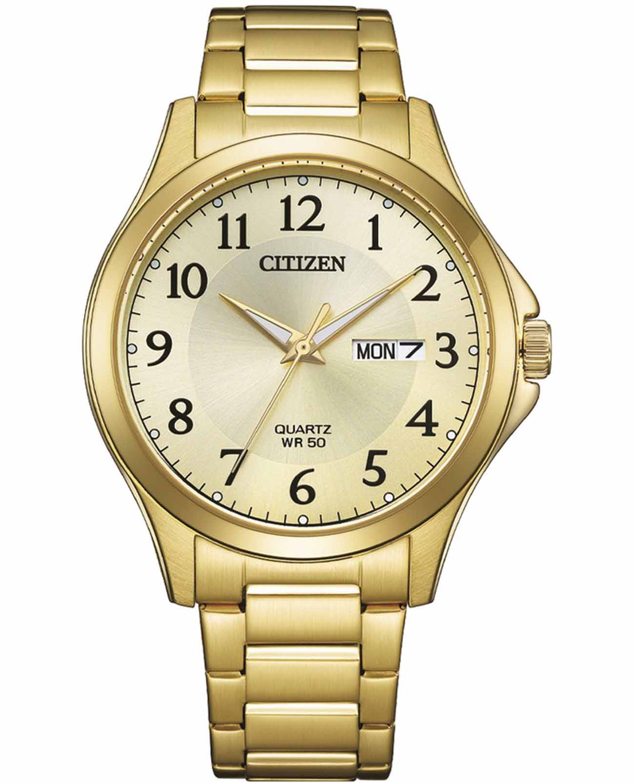 Часы Citizen BF2028-83P— это надежная модель, произведенная в Японии, с современным кварцевым механизмом Citizen 1502. Корпус выполнен из прочной нержавеющей стали с элегантным золотистым IP-покрытиемIP-покрытиеМетод ионного напыления. Демонстрирует повышенную устойчивость к истиранию, окислению и химическим веществам. Под воздействием высокого давления и температуры около 1500°C молекулы металла надёжно соединяются с частицами корпуса часов. и имеет диаметр 41 мм, что обеспечивает комфортную посадку на запястье. Белый циферблат украшен четкими арабскими цифрами и дополнен окошком календаря с отображением даты и дня недели в позиции «3 часа». Минеральное стеклоМинеральное стеклоМинеральное стекло представляет собой искусственно выращенный минерал кварца. Такое стекло отличается особой устойчивостью к повреждениям и царапинам. Уступает по некоторым качествам сапфировому стеклу. защищает часы от случайных царапин, а водозащита до 50 метров позволяет не снимать их во время повседневных дел и легких водных процедур. Стрелки с люминесцентным покрытиемЛюминесцентное покрытиеПозволяет считывать показания времени в темноте. Производители наносят на стрелки, часовые индексы, безель или поверхность циферблата светонакопительный состав, дающий холодное свечение. обеспечивают отличную видимость в темноте. Стальной браслет с золотистым IP-покрытиемIP-покрытиеМетод ионного напыления. Демонстрирует повышенную устойчивость к истиранию, окислению и химическим веществам. Под воздействием высокого давления и температуры около 1500°C молекулы металла надёжно соединяются с частицами корпуса часов. оснащен надежной раскладной застёжкойРаскладная застёжкаТакой тип застёжки используется только на браслетах из металла. Она никогда не раскрывается полностью, происходит разделение на 2 и более частей. Раскладывающая застёжка снизит вероятность потери часов к минимуму., а рифленая заводная головка с защитой подчеркивает внимание к деталям и практичность модели.