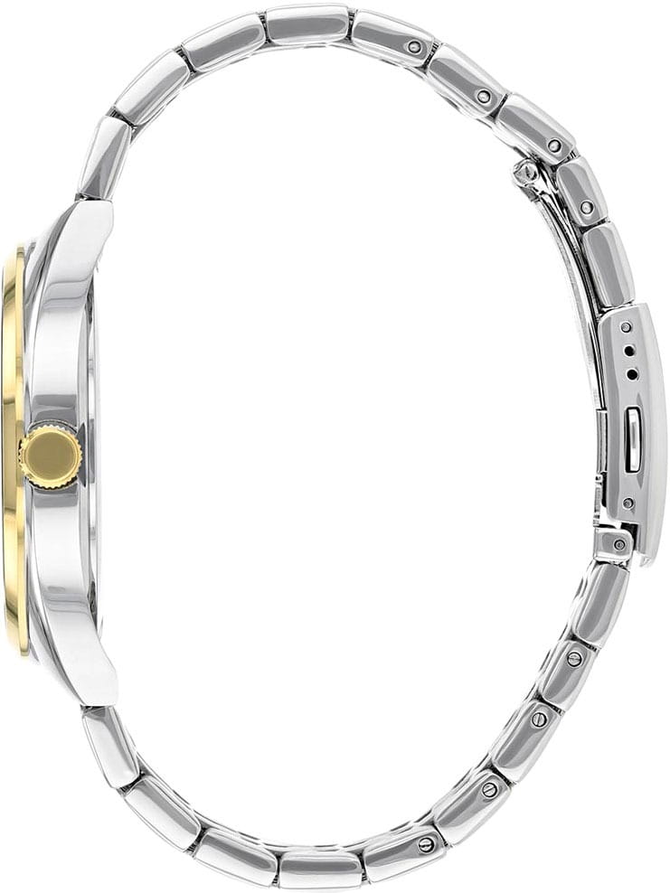 Часы Citizen BI5094-59E — это стильная и надежная модель японского производства, оснащённая высокоточным кварцевым механизмом Citizen G111. Круглый корпус диаметром 42 мм выполнен из нержавеющей стали, что придаёт изделию элегантный и современный вид, а также защищает от внешних воздействий. БезельБезельВнешний ободок, закрепляющий стекло. В спортивных часах так называется поворотное кольцо с делениями на циферблате, выполняет роль таймера – замеряет отрезки времени на шкале. Неподвижный безель – элемент декора. Однонаправленно вращающийся безель на дайверских часах позволяет фиксировать моменты погружения и выныривания на поверхность. с элегантным золотистым IP-покрытиемIP-покрытиеМетод ионного напыления. Демонстрирует повышенную устойчивость к истиранию, окислению и химическим веществам. Под воздействием высокого давления и температуры около 1500°C молекулы металла надёжно соединяются с частицами корпуса часов.. Черный циферблат оформлен минималистично, с метками в виде аккуратных штрихов и заострёнными прямоугольными стрелками в стиле Baton с люминесцентным покрытиемЛюминесцентное покрытиеПозволяет считывать показания времени в темноте. Производители наносят на стрелки, часовые индексы, безель или поверхность циферблата светонакопительный состав, дающий холодное свечение. для удобного считывания времени даже в темноте. Минеральное стеклоМинеральное стеклоМинеральное стекло представляет собой искусственно выращенный минерал кварца. Такое стекло отличается особой устойчивостью к повреждениям и царапинам. Уступает по некоторым качествам сапфировому стеклу. гарантирует защиту от царапин и сохраняет презентабельный внешний вид на долгое время. Окошко календаря с отображением числа расположено в позиции 6 часов, что добавляет функциональности и подчеркивает современный стиль модели. Рифленая заводная головка обеспечивает лёгкость настройки, а стальной браслет с частичным золотистым IP-покрытиемIP-покрытиеМетод ионного напыления. Демонстрирует повышенную устойчивость к истиранию, окислению и химическим веществам. Под воздействием высокого давления и температуры около 1500°C молекулы металла надёжно соединяются с частицами корпуса часов. и раскладывающейся застёжкой надёжно фиксирует часы на запястье. Водозащита до 50 метров позволяет не опасаться случайного контакта с водой в повседневной жизни.