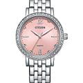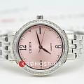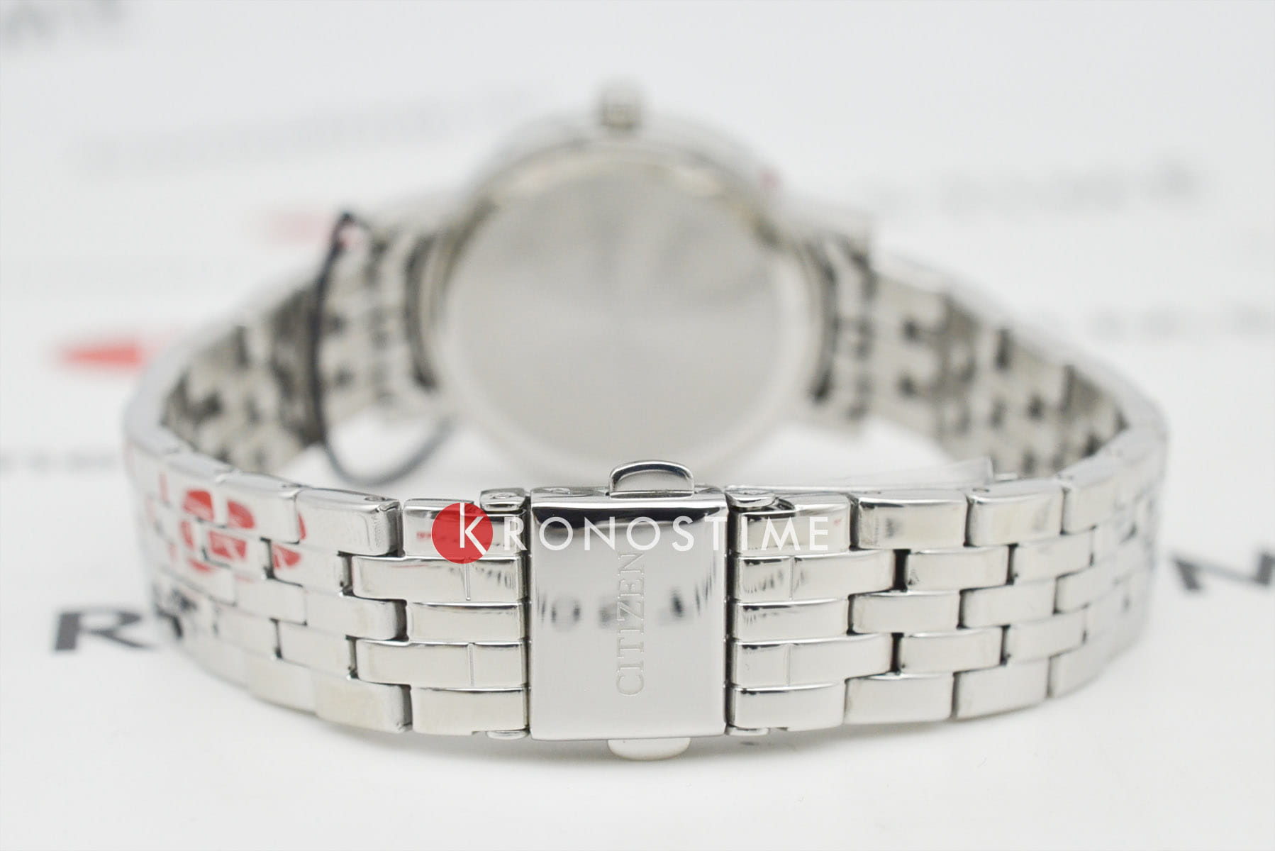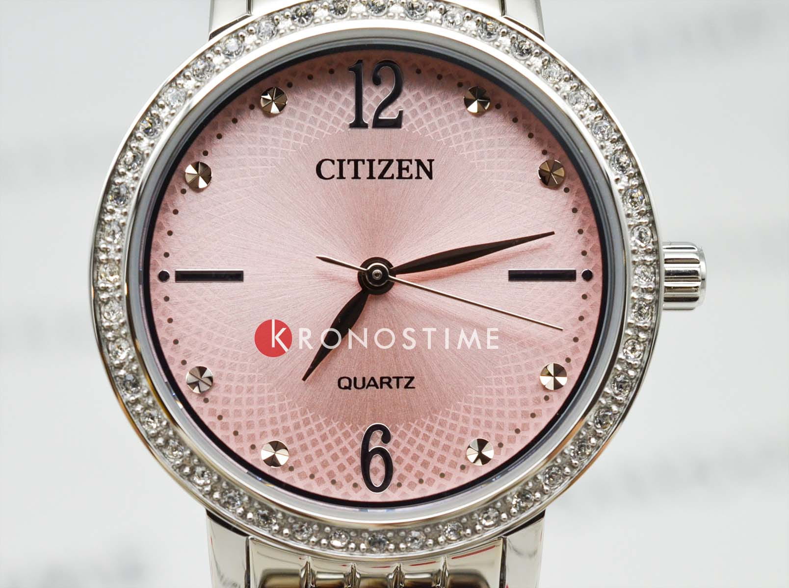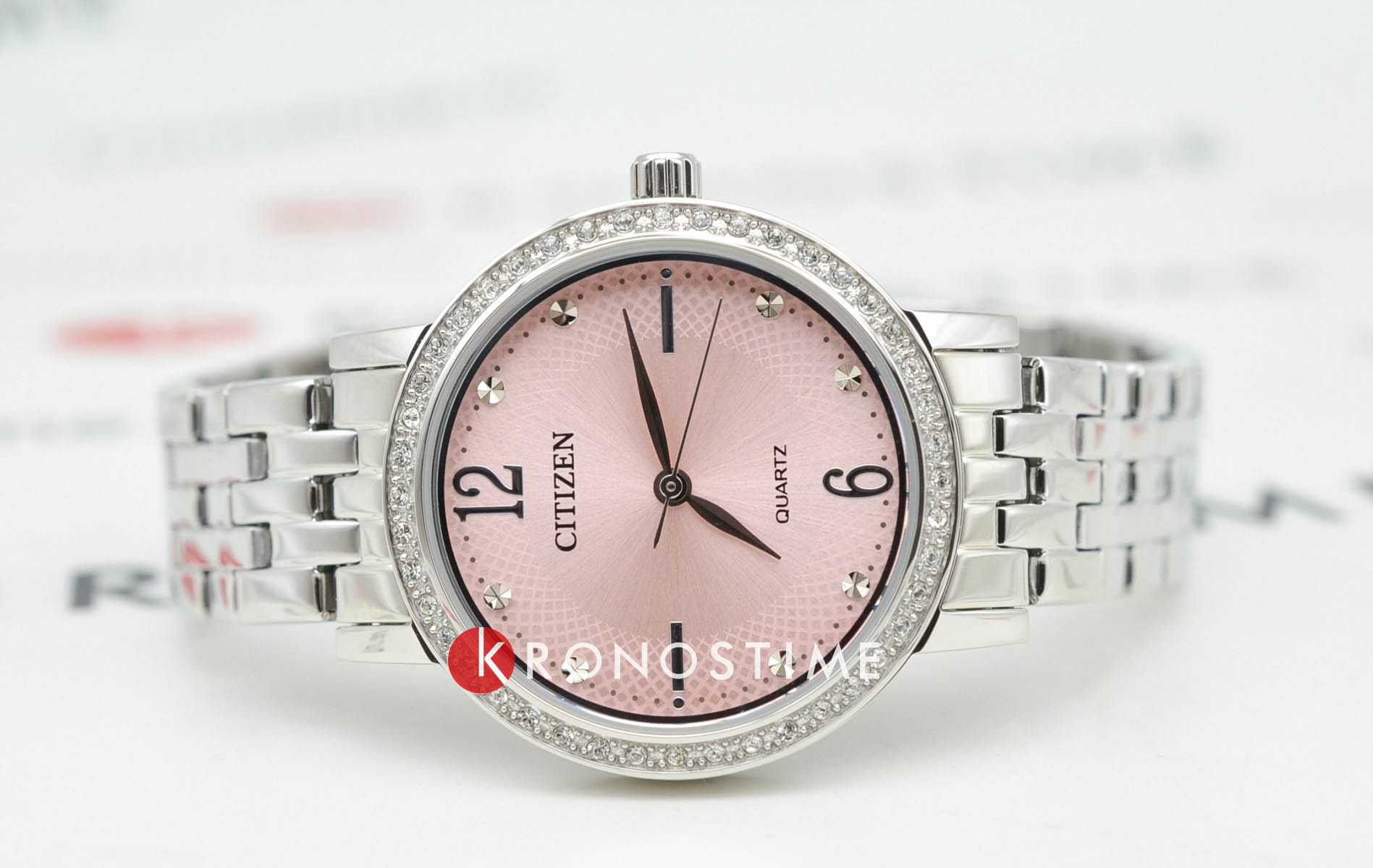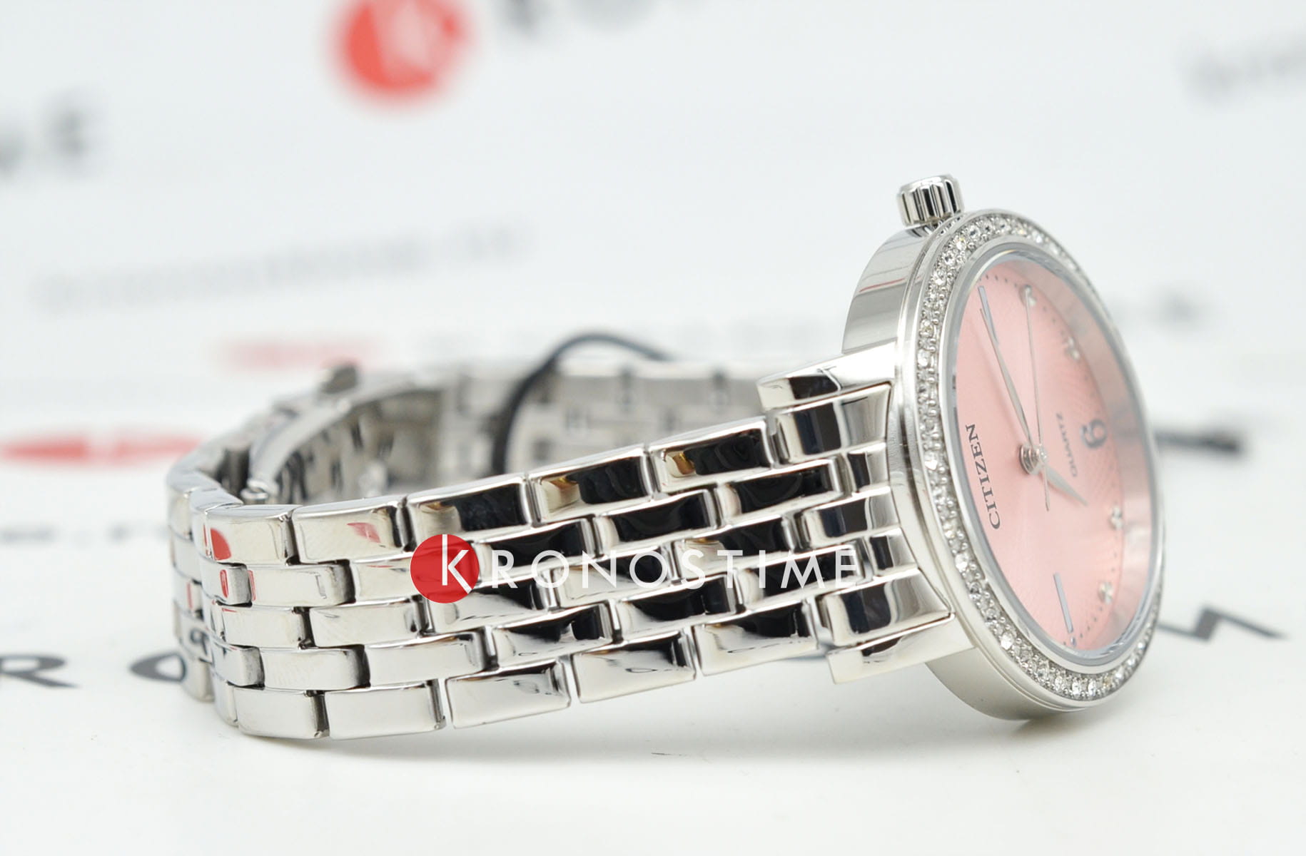 Часы Citizen EL3100-55W представляют собой элегантную модель, выполненную в Японии, сочетающую в себе современные технологии и утончённый дизайн. Корпус и браслет изготовлены из прочной нержавеющей стали, что обеспечивает долговечность и привлекательный внешний вид. Диаметр корпуса составляет 31 мм, а толщина — всего 7 мм, что делает часы изящными и аккуратными на запястье. Особое внимание привлекает безельБезельВнешний ободок, закрепляющий стекло. В спортивных часах так называется поворотное кольцо с делениями на циферблате, выполняет роль таймера – замеряет отрезки времени на шкале. Неподвижный безель – элемент декора. Однонаправленно вращающийся безель на дайверских часах позволяет фиксировать моменты погружения и выныривания на поверхность., украшенный мерцающими кристаллами, которые придают часам особый шарм и изысканность. Надёжный кварцевый механизм гарантирует точность хода, а водозащита уровня WR 50 позволяет не снимать часы при мытье рук или во время дождя. Нежно-розовый циферблат украшен часовыми индексами в виде точек и цифр, а также оснащён центральными стрелками часов, минут и секунд для удобного считывания времени и кристаллами. Минеральное стеклоМинеральное стеклоМинеральное стекло представляет собой искусственно выращенный минерал кварца. Такое стекло отличается особой устойчивостью к повреждениям и царапинам. Уступает по некоторым качествам сапфировому стеклу. устойчиво к появлению мелких царапин, сохраняя прозрачность и презентабельный вид.  Стальной браслет с раскладной застёжкойРаскладная застёжкаТакой тип застёжки используется только на браслетах из металла. Она никогда не раскрывается полностью, происходит разделение на 2 и более частей. Раскладывающая застёжка снизит вероятность потери часов к минимуму. надежно фиксирует часы на запястье, обеспечивая комфорт при ежедневном ношении.