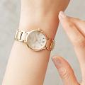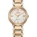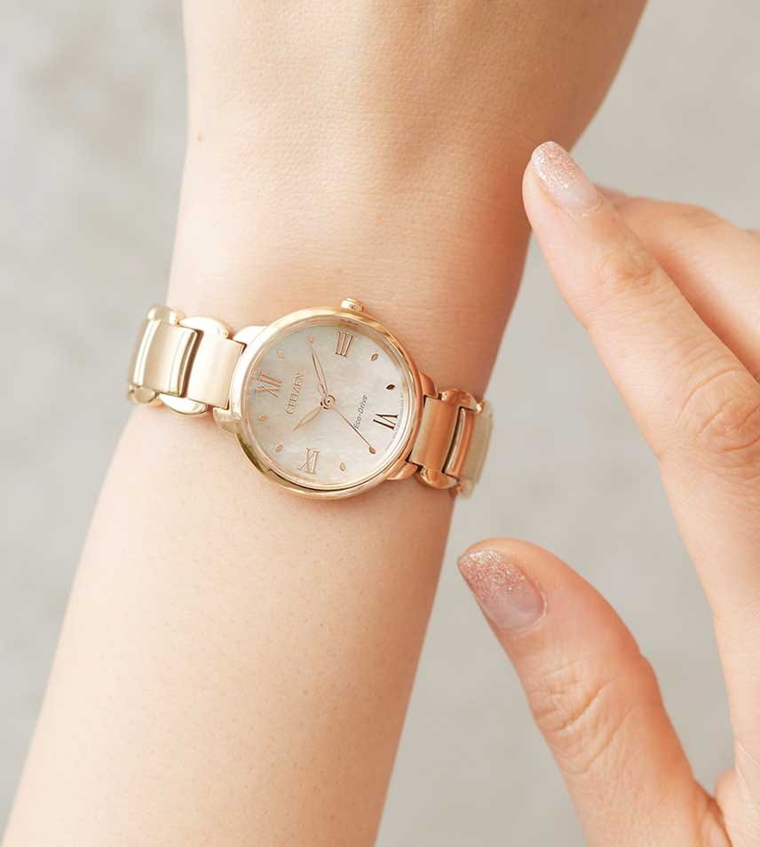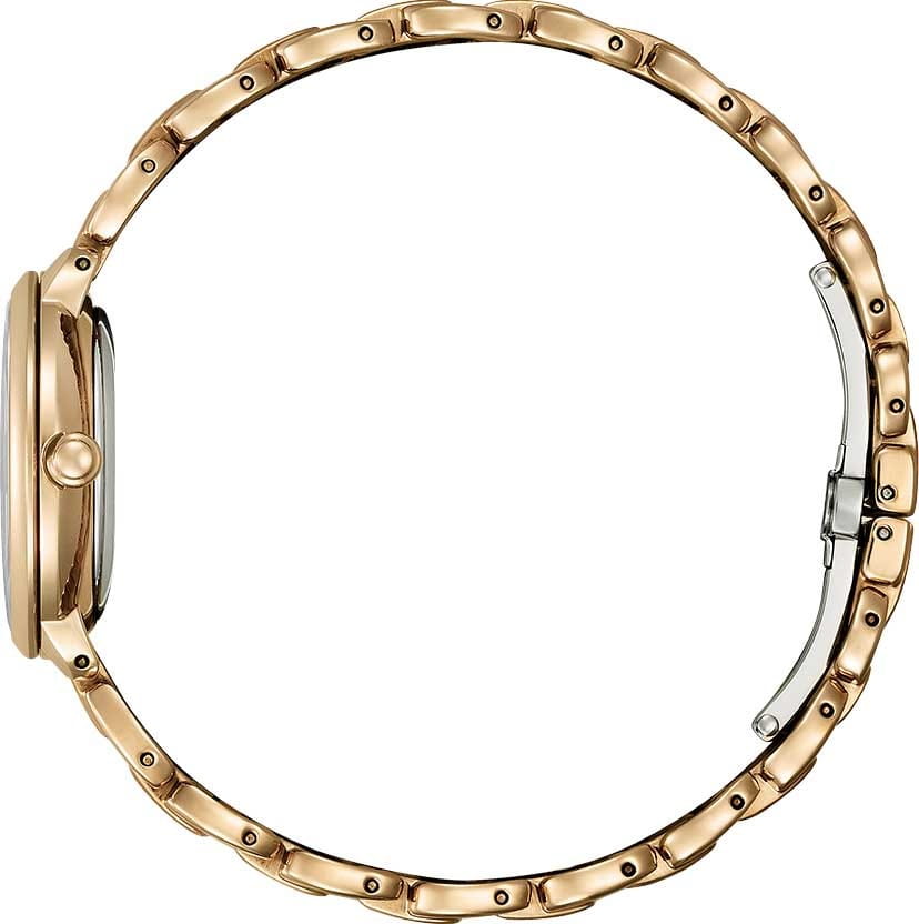 Часы Citizen EM0929-81Y произведены в Японии и оснащены точным кварцевым механизмом калибра Citizen E031 с инновационной системой Eco-Drive, работающей от солнечной энергии и обеспечивающей до 180 дней автономной работы без замены батареек. Корпус и браслет изготовлены из прочной нержавеющей стали с золотистым IP-покрытиемIP-покрытиеМетод ионного напыления. Демонстрирует повышенную устойчивость к истиранию, окислению и химическим веществам. Под воздействием высокого давления и температуры около 1500°C молекулы металла надёжно соединяются с частицами корпуса часов., что придает изделию элегантный и современный вид, а браслет оснащен удобной застежкой «бабочка»Застёжка "бабочка"Такой вид застёжки дополняется предохранителями, помогающими избежать случайного раскрытия браслета. Обладают изящным исполнением. . Перламутровый циферблат украшен изящными метками в виде точек и римских цифр, защищён надежным сапфировым стекломСапфировое стеклоПрочный и надёжный материал из кристалла сапфира синтетического происхождения, характеризующийся особой твёрдостью и устойчивостью к царапинам и повреждениям., устойчивым к царапинам. Водозащита 50WR позволяет не беспокоиться о контакте с водой в повседневной жизни. Компактные размеры корпуса (диаметр 28 мм, толщина 8 мм) и легкий вес (68 г) обеспечивают комфортное ношение в течение всего дня. Эта модель станет не только точным инструментом для измерения времени, но и стильным завершением вашего образа.