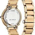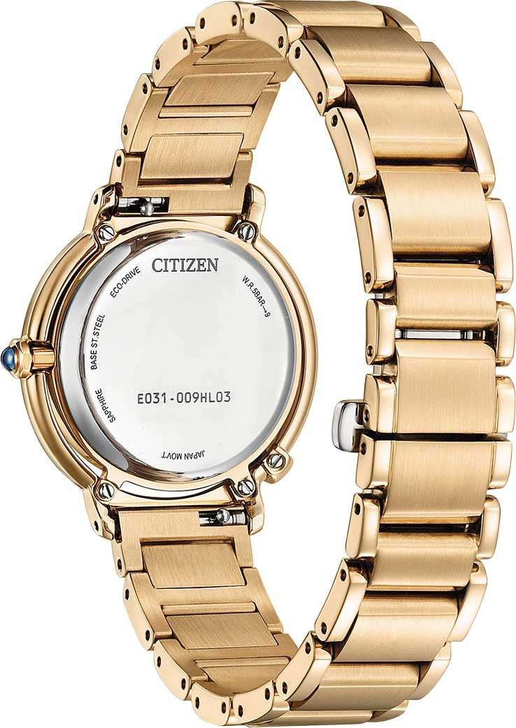 Часы Citizen EM1093-61D – это элегантная модель, созданная в Японии и сочетающая в себе современные технологии и изысканный дизайн. Надежный кварцевый механизм Citizen E031 с инновационной системой Eco-Drive работает от солнечной энергии и не требует замены батарейки, обеспечивая запас хода до 180 дней. Корпус и браслет часов выполнены из нержавеющей стали с золотым IP-покрытиемIP-покрытиеМетод ионного напыления. Демонстрирует повышенную устойчивость к истиранию, окислению и химическим веществам. Под воздействием высокого давления и температуры около 1500°C молекулы металла надёжно соединяются с частицами корпуса часов. и украшен тремя кристаллами, что придает аксессуару особое сияние. Перламутровый голубой циферблат с лаконичными метками защищен выпуклым сапфировым стекломСапфировое стеклоПрочный и надёжный материал из кристалла сапфира синтетического происхождения, характеризующийся особой твёрдостью и устойчивостью к царапинам и повреждениям., устойчивым к царапинам. Заводная головка декорирована камнем в форме кабошона, а задняя крышка закреплена на четырех винтах. Стальной браслет оснащен застежкой «бабочка»Застёжка "бабочка"Такой вид застёжки дополняется предохранителями, помогающими избежать случайного раскрытия браслета. Обладают изящным исполнением. и системой быстрой замены, что позволяет легко менять стиль часов в зависимости от вашего настроения. В комплекте также идет сменный белый ремешок с такой же застежкой. Водозащита 50WR позволяет не беспокоиться о случайном контакте с водой. Компактные размеры корпуса (диаметр 31,2 мм, толщина 7,8 мм, вес 71 г) обеспечивают комфортное ношение каждый день. Эти часы станут великолепным дополнением к любому образу и подчеркнут вашу индивидуальность.