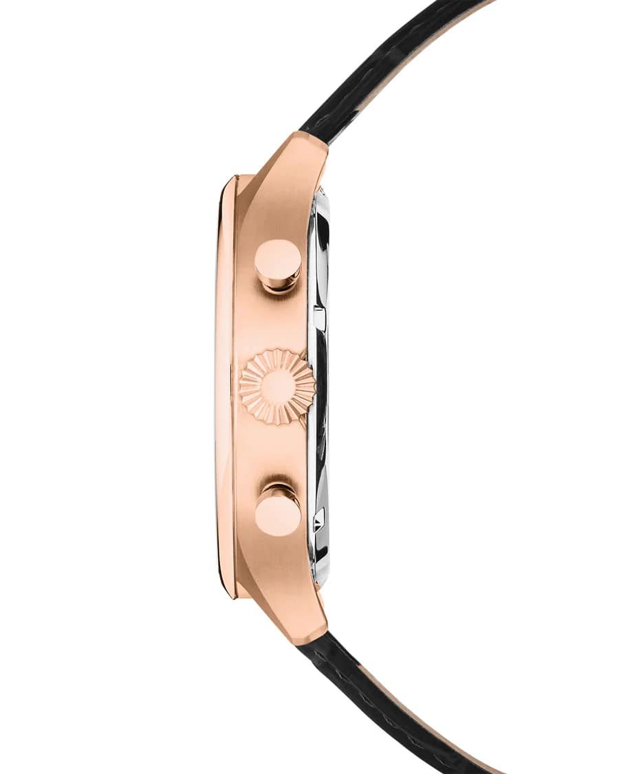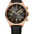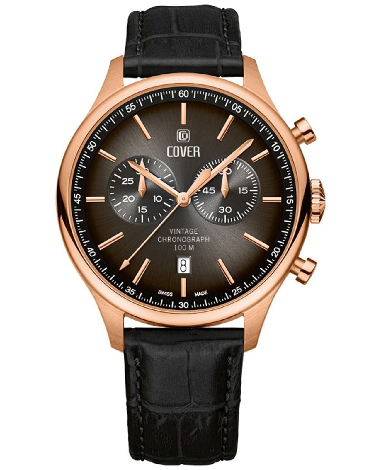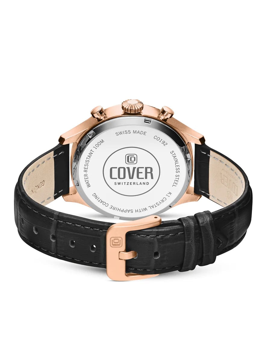 Мужские наручные часы-хронографХронографФункция позволяет измерять отрезки времени с особой точностью: часы, минуты, секунды. Верным признаком хронографа является наличие на циферблате 3 дополнительных окошек-счётчиков. Cover CO192.06 из коллекции Chapman Chronograph сочетают в себе классический дизайн и надежность современных технологий. Модель обладает круглым корпусом диаметром 42,5 мм, изготовленным из нержавеющей стали с PVD-покрытиемPVDУльтратонкое покрытие наносится в технике вакуумного напыления, сочетает в себе нитрид титана особой прочности со слоем золота или оксида хрома. Несёт в себе декоративную или защитную функцию. цвета розового золота, что обеспечивает высокую устойчивость к внешним воздействиям. Браслет выполнен из натуральной кожи с классической застежкой, гарантирующей комфортное ношение. Черный градиентный циферблат оснащен окном даты на «6 часах» и функцией секундомераСекундомерСекундоме́р — прибор, способный измерять интервалы времени с точностью до долей секунды., делая модель практичной для повседневного использования. Циферблат покрыт минеральным стекломМинеральное стеклоМинеральное стекло представляет собой искусственно выращенный минерал кварца. Такое стекло отличается особой устойчивостью к повреждениям и царапинам. Уступает по некоторым качествам сапфировому стеклу., обеспечивающим прочную защиту от царапин. Часы работают на кварцевом механизме Ronda 5021.D с 10 драгоценными камнями, что гарантирует точное время без необходимости подзаводки. Водонепроницаемость часов достигает 10 атмосфер (100 метров), что позволяет использовать их во время плавания и других водных видов спорта, однако не рекомендуется для глубоководного дайвинга.