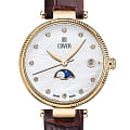 Женские часы Cover Moon CO196.05 - это аксессуар для истинных леди из коллекции Fly Me To The Moon. Часы работают на кварцевом калибре ETA. Циферблат выполнен в белом перламутровом исполнении, создавая игру света при каждом движении запястья, и украшен 11 кристаллами Swarovski, которые служат часовым индикатором, добавляя блики света и роскоши. Кроме того, модель имеет окно фаз Луны на «6 часах» и апертуру даты на «3 часах», что делает ее функциональной для ценителей астрономических усложнений. Часы имеют 32-миллиметровый корпус из нержавеющей стали с PVD-покрытиемPVDУльтратонкое покрытие наносится в технике вакуумного напыления, сочетает в себе нитрид титана особой прочности со слоем золота или оксида хрома. Несёт в себе декоративную или защитную функцию. цвета желтого золота. Водонепроницаемость часов достигает 5 атмосфер (WR 50), что позволяет использовать их в повседневной жизни, однако не рекомендуется для контакта с водой во время плавания или дайвинга. Маркировка «Swiss Made». Кожаный ремешок на классической застежке.