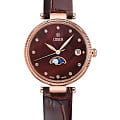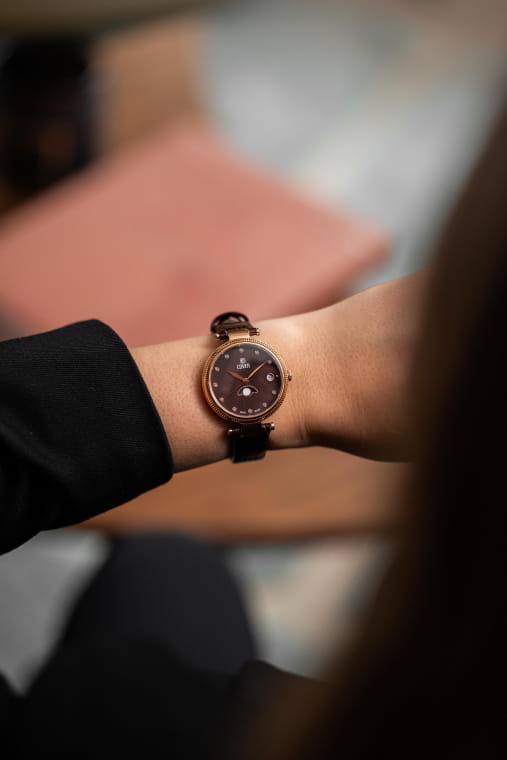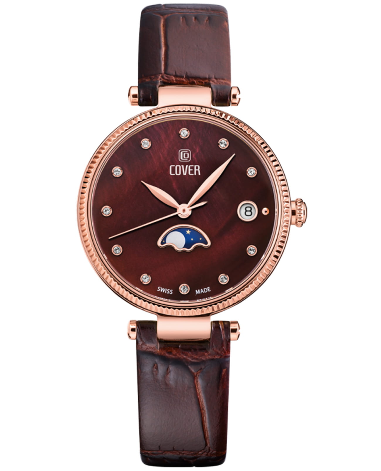 Женские часы Cover Moon CO196.07 - это аксессуар для истинных леди из коллекции Fly Me To The Moon. Часы работают на кварцевом калибре ETA. Циферблат выполнен в коричневом перламутровом исполнении, создавая игру света при каждом движении запястья, и украшен 11 кристаллами Swarovski, которые служат часовым индикатором, добавляя блики света и роскоши. Кроме того, модель имеет окно фаз Луны на «6 часах» и апертуру даты на «3 часах», что делает ее функциональной для ценителей астрономических усложнений. Часы имеют 32-миллиметровый корпус из нержавеющей стали с PVD-покрытиемPVDУльтратонкое покрытие наносится в технике вакуумного напыления, сочетает в себе нитрид титана особой прочности со слоем золота или оксида хрома. Несёт в себе декоративную или защитную функцию. цвета розового золота. Водонепроницаемость часов достигает 5 атмосфер (WR 50), что позволяет использовать их в повседневной жизни, однако не рекомендуется для контакта с водой во время плавания или дайвинга. Маркировка «Swiss Made». Кожаный ремешок на классической застежке.