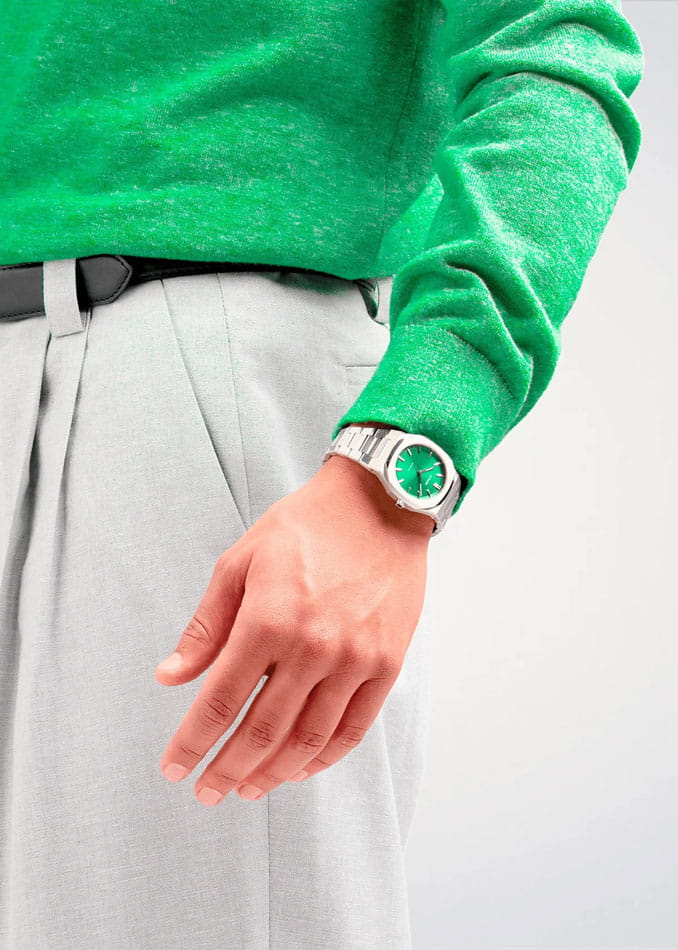 Часы D1 Milano Automatico Green Code ATBU05 – стильный аксессуар для современных женщин. Часы механические с автоподзаводом. Корпус выполнен из прочной нержавеющей стали 316L, а изысканный зеленый циферблат украшен простыми штрихами вместо цифр. Минималистичный дизайн циферблата, защищенный прочным сапфировым стекломСапфировое стеклоПрочный и надёжный материал из кристалла сапфира синтетического происхождения, характеризующийся особой твёрдостью и устойчивостью к царапинам и повреждениям. с антибликовым покрытиемАнтибликовое покрытиеСлой оксида металла в 0,13-0,3 микрон, благодаря которому стекло часов не бликует и не отражает свет. Антибликовое покрытие уменьшает отражение света в 10 раз, обеспечивая отличную читаемость показателей циферблата., привлекает внимание своей сдержанной красотой. Лаконичные стрелки с люминесцентным покрытиемЛюминесцентное покрытиеПозволяет считывать показания времени в темноте. Производители наносят на стрелки, часовые индексы, безель или поверхность циферблата светонакопительный состав, дающий холодное свечение.. Задняя крышка закреплена на 8 винтах, что обеспечивает надежность конструкции. Стальной браслет с удобной застёжкой «бабочка»Застёжка "бабочка"Такой вид застёжки дополняется предохранителями, помогающими избежать случайного раскрытия браслета. Обладают изящным исполнением. обеспечивают комфорт при ношении. Часы имеют водозащиту 100 метров (100WR), что позволит плавать, нырять и заниматься другими водными видами спорта. Это не просто часы, а статусный аксессуар, подчеркивающий безупречный вкус и внимание к деталям своего владельца.