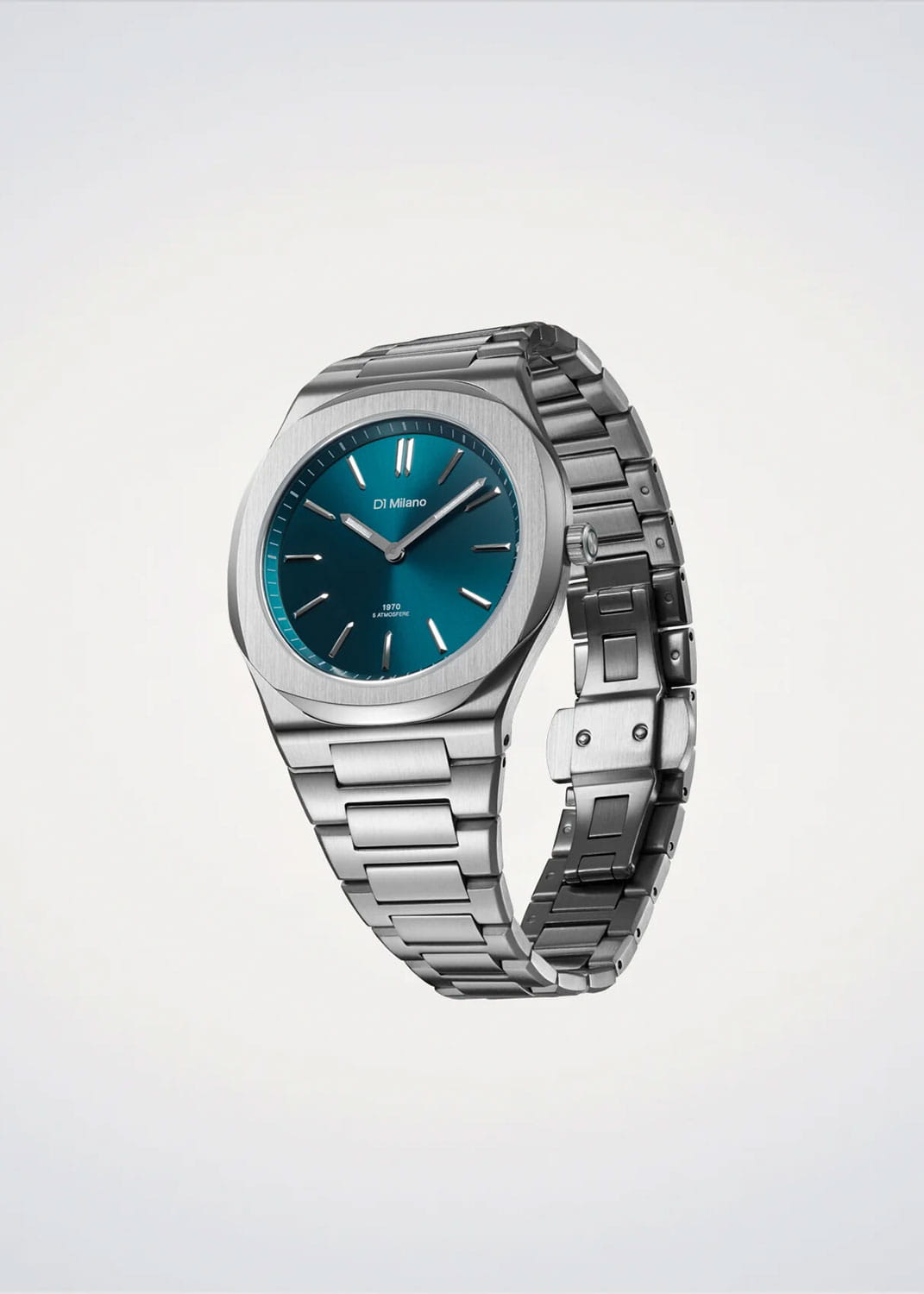 Мужские кварцевые часы D1 Milano Ultra Thin UHBJ03 — это стильное сочетание элегантности и современного дизайна. Изящный ультратонкий корпус выполнен из нержавеющей стали, диаметром 39 мм, что придаст образу элегантности и надежности. Изысканный циферблат с метками в виде штрихов придает модели особый блеск. Циферблат защищен сапфировым стекломСапфировое стеклоПрочный и надёжный материал из кристалла сапфира синтетического происхождения, характеризующийся особой твёрдостью и устойчивостью к царапинам и повреждениям. с антибликовым покрытиемАнтибликовое покрытиеСлой оксида металла в 0,13-0,3 микрон, благодаря которому стекло часов не бликует и не отражает свет. Антибликовое покрытие уменьшает отражение света в 10 раз, обеспечивая отличную читаемость показателей циферблата., обеспечивающий устойчивость к царапинам. Стрелки с люминесцентным покрытиемЛюминесцентное покрытиеПозволяет считывать показания времени в темноте. Производители наносят на стрелки, часовые индексы, безель или поверхность циферблата светонакопительный состав, дающий холодное свечение.. Часы оснащены надежным кварцевым механизмом. Стальной браслет на застёжке-бабочке с кнопкамиЗастёжка "бабочка"Такой вид застёжки дополняется предохранителями, помогающими избежать случайного раскрытия браслета. Обладают изящным исполнением. , гарантирует комфортное и безопасное ношение. Класс водозащиты: 50 метров позволит защитить корпус от случайных брызг или капель дождя. Отличный выбор для тех, кто ценит утонченность и качество.