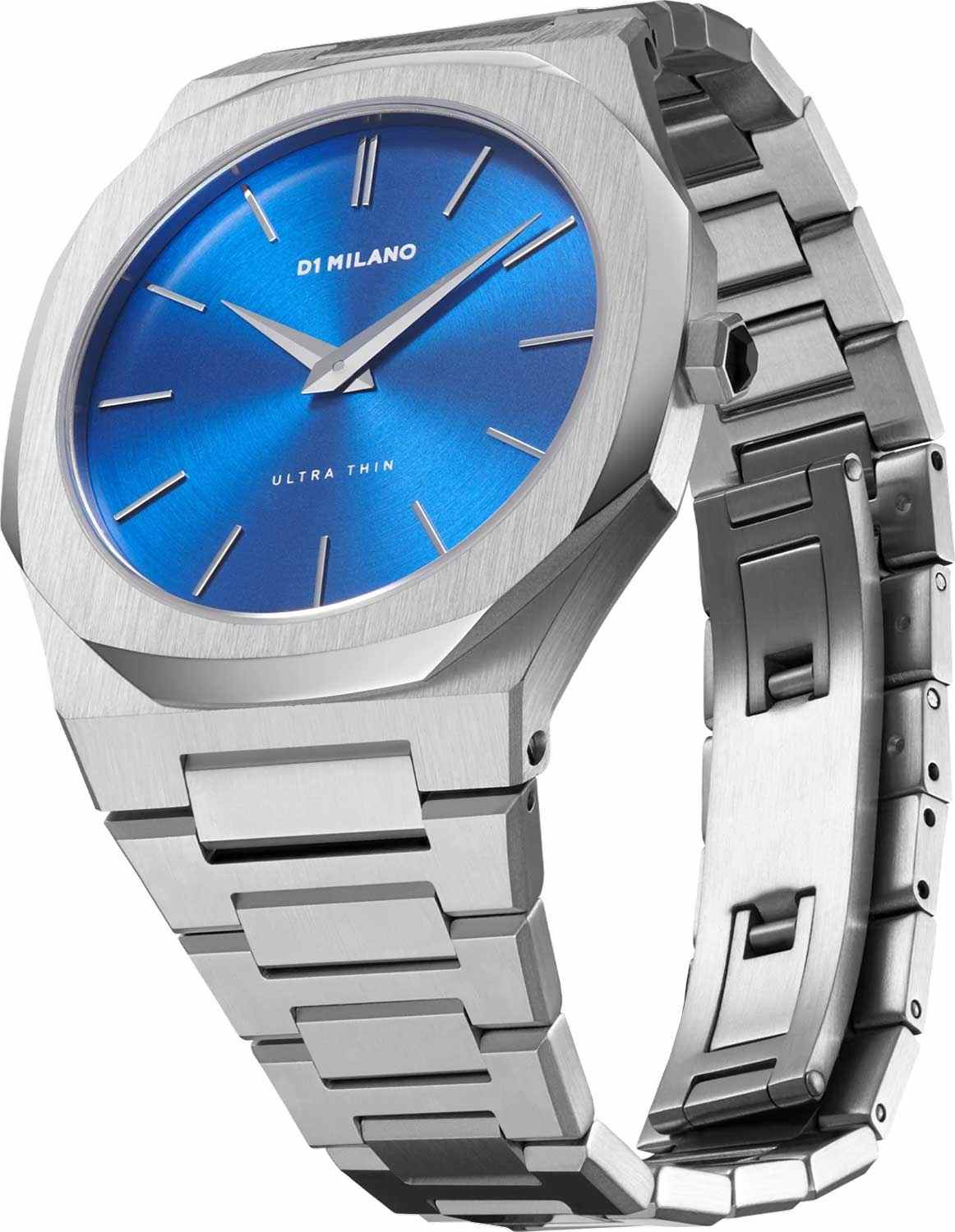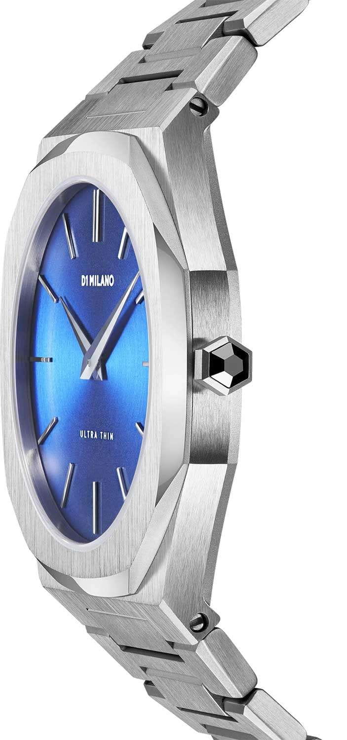 Часы D1 Milano UTBJ09 — это уникальные кварцевые часы, которые подчеркнут ваш изысканный стиль. Эти наручные часы из коллекции Ultra Thin с эффектным монохромным дизайном станут выразительным акцентом вашего образа. Корпус диаметром 40 мм из нержавеющей стали придает часам современный и утонченный вид. Синий циферблат метками в виде штрихов, а серебристые хроматические стрелки и индексы создают стильный контраст, подчёркивая элегантность модели. Задняя крышка из нержавеющей стали закреплена на 8-х винтах и дополнена индивидуальным серийным номером, что подчеркивает уникальность каждого экземпляра. Стальной браслет с раскладной застёжкойРаскладная застёжкаТакой тип застёжки используется только на браслетах из металла. Она никогда не раскрывается полностью, происходит разделение на 2 и более частей. Раскладывающая застёжка снизит вероятность потери часов к минимуму. обеспечивает надежность и комфорт в повседневном использовании. Сапфировое стеклоСапфировое стеклоПрочный и надёжный материал из кристалла сапфира синтетического происхождения, характеризующийся особой твёрдостью и устойчивостью к царапинам и повреждениям. с антибликовым покрытием защищает циферблат, а водозащита до 50WR делает эти часы практичным выбором для любых условий. Благодаря калибру Miyota 1L22, они отличаются точностью и надежностью. Эти итальянские часы представляют собой идеальное сочетание традиционного мастерства и инновационного подхода, воплощая в себе новый взгляд на классическую элегантность.