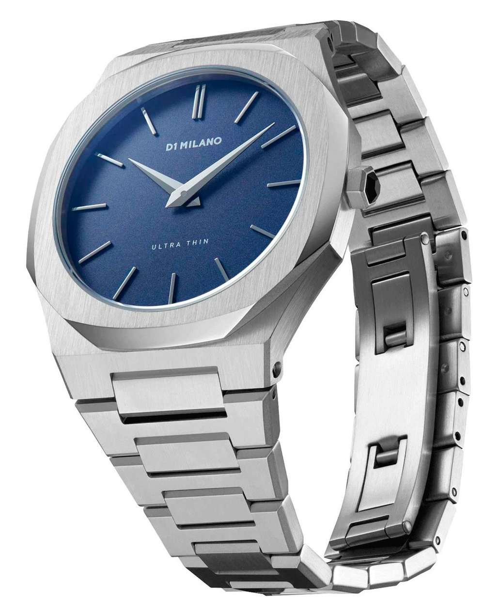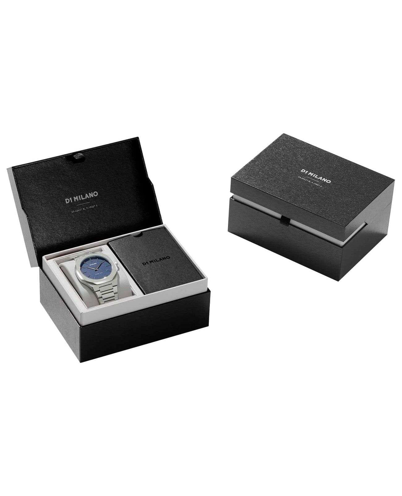 Наручные часы D1 Milano UTBU01 из коллекции Ultra Thin сочетают в себе элегантный дизайн и современные технологии. Модель обладает круглым корпусом диаметром 38 мм, изготовленным из нержавеющей стали, что обеспечивает высокую устойчивость к внешним воздействиям. Для защиты циферблата используется сапфировое стеклоСапфировое стеклоПрочный и надёжный материал из кристалла сапфира синтетического происхождения, характеризующийся особой твёрдостью и устойчивостью к царапинам и повреждениям., которое эффективно противостоит царапинам и механическим повреждениям. Часы оснащены автоматическим механизмом Miyota 1L22. Водонепроницаемость модели достигает 5 атмосфер (50 метров), что позволяет использовать их при контакте с водой, например, во время мытья рук или дождя. Браслет выполнен из нержавеющей стали с раскладной застежкойРаскладной замокДанный вариант застежки используется только на часах с металлическим браслетом. Отличительная особенность такого крепления в том, что длина браслета становится универсальной и вы можете самостоятельно отрегулировать нужный вам размер – застежка просто двигается по браслету часов., обеспечивающей комфортное ношение и безопасность. Циферблат с метками в виде штрихов делает их идеальным выбором для повседневного использования или особых случаев.