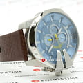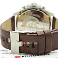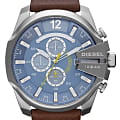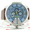 Крупные мужские наручные часы с хронографом и датой. Круглый корпус из нержавеющей стали, на кожаном ремешке коричневого цвета.