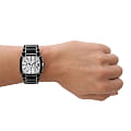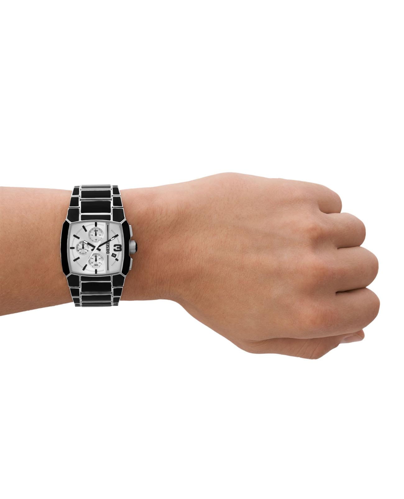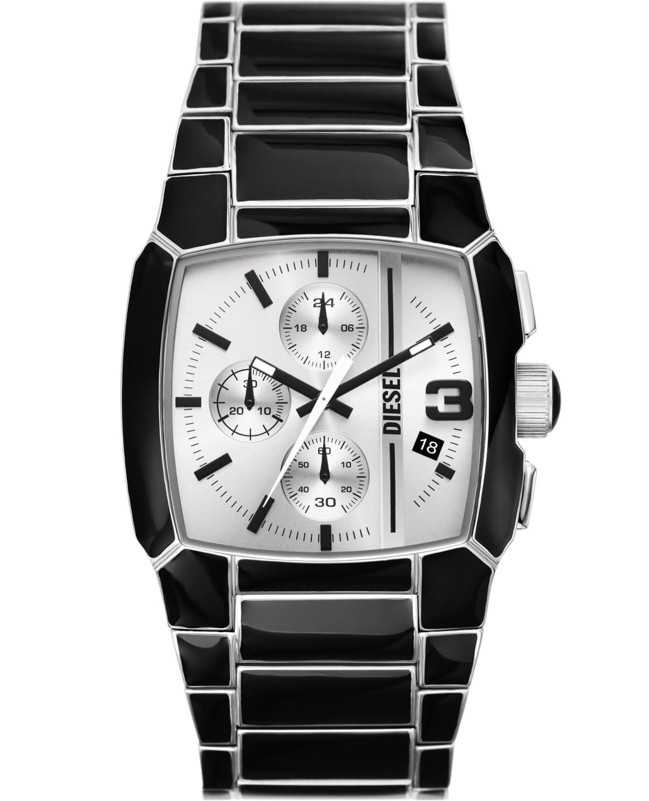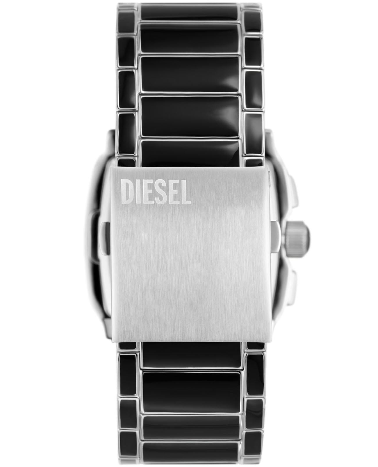 Мужские наручные часы-хронографХронографФункция позволяет измерять отрезки времени с особой точностью: часы, минуты, секунды. Верным признаком хронографа является наличие на циферблате 3 дополнительных окошек-счётчиков. с секундомеромСекундомерСекундоме́р — прибор, способный измерять интервалы времени с точностью до долей секунды. Diesel Cliffhanger DZ4646, кварцевый механизм с высокой точностью. Минеральное стеклоМинеральное стеклоМинеральное стекло представляет собой искусственно выращенный минерал кварца. Такое стекло отличается особой устойчивостью к повреждениям и царапинам. Уступает по некоторым качествам сапфировому стеклу. устойчивое к мелким механическим повреждениям. Класс водозащиты: 50 метров, позволит защитить корпус от случайных брызг или капель дождя. Корпус и браслет часов изготовлены из стали с частичным IP-покрытиемIP-покрытиеМетод ионного напыления. Демонстрирует повышенную устойчивость к истиранию, окислению и химическим веществам. Под воздействием высокого давления и температуры около 1500°C молекулы металла надёжно соединяются с частицами корпуса часов.. Стальной браслет на раскладной застёжкеРаскладная застёжкаТакой тип застёжки используется только на браслетах из металла. Она никогда не раскрывается полностью, происходит разделение на 2 и более частей. Раскладывающая застёжка снизит вероятность потери часов к минимуму.. Окошко даты в области 4 часов.Стрелки с люминесцентным покрытиемЛюминесцентное покрытиеПозволяет считывать показания времени в темноте. Производители наносят на стрелки, часовые индексы, безель или поверхность циферблата светонакопительный состав, дающий холодное свечение..