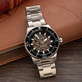 Мужские наручные часы с минеральным стекломМинеральное стеклоМинеральное стекло представляет собой искусственно выращенный минерал кварца. Такое стекло отличается особой устойчивостью к повреждениям и царапинам. Уступает по некоторым качествам сапфировому стеклу. Earnshaw Wallis ES-8227-11, механический механизм с автоподзаводом. Класс водозащиты: 50 метров, позволит защитить корпус от случайных брызг или капель дождя. Корпус часов изготовлен из стали. Центральные часовая, минутная и секундная стрелки. Отображение даты в малом циферблате. Фазы Луны. Черный циферблат с открытым балансом хода. Круглый корпус выполнен из нержавеющей стали. Раскладная застёжкаРаскладная застёжкаТакой тип застёжки используется только на браслетах из металла. Она никогда не раскрывается полностью, происходит разделение на 2 и более частей. Раскладывающая застёжка снизит вероятность потери часов к минимуму.