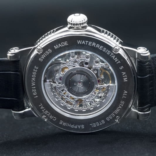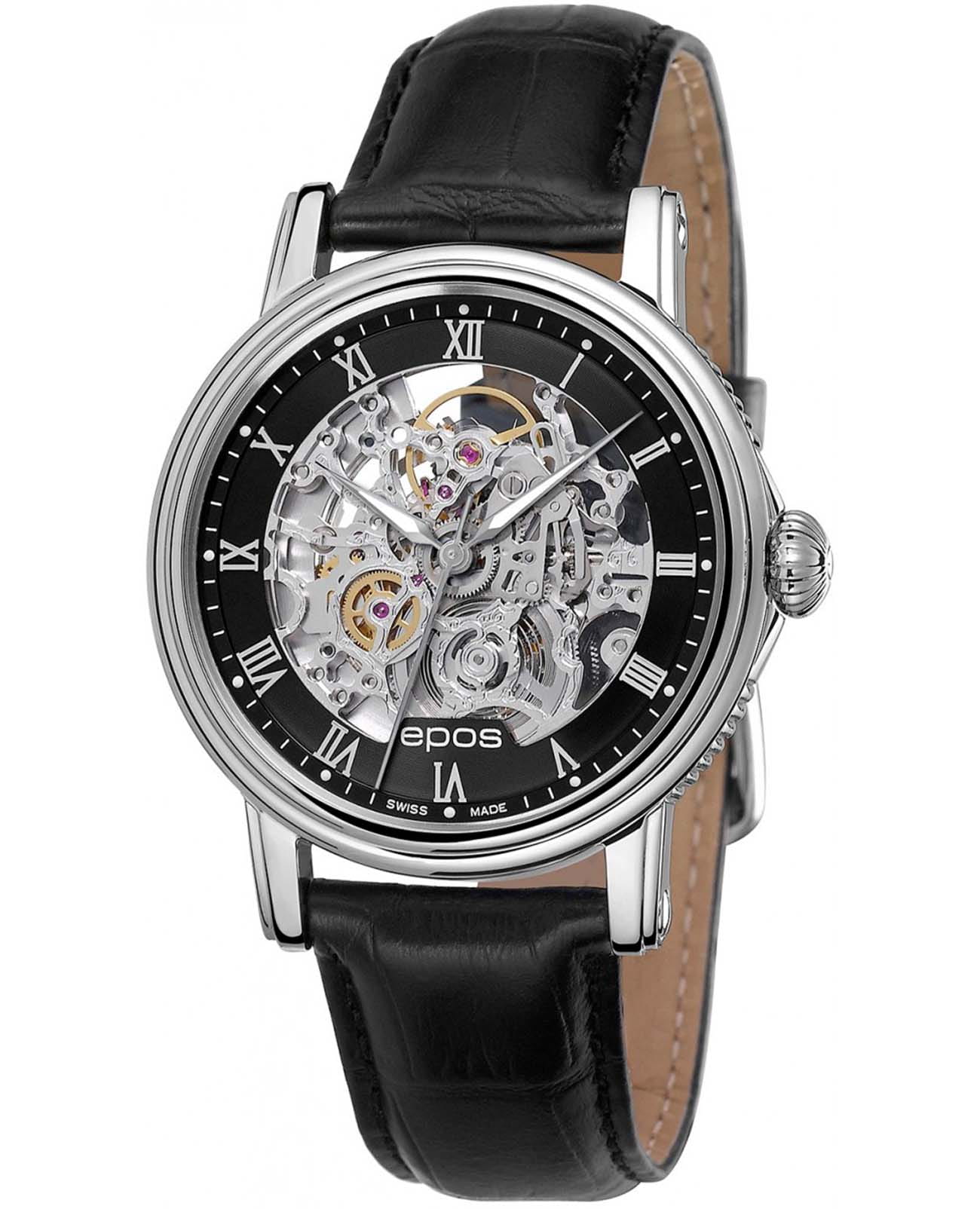 Мужские механические часы с автоподзаводом Epos — это сочетание швейцарского мастерства и современного дизайна. Корпус диаметром 41 мм выполнен из нержавеющей стали 316L. Циферблат чёрного цвета частично скелетонизирован, оформлен римскими цифрами и дополнен гильошированным узором. Циферблат защищён сапфировым стекломСапфировое стеклоПрочный и надёжный материал из кристалла сапфира синтетического происхождения, характеризующийся особой твёрдостью и устойчивостью к царапинам и повреждениям.. Стрелки и метки с люминесцентным покрытиемЛюминесцентное покрытиеПозволяет считывать показания времени в темноте. Производители наносят на стрелки, часовые индексы, безель или поверхность циферблата светонакопительный состав, дающий холодное свечение., обеспечивающим хорошую читаемость в темноте. Механизм — швейцарский калибр ETA 2892, декорированный вручную. Прозрачная задняя крышка позволяет наблюдать за работой механизма. Заводная головка — завинчивающаяся. Часы оснащены кожаным ремешком чёрного цвета с стандартной застёжкой. Водонепроницаемость 50 м позволяет использовать часы в повседневных условиях, защищая от случайных брызг и капель дождя. Гарантия — 24 месяца. Универсальный выбор для ценителя механики и элегантного стиля.