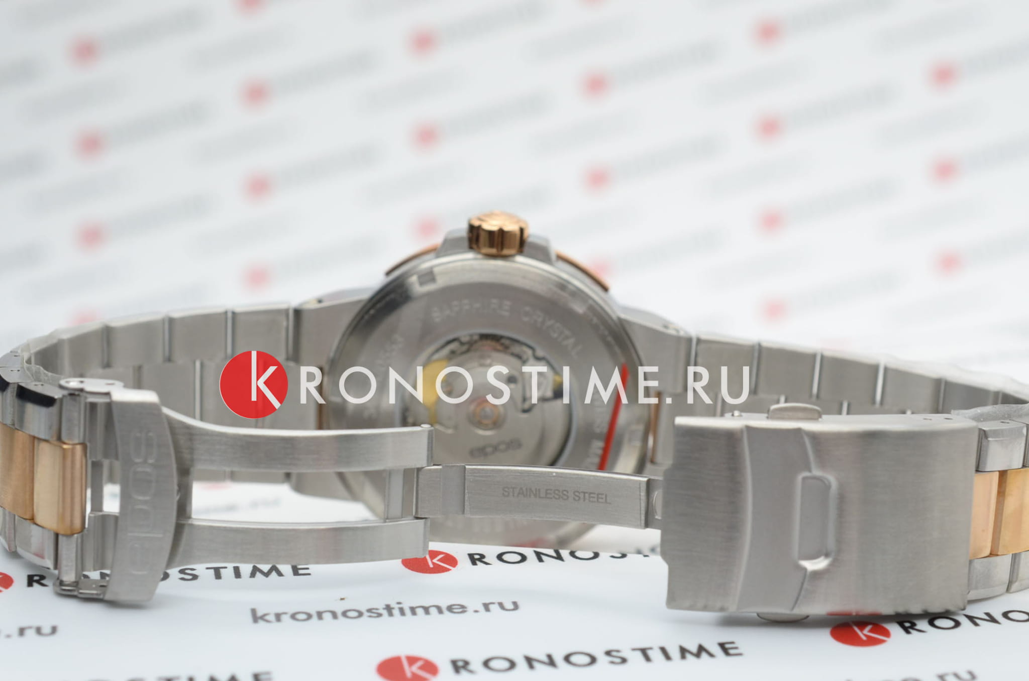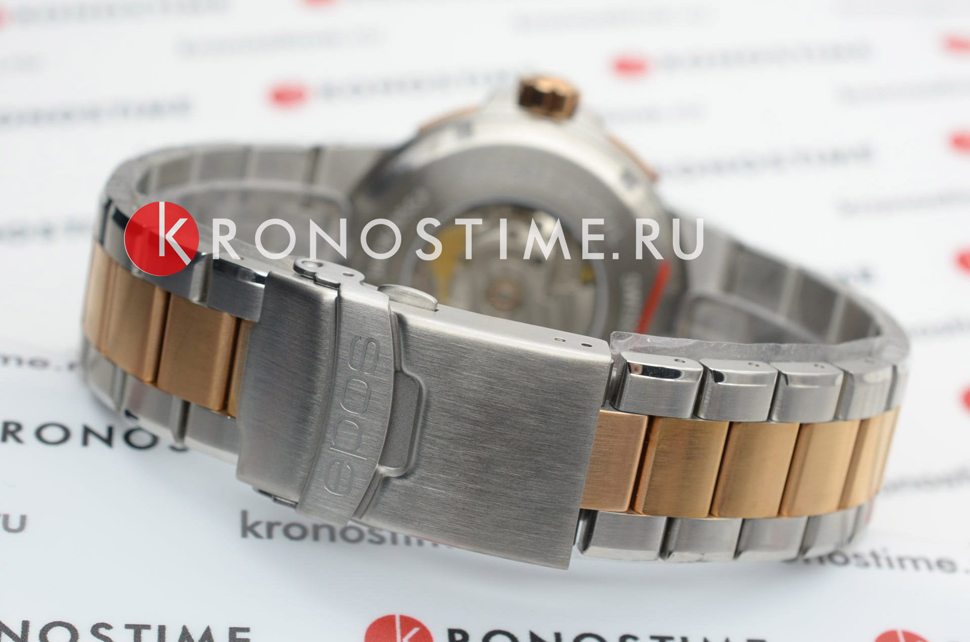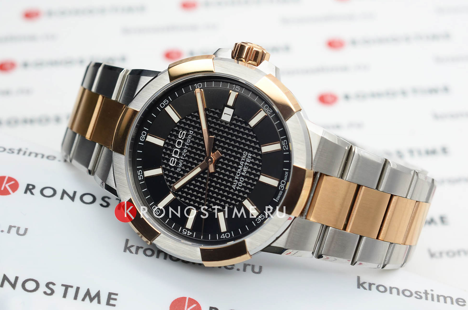 Мужские механические часы с автоподзаводом Epos из коллекции Sportive — это стильный аксессуар с швейцарским качеством и современным дизайном. Корпус диаметром 43,8 мм и толщиной 10,6 мм выполнен из нержавеющей стали 316L с PVD-покрытиемPVDУльтратонкое покрытие наносится в технике вакуумного напыления, сочетает в себе нитрид титана особой прочности со слоем золота или оксида хрома. Несёт в себе декоративную или защитную функцию.. Циферблат чёрного цвета оформлен метками и стрелками с люминесцентным покрытиемЛюминесцентное покрытиеПозволяет считывать показания времени в темноте. Производители наносят на стрелки, часовые индексы, безель или поверхность циферблата светонакопительный состав, дающий холодное свечение., обеспечивающим хорошую читаемость в темноте. Циферблат защищён сапфировым стекломСапфировое стеклоПрочный и надёжный материал из кристалла сапфира синтетического происхождения, характеризующийся особой твёрдостью и устойчивостью к царапинам и повреждениям.. Механизм — швейцарский калибр ETA 2824 с запасом хода 38 часов. Окошко даты расположено в положении 3 часов. Прозрачная задняя крышка позволяет наблюдать за работой декорированного механизма. Часы оснащены стальным браслетом комбинированного цвета на раскладной застёжкеРаскладная застёжкаТакой тип застёжки используется только на браслетах из металла. Она никогда не раскрывается полностью, происходит разделение на 2 и более частей. Раскладывающая застёжка снизит вероятность потери часов к минимуму.. Водонепроницаемость 100 м позволяет использовать часы для плавания и повседневного ношения. Гарантия — 24 месяца. Универсальный выбор для ценителя механики и элегантного стиля.