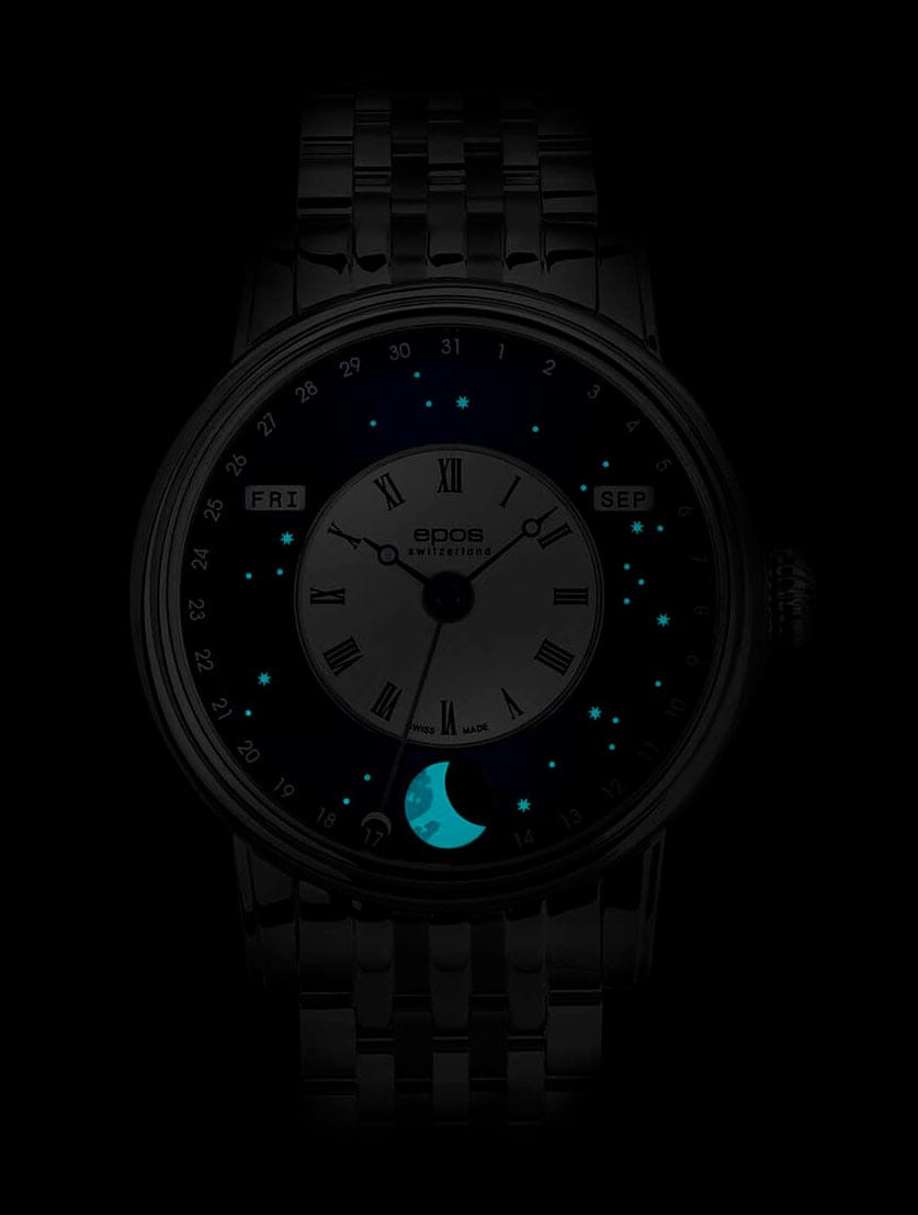 Мужские швейцарские механические часы с автоподзаводом Epos Oeuvre d'art 3439.322.20.26.30. Сапфировое стеклоСапфировое стеклоПрочный и надёжный материал из кристалла сапфира синтетического происхождения, характеризующийся особой твёрдостью и устойчивостью к царапинам и повреждениям. устойчивое к появлению царапин, обладающее высокой прозрачностью. Корпус часов изготовлен из нержавеющей стали. В механизме 25 камней, частота 28800 полуколебаний в час. Запас хода 42 часа. Механизм декорирован узором Cotes de Geneve. Циферблат в виде симбиоза белой лакированной вставки с римскими цифрами и вставки в виде ночного неба, выполненной по технологии Sunray (солнечные лучи). Светящиеся звезды  и большая луна с люминесцентной подсветкойЛюминесцентное покрытиеПозволяет считывать показания времени в темноте. Производители наносят на стрелки, часовые индексы, безель или поверхность циферблата светонакопительный состав, дающий холодное свечение.. Дата отображается центральной стрелкой. Окошко дня недели и месяца. Автоматический указатель фазы луны. Винтажная заводная головка. Прозрачная задняя крышка. Класс водозащиты: 50 метров, позволит защитить корпус от случайных брызг или капель дождя. Стальной браслет на раскладной застёжкеРаскладная застёжкаТакой тип застёжки используется только на браслетах из металла. Она никогда не раскрывается полностью, происходит разделение на 2 и более частей. Раскладывающая застёжка снизит вероятность потери часов к минимуму..
