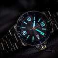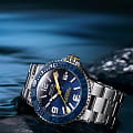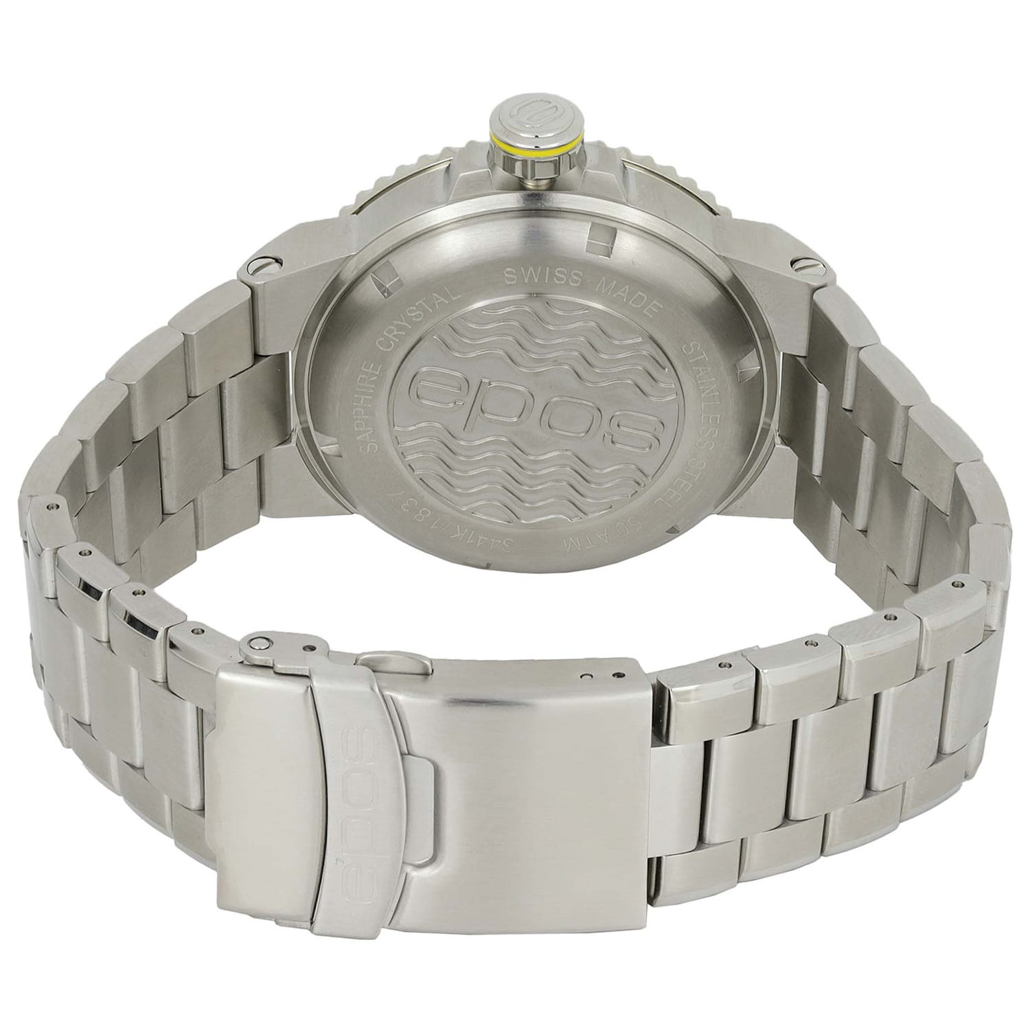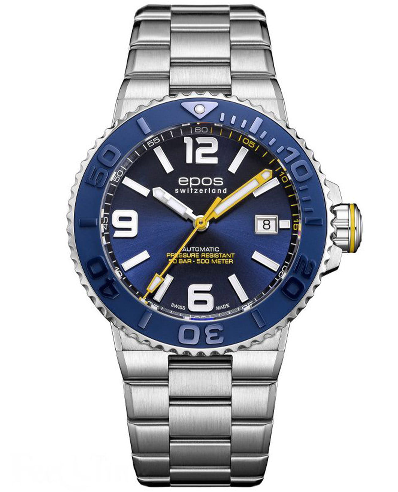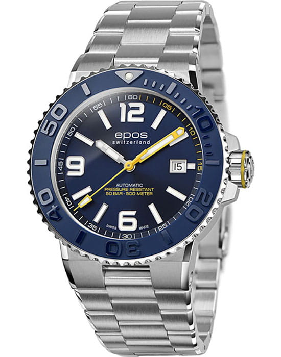 Мужские механические часы с автоподзаводом Epos из коллекции Diver — это профессиональный дайверский инструмент с швейцарским качеством. Корпус диаметром 43 мм и толщиной 14 мм выполнен из нержавеющей стали 316L с PVD-покрытиемPVDУльтратонкое покрытие наносится в технике вакуумного напыления, сочетает в себе нитрид титана особой прочности со слоем золота или оксида хрома. Несёт в себе декоративную или защитную функцию.. Циферблат синего цвета с пескоструйной обработкой оформлен аппликациями часовых индексов и крупными цифрами с покрытием. Циферблат защищён сапфировым стекломСапфировое стеклоПрочный и надёжный материал из кристалла сапфира синтетического происхождения, характеризующийся особой твёрдостью и устойчивостью к царапинам и повреждениям.. Стрелки и метки с люминесцентным покрытиемЛюминесцентное покрытиеПозволяет считывать показания времени в темноте. Производители наносят на стрелки, часовые индексы, безель или поверхность циферблата светонакопительный состав, дающий холодное свечение. Super-Luminova, обеспечивающим отличную читаемость в темноте. Механизм — швейцарский калибр ETA 2824. Окошко даты расположено в положении 3 часов. БезельБезельВнешний ободок, закрепляющий стекло. В спортивных часах так называется поворотное кольцо с делениями на циферблате, выполняет роль таймера – замеряет отрезки времени на шкале. Неподвижный безель – элемент декора. Однонаправленно вращающийся безель на дайверских часах позволяет фиксировать моменты погружения и выныривания на поверхность. — однонаправленный вращающийся, с синей керамической накладкой и рельефной шкалой погружений. Завинчивающаяся коронка и задняя крышка обеспечивают повышенную защиту. Часы оснащены стальным браслетом с литыми звеньями в 3 ряда и раскладной застёжкойРаскладная застёжкаТакой тип застёжки используется только на браслетах из металла. Она никогда не раскрывается полностью, происходит разделение на 2 и более частей. Раскладывающая застёжка снизит вероятность потери часов к минимуму. с двойной блокировкой и дополнительным фиксатором. Автоматический гелиевый клапан позволяет использовать часы при профессиональном дайвинге. Водонепроницаемость 500 м соответствует требованиям для глубоководных погружений. Гарантия — 24 месяца. Идеальный выбор для тех, кто ценит надёжность, точность и экстремальные испытания.