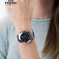 Женские кварцевые часы-хронографХронографФункция позволяет измерять отрезки времени с особой точностью: часы, минуты, секунды. Верным признаком хронографа является наличие на циферблате 3 дополнительных окошек-счётчиков. с секундомеромСекундомерСекундоме́р — прибор, способный измерять интервалы времени с точностью до долей секунды. Festina Boyfriend F20397/2, кварцевый механизм с высокой точностью. Минеральное стеклоМинеральное стеклоМинеральное стекло представляет собой искусственно выращенный минерал кварца. Такое стекло отличается особой устойчивостью к повреждениям и царапинам. Уступает по некоторым качествам сапфировому стеклу. устойчивое к мелким механическим повреждениям. Класс водозащиты: 100 метров, позволит плавать, нырять и заниматься другими водными видами спорта. Корпус часов изготовлен из стали. Стальной браслет на раскладной застёжкеРаскладная застёжкаТакой тип застёжки используется только на браслетах из металла. Она никогда не раскрывается полностью, происходит разделение на 2 и более частей. Раскладывающая застёжка снизит вероятность потери часов к минимуму.. Рифленая заводная головка с защитой. Стрелки и метки с люминесцентным покрытиемЛюминесцентное покрытиеПозволяет считывать показания времени в темноте. Производители наносят на стрелки, часовые индексы, безель или поверхность циферблата светонакопительный состав, дающий холодное свечение..