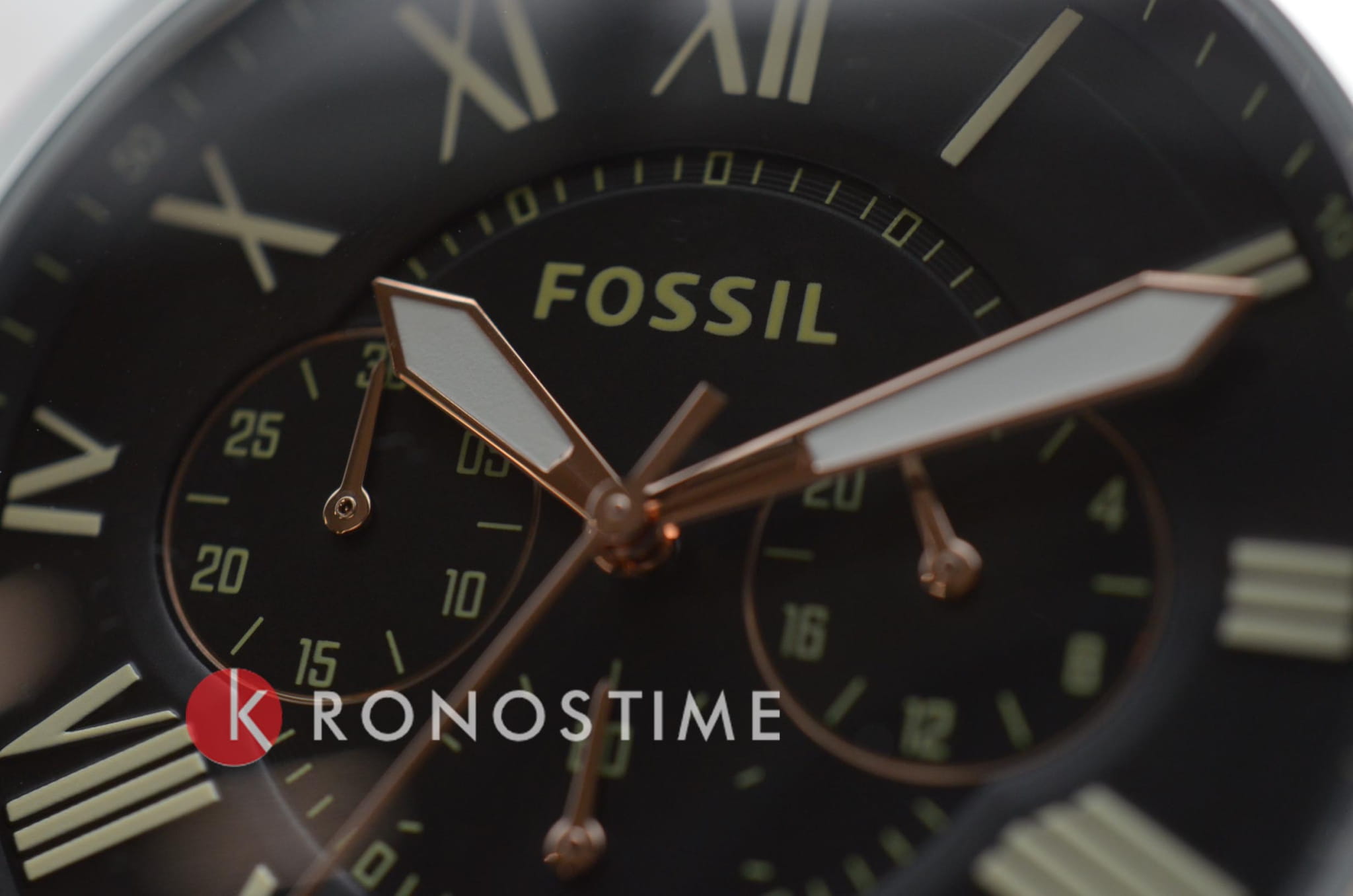 Рельефный циферблат с накладными золотистыми часовыми метками и счетчиками хронографа.