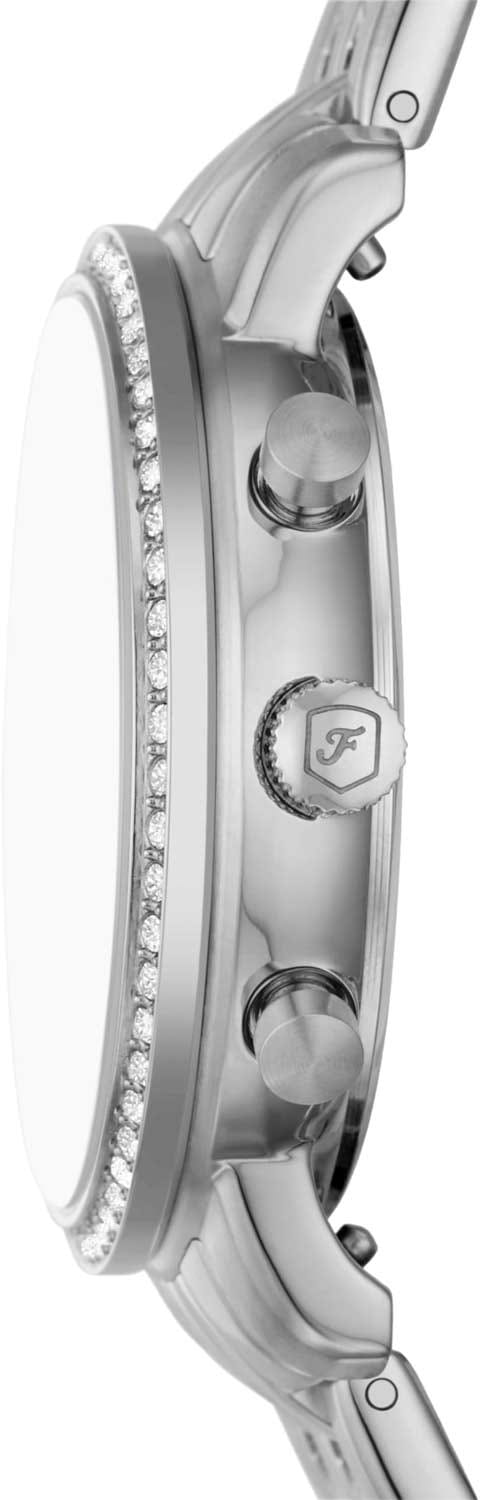Fossil ES5357 – это изысканные женские часы-хронографХронографФункция позволяет измерять отрезки времени с особой точностью: часы, минуты, секунды. Верным признаком хронографа является наличие на циферблате 3 дополнительных окошек-счётчиков. с секундомеромСекундомерСекундоме́р — прибор, способный измерять интервалы времени с точностью до долей секунды., которые станут идеальным дополнением к вашему стилю, предлагая баланс между функциональностью и эстетикой. Эти часы изготовлены в США и оснащены надежным кварцевым механизмом, что обеспечивает точность и долговечность. Корпус часов выполнен из прочной стали, а безельБезельВнешний ободок, закрепляющий стекло. В спортивных часах так называется поворотное кольцо с делениями на циферблате, выполняет роль таймера – замеряет отрезки времени на шкале. Неподвижный безель – элемент декора. Однонаправленно вращающийся безель на дайверских часах позволяет фиксировать моменты погружения и выныривания на поверхность. украшен кристаллами, добавляя блеска и шарма. Белый перламутровый циферблат гармонично сочетается с маркировкой в виде штрихов и римскими цифрами VI и XII, придавая часам классический вид. Окошко даты, расположенное между отметками 4 и 5 часов, добавляет удобства в повседневном использовании. Часы обладают водозащитой 50WR, что позволяет не беспокоиться о случайных попаданиях влаги. Минеральное стеклоМинеральное стеклоМинеральное стекло представляет собой искусственно выращенный минерал кварца. Такое стекло отличается особой устойчивостью к повреждениям и царапинам. Уступает по некоторым качествам сапфировому стеклу. защищает циферблат от царапин и повреждений. Стрелки с люминесцентным покрытиемЛюминесцентное покрытиеПозволяет считывать показания времени в темноте. Производители наносят на стрелки, часовые индексы, безель или поверхность циферблата светонакопительный состав, дающий холодное свечение. позволяют легко считывать время даже в условиях низкой освещенности. Стальной браслет с раскладной застёжкойРаскладная застёжкаТакой тип застёжки используется только на браслетах из металла. Она никогда не раскрывается полностью, происходит разделение на 2 и более частей. Раскладывающая застёжка снизит вероятность потери часов к минимуму. обеспечивает комфортное ношение и надежную фиксацию на запястье, с габаритными размерами 36 мм в диаметре, шириной браслета 16 мм и длиной 175 мм. Эти часы — прекрасный выбор для тех, кто ценит стиль и качество в каждом элементе аксессуара.