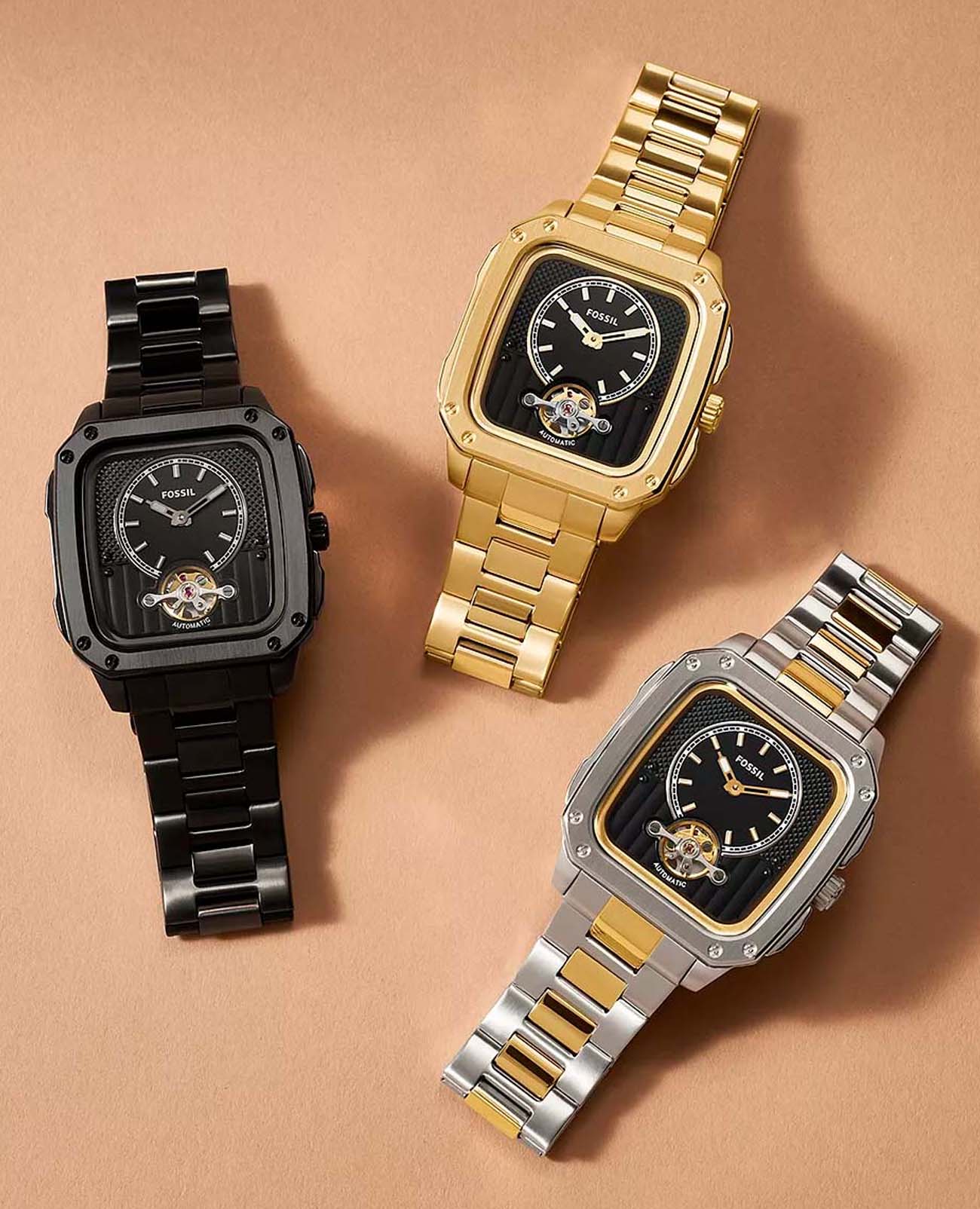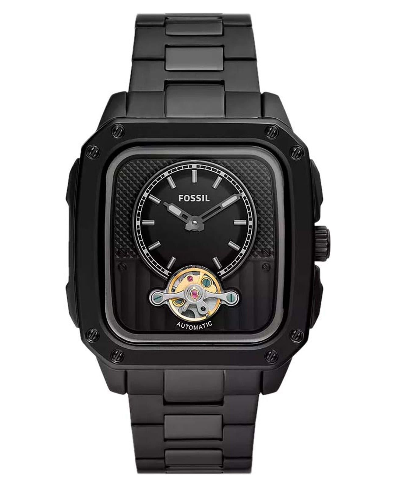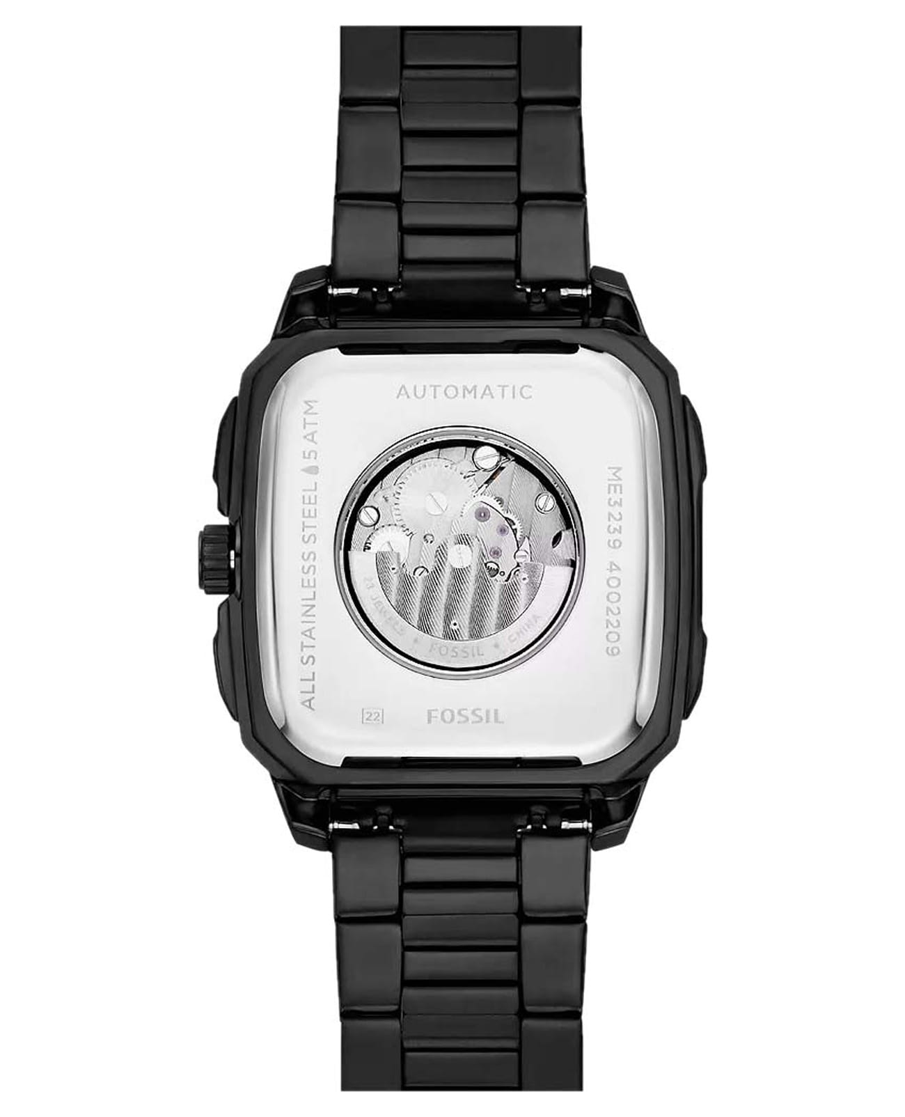 Мужские американские механические часы с автоподзаводом и с минеральным стекломМинеральное стеклоМинеральное стекло представляет собой искусственно выращенный минерал кварца. Такое стекло отличается особой устойчивостью к повреждениям и царапинам. Уступает по некоторым качествам сапфировому стеклу. Fossil Inscription ME3238, кварцевый механизм с высокой точностью. Прямоугольный корпус часов изготовлен из нержавеющей стали с IP-покрытиемIP-покрытиеМетод ионного напыления. Демонстрирует повышенную устойчивость к истиранию, окислению и химическим веществам. Под воздействием высокого давления и температуры около 1500°C молекулы металла надёжно соединяются с частицами корпуса часов.. БезельБезельВнешний ободок, закрепляющий стекло. В спортивных часах так называется поворотное кольцо с делениями на циферблате, выполняет роль таймера – замеряет отрезки времени на шкале. Неподвижный безель – элемент декора. Однонаправленно вращающийся безель на дайверских часах позволяет фиксировать моменты погружения и выныривания на поверхность. дополнен стильными винтами. Прозрачное окошко на текстурированном циферблате позволяет наблюдать за мерным ходом часового механизма. Метки в виде штрихов. Метки и стрелки с люминесцентным покрытиемЛюминесцентное покрытиеПозволяет считывать показания времени в темноте. Производители наносят на стрелки, часовые индексы, безель или поверхность циферблата светонакопительный состав, дающий холодное свечение.. Рифленая заводная головка с защитой. Класс водозащиты: 50 метров, позволит защитить корпус от случайных брызг или капель дождя. Стальной браслет с IP-покрытиемIP-покрытиеМетод ионного напыления. Демонстрирует повышенную устойчивость к истиранию, окислению и химическим веществам. Под воздействием высокого давления и температуры около 1500°C молекулы металла надёжно соединяются с частицами корпуса часов. на раскладной застёжкеРаскладная застёжкаТакой тип застёжки используется только на браслетах из металла. Она никогда не раскрывается полностью, происходит разделение на 2 и более частей. Раскладывающая застёжка снизит вероятность потери часов к минимуму..