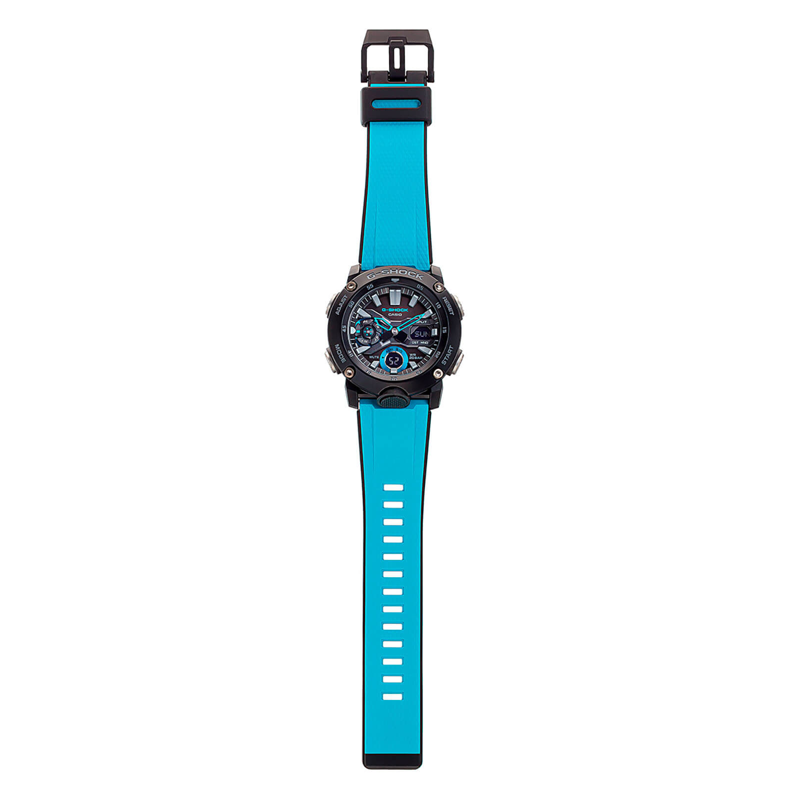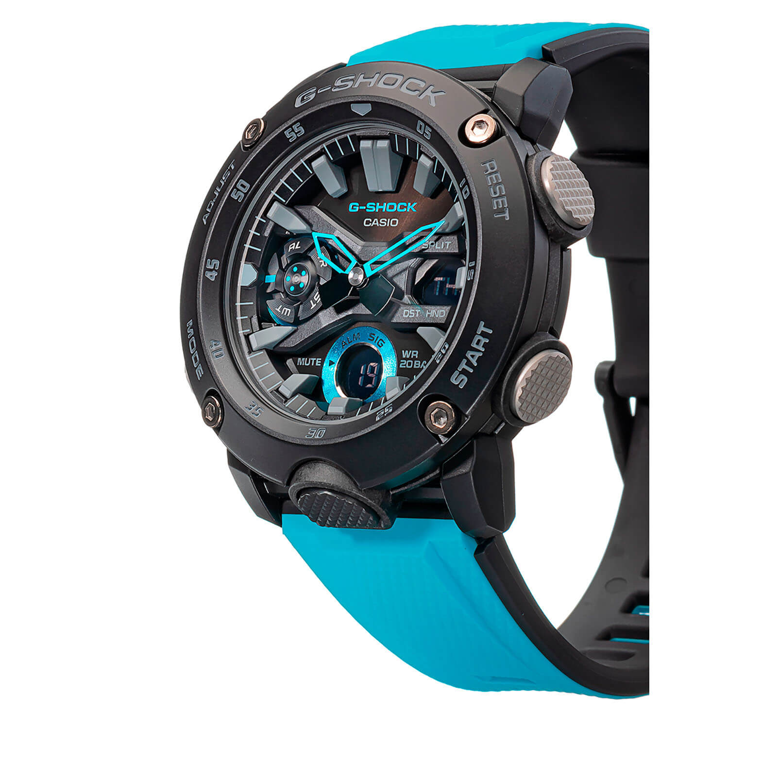 Массивный тёмный аксессуар дополнен голубыми цветовыми акцентами в виде деталей на циферблате и полимерного браслета. Наручные часы в спортивном стиле имеют противоударный корпусУдаропрочный корпусМеханизм заключён в корпус, выполненный из современных материалов, устойчивых к ударам, механическим повреждениям и падению с высоты: инновационный пластик, карбон, нержавеющая сталь, титан., выдерживающий большие нагрузки, он сделан по технологии Carbon Core GuardCarbon Core Guard Новейшая структура корпуса, разработанная Casio. Полиуретановая пластина дополнительно усилена карбоновыми вставками, что придаёт специальную защиту от механических повреждений. Карбон отличается лёгкостью и прочностью.. Кварцевый механизм получает питание от батарейки, срок её службы - 3 года. Двойная подсветка циферблата и дисплеев. Минеральное стекло. Водостойкость 20 бар. Двойная задняя крышка: первая из стали, вторая из пластика. Функционал: таймер, будильник, хронографХронографФункция позволяет измерять отрезки времени с особой точностью: часы, минуты, секунды. Верным признаком хронографа является наличие на циферблате 3 дополнительных окошек-счётчиков., секундомер, автоматический календарь, мировое времяМировое время Полезное часовое усложнение, отображающее время в основных городах и известных областях по всему миру, оно связано с часовыми поясами, удобно для путешественников и бизнесменов. . Габариты: 48,7 x 51,2 x 14,1 мм.