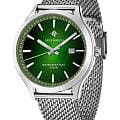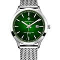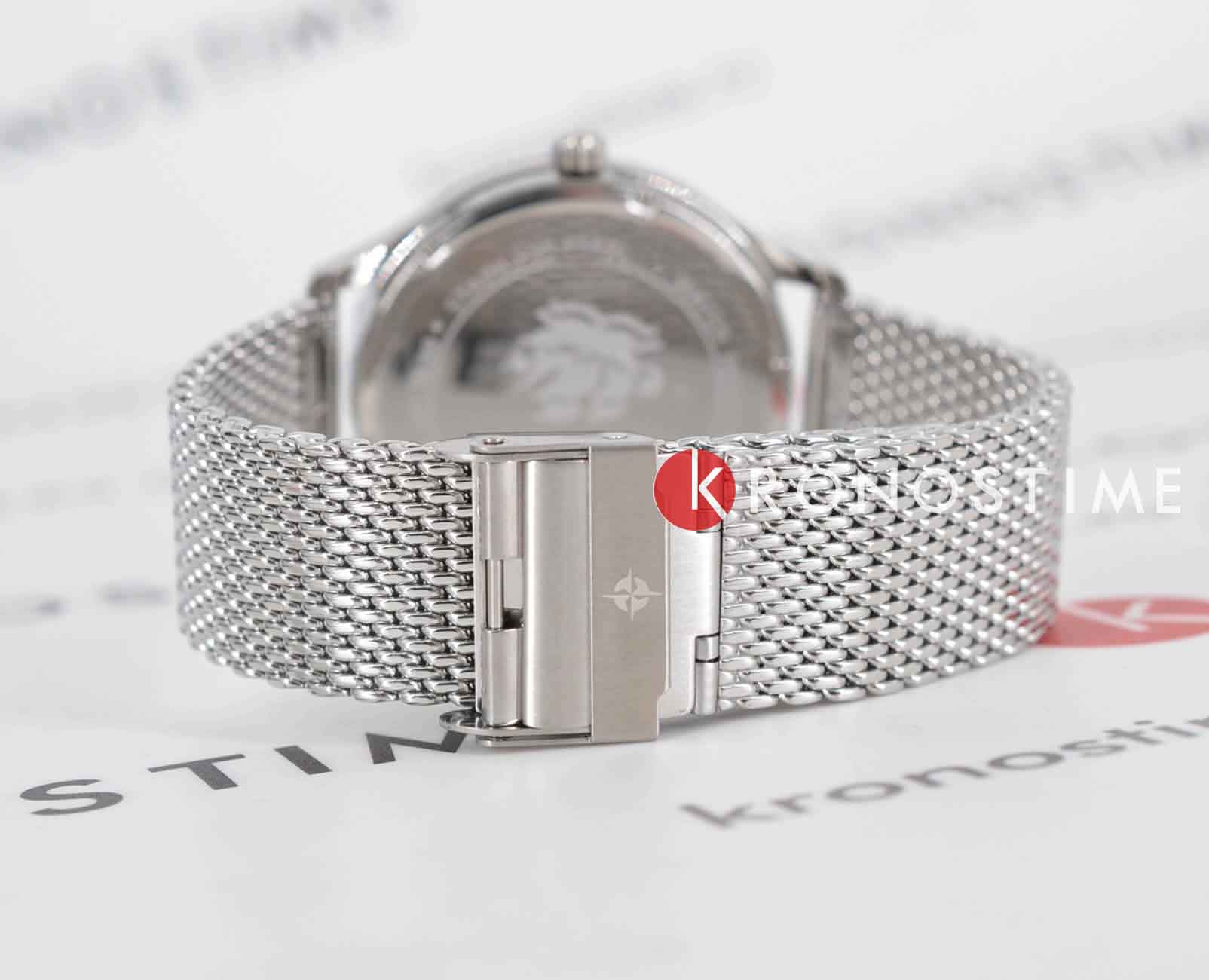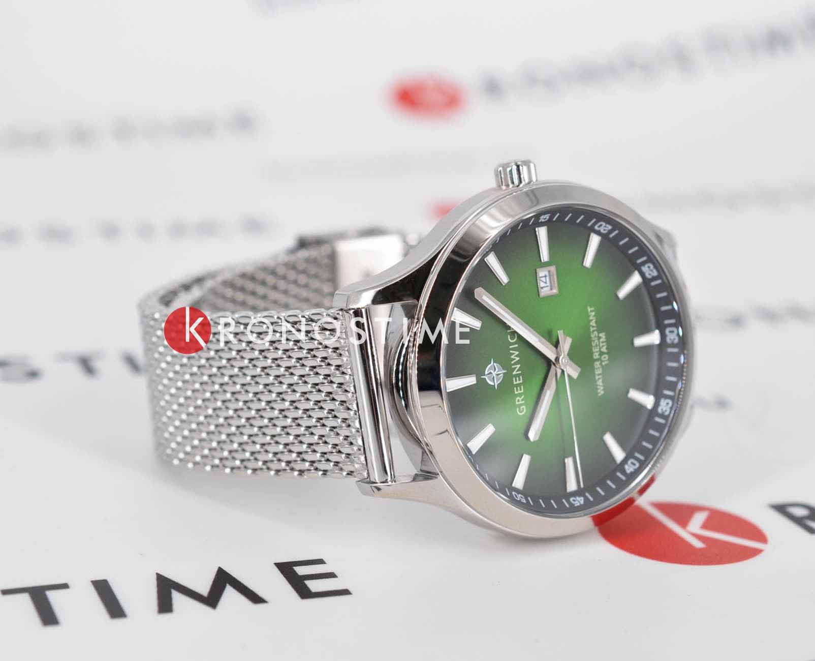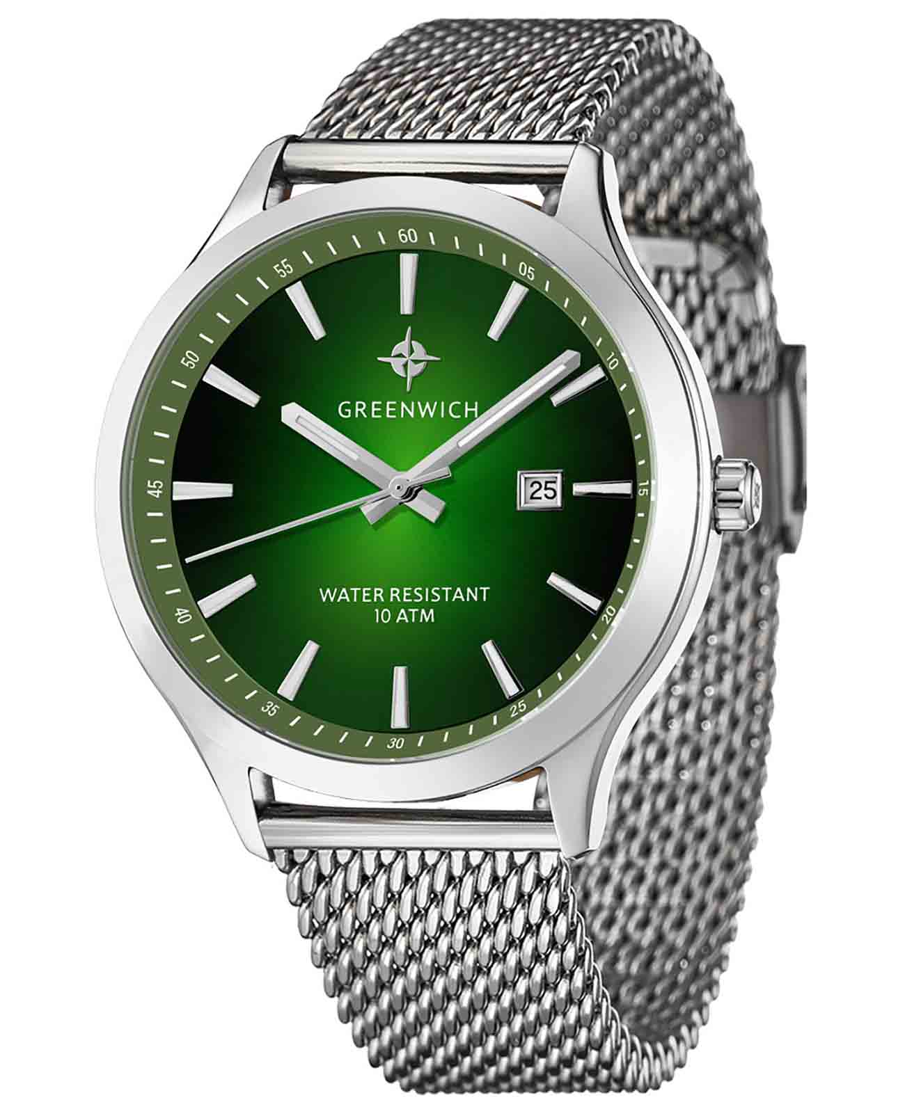 Часы Greenwich Helm GW 041.19.39— это стильная и надежная модель, сочетающая современные технологии и элегантный дизайн. Корпус часов выполнен из прочной гипоаллергенной нержавеющей стали с особой вертикальной матовой полировкой на боковой части, что придает корпусу визуальную тонкость и индивидуальность. Диаметр корпуса составляет 42 мм — оптимальный размер для повседневного использования. Внутри установлен надежный японский кварцевый механизм Miyota, который обеспечивает точность хода и долговечность. Зеленый циферблат часов отличается глубиной и объемом благодаря оригинальному внутреннему «колодцу» с нанесенной секундной разметкой. Полировка в стиле солнечных лучей придает поверхности изысканный блеск. Индексы в виде трапеций изготовлены вручную и закреплены на двух штифтах, а для удобства чтения времени в темноте на стрелки и индексы нанесено люминесцентное покрытиеЛюминесцентное покрытиеПозволяет считывать показания времени в темноте. Производители наносят на стрелки, часовые индексы, безель или поверхность циферблата светонакопительный состав, дающий холодное свечение.. Часовая и минутная стрелки имеют мечеобразную форму, что делает их визуально выразительными и легко читаемыми. Циферблат защищен прочным минеральным стекломМинеральное стеклоМинеральное стекло представляет собой искусственно выращенный минерал кварца. Такое стекло отличается особой устойчивостью к повреждениям и царапинам. Уступает по некоторым качествам сапфировому стеклу.. Водонепроницаемость модели составляет 10 ATM, что позволяет использовать часы во время занятий водными видами спорта. Завинчивающаяся задняя крышка обеспечивает дополнительную защиту от влаги. Часы оснащены литым металлическим браслетом с миланским плетением, который надежно фиксируется с помощью раскладного замкаРаскладной замокДанный вариант застежки используется только на часах с металлическим браслетом. Отличительная особенность такого крепления в том, что длина браслета становится универсальной и вы можете самостоятельно отрегулировать нужный вам размер – застежка просто двигается по браслету часов., предотвращающей случайное раскрытие. На циферблате и заводной головке размещён фирменный логотип марки — изображение «розы ветров», символизирующее удачу и новые открытия. Задняя крышка украшена гравировкой с изображением «розы ветров» и корабля, подчеркивающих морскую тематику бренда Greenwich.