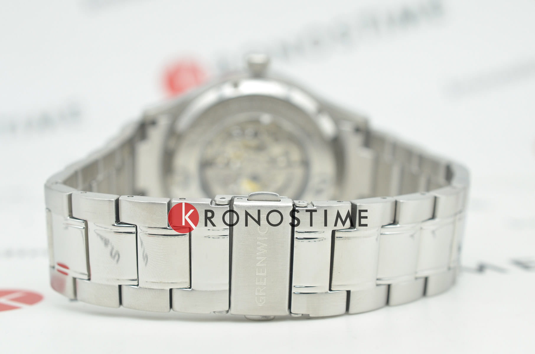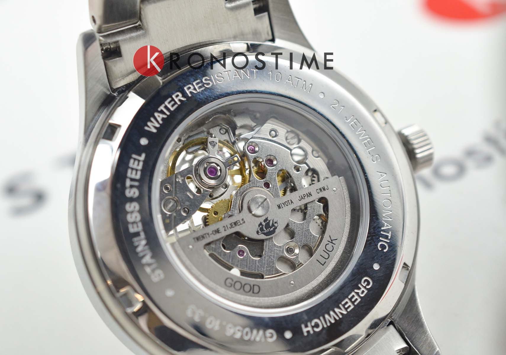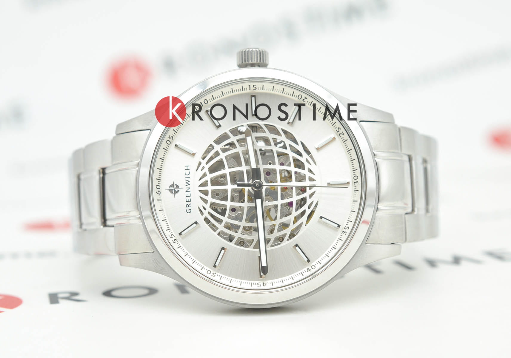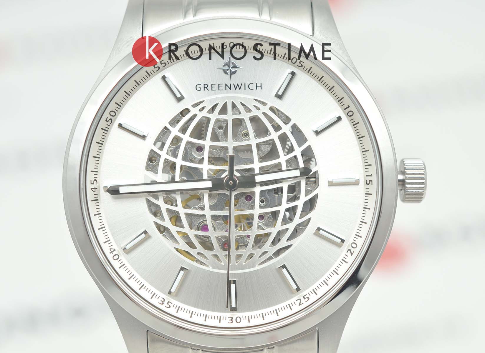 Мужские механические часы с минеральным стекломМинеральное стеклоМинеральное стекло представляет собой искусственно выращенный минерал кварца. Такое стекло отличается особой устойчивостью к повреждениям и царапинам. Уступает по некоторым качествам сапфировому стеклу. Greenwich Globe GW 056.10.33. Корпус часов изготовлен из стали. Стрелки с люминесцентным покрытиемЛюминесцентное покрытиеПозволяет считывать показания времени в темноте. Производители наносят на стрелки, часовые индексы, безель или поверхность циферблата светонакопительный состав, дающий холодное свечение.. Класс водозащиты: 100 метров, позволит плавать, нырять и заниматься другими водными видами спорта. Стальной браслет на раскладной застёжкеРаскладная застёжкаТакой тип застёжки используется только на браслетах из металла. Она никогда не раскрывается полностью, происходит разделение на 2 и более частей. Раскладывающая застёжка снизит вероятность потери часов к минимуму..