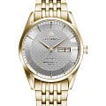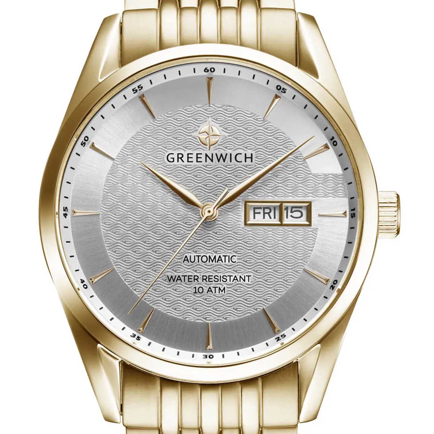 Мужские часы с минеральным стекломМинеральное стеклоМинеральное стекло представляет собой искусственно выращенный минерал кварца. Такое стекло отличается особой устойчивостью к повреждениям и царапинам. Уступает по некоторым качествам сапфировому стеклу. Greenwich Good Luck Classic GW 074.20.33, представляют собой классический вариант для повседневной носки. В центральной части циферблата — отличительная черта моделей этой серии: гильоше, объемные линии которого напоминают волны. Обратите внимание на форму пластины, где крепятся накладные риски: она сделана в форме латинской буквы G, первой буквы в названии бренда. Часы характеризуются традиционными формами, лаконичным исполнением, что делает модель элегантным дополнением к деловому костюму. Сквозь прозрачную заднюю крышку вы увидите детали механизма TMI с декорированным ротором: на нем выгравировано изображение символа английских моряков — парусника. Браслет и раскладная застёжкаРаскладная застёжкаТакой тип застёжки используется только на браслетах из металла. Она никогда не раскрывается полностью, происходит разделение на 2 и более частей. Раскладывающая застёжка снизит вероятность потери часов к минимуму. выполнены из гипоаллергенной нержавеющей стали с PVD-покрытиемPVDУльтратонкое покрытие наносится в технике вакуумного напыления, сочетает в себе нитрид титана особой прочности со слоем золота или оксида хрома. Несёт в себе декоративную или защитную функцию.. Дизайн, актуальный для любого современного образа, и надежность используемых материалов делают автоматические часы Greenwich удобным и стильным аксессуаром на каждый день. Окошко даты и дня недели находится в положении 3 часа. Класс водозащиты: 100 метров, позволит плавать, нырять и заниматься другими водными видами спорта.